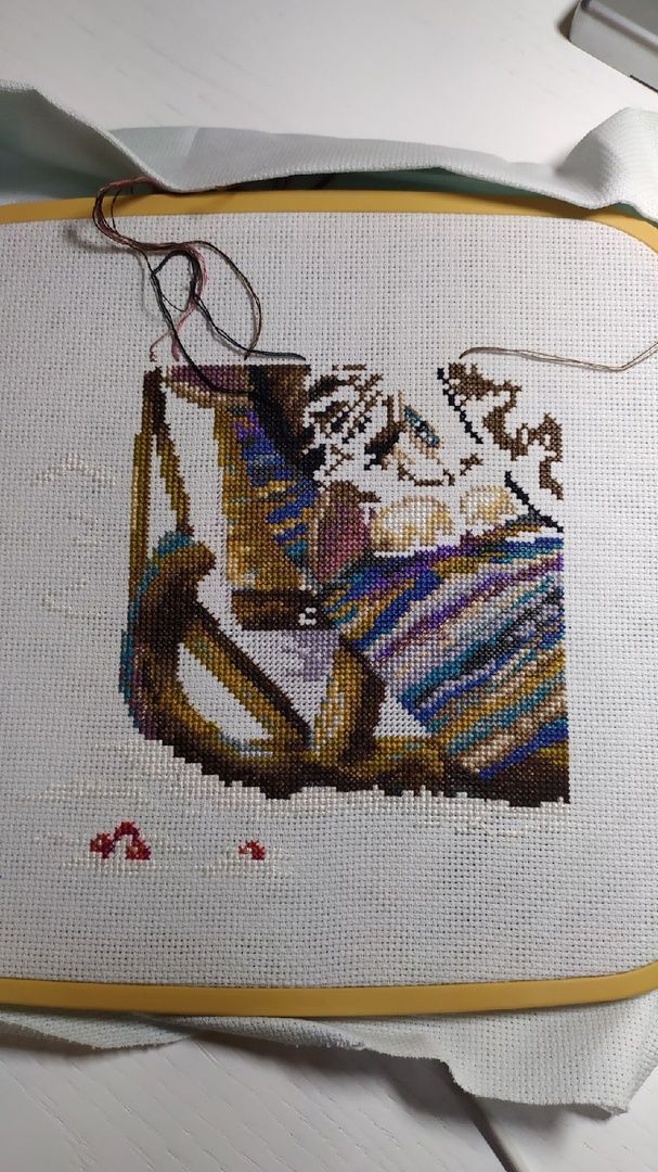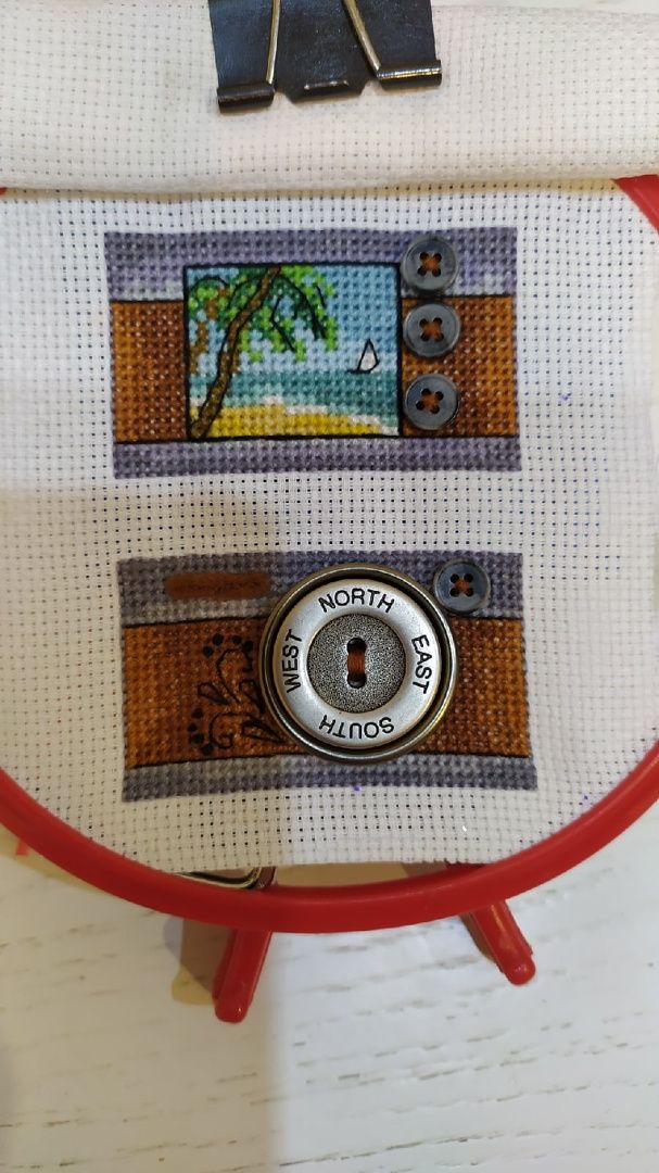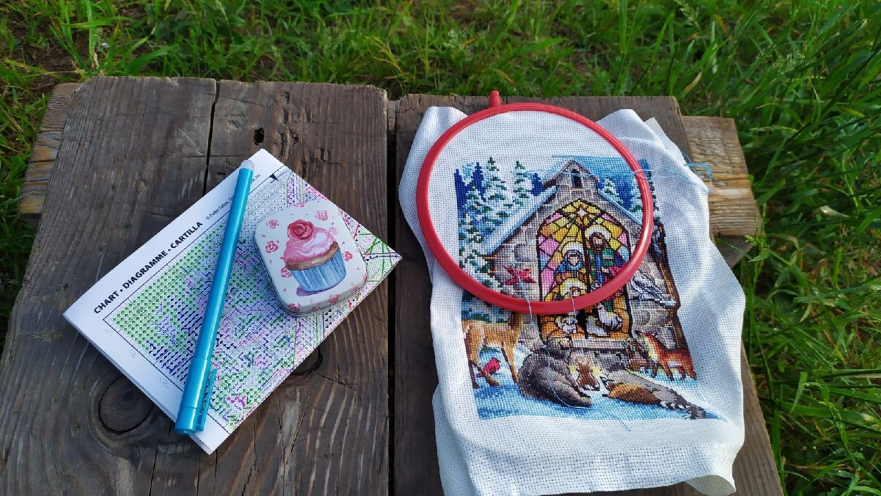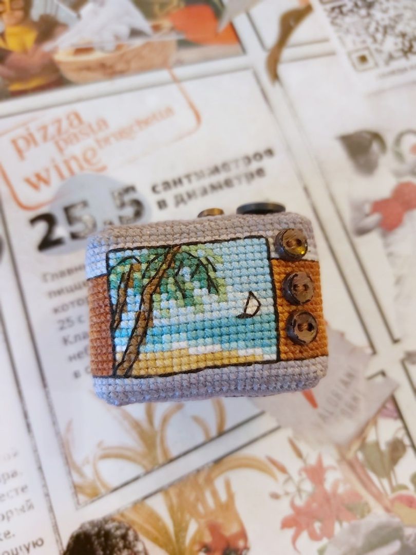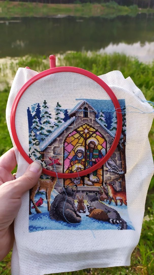 1 июля 2022 Всем привеееет!!! Ну наконец то я нашла время для отчета и поверьте показать есть что. Тянуть не будем начнем! Текущие процессы изрядно подросли: Букет гортензии Было. Стало. Процесс и сам результат один сплошной восторг, ну вы и сами всё видите. Отшито три листа( всего их 9). Бегло пробежалась по трем следующим листам и вроде как вышиваться должно легко, много участков листвы зашивается одним цветом. Смотря на уже отшитый фон поняла, что идея шить его крестом в 1 нить была отличной. На фоне него вазон фактурно выделяется и смотрится здорово. Уютная зима от мережки. Шикарный процесс, просто балдею от него. тоже отшито 3 листа. Было. Стало. Не поверите, но даже уделила время зимнему процессу. Вышила ещё одну игрушку от дим, правда она ещё без бэка и всяких украшательств, но всё же. Было. Стало. А теперь финиш!!! Рождество от дим! Было. Стало. Была у меня идея икс закончить его в июне и вот так таская то на природу, то на работу, шаг за шагом был завершен. Сын у меня уже третий год ходит в секцию дзюдо и в этом году практический весь летний период тренировочный процесс проходит в лесу, но а я соответственно зря времени не теряла и параллельно наслаждалась то природой, то пением птиц, то кваканьем лягушек и конечно любимым хобби. С нового года по рекомендации тренера сын переходит уже в профессиональную группу, чему мы конечно очень рады, но а пока идёт серьезная подготовка на выносливость, на преодоление страхов и по моему он удачно с этим справляется. В этом же лесу есть веревочный парк и вот из всей группы он только один согласился идти по самому сложному маршруту. Забегая вперед надо отметить, что это достаточная приличная высота, все конструкции при ветре сильно качаются, да и особого инструктажа никто не поводил, но он справился. Здесь же в лесу два больших озера и заключительным этапом было перелёт нам озёрами так называемый зиплайн- спуск по стальному канату с отрывом от земли, по воздуху. Не обошлось и без нового процесса! Как только увидела анонс, тут же побежала за схемкой и вышила за два вечера. Как то был опыт в вышивке замечательного чемоданчика от Ольги Петренко и мне давно хотелось и мечталось вышить что то подобное и вот оно!!!! Обратите внимание даже цветовая гамма совпадает. И да, у меня же есть вышитый лисёнок - путешественник, отличный будет тандем - подумала я! Камера- фотоаппарат путешественника по схеме Ольги Петренко. Вот что должно было получиться. А теперь мой вариант. Эти два фото не в гаечку, просто примерка всех возможных пуговиц. Вот вроде мелочь, но в моём случае играло роль всё и сочетания пуговиц по цвету вышивки и нужному размеру, как пуговицу лучше пришить крест накрест или по прямой и даже тактильно ли приятно на эти самые кнопочки нажимать, вот так заморочилась и черные гладенькие пуговки победили. Ну и сборка. О процессе: вышивается на аиде 16, верхняя и нижняя часть дополнительно проклеивается дублерином для поддержания нужной формы. 16 цветов дмс, один из них блэнд. Нужен небольшой кусочек коричневого фетра и 8 пуговиц. Вышивается и собирается очень легко, самым сложным для меня конечно был выбор нужной фурнитуры. Перемерила все виды пуговок какие только были, но по итогу вот что получилось. Сама камера состоит из двух пуговиц с бортиками вставленные одна в другую, за счёт этого есть нужный объем и с боку кажется, ч