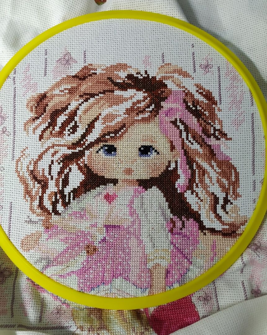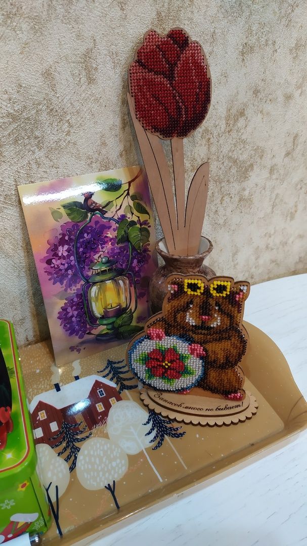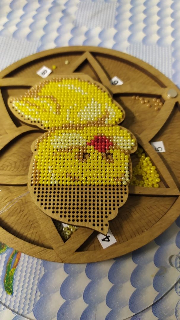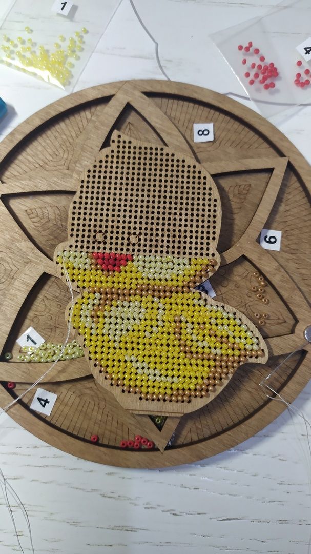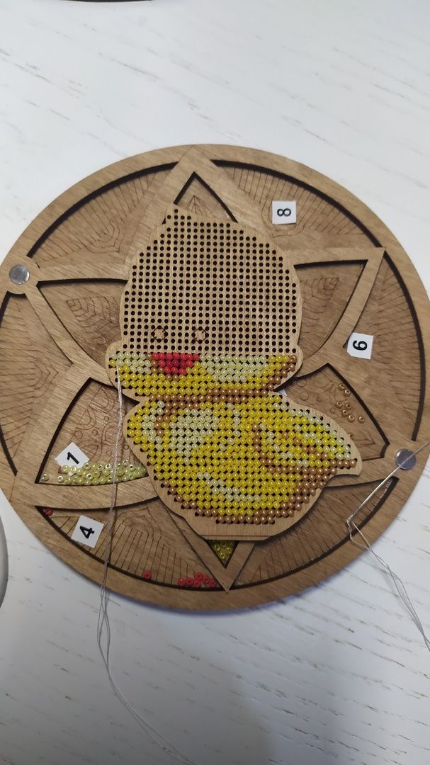 19 апреля 2023 Девочки всем доброй ночи! Пришла с обещанным отчетом, если конечно это еще кому то интересно. И так начнём с финишей. Куклы от фирмы Овен. Ариша. Было. Стало. Даша. Было. Стало. Ну в общем куколки оформлены и уже подарены двум девочкам двойняшкам ( детки двоюродной сестренки). Куколки удивительно на них похожи. Оформление подбирала по желанию хозяйки. О наборах только положительные эмоции, ниток осталось очень много. Бэк в две нити фона у куклы Даши не сказала бы что был приятным, но долго не могла на него настроиться. Рада, что наконец то их довела до ума. Ангел Терезы когут. Было. Стало. Очень старалась отшить его к пасхе, но не смогла, ровно недельки не хватило и здоровье чуток подводило. Когда его начинала, сомневалась, раздумывала, смущала пятнистость и резкие переходы лица, сама по себе разработка не из легких, Одиночка, одиночку погоняет, некоторые цвета между собой по тону почти не различимы, в общем чем то напоминает Тэю, даже значки те же. Но когда из непонятных крестиков начинает вырисовываться отшитый участок, то понимаешь, что тут каждый крестик на своём месте и эти на первый взгляд грубые переходы чем то напоминают мозайку. Шить конечно надо сосредоточенно и внимательно, но это того стоит. Я еще пришла к выводу, что тут нужна грамотная организация, цветов вроде не много думала буду шить с бобинок, но нет!!! Это очень тормозило процесс. Сперва в ключе ищешь значок, и смотришь номер нитки, потом ищешь эту бобику их вроде не много, 36 всего, но есть похожие значки, спутать легко и все это отнимает кучу времени. Перевесила ниточки, сделала цифровой поиск и дело пошло, жаль что сразу так не сделала, а всё почему?- Банально Лень!!! А когда, что называется приспичило сделала это за 20 минут! Теперь буду умнее, ценить своё время в конце концов и удобная грамотная организация ещё никому не вредила. Для себя любимой! Тюльпанчик- отдыхалочка от Волшебной страны. Заготовка от Волшебного края, бисер Preciosa, оборотная сторона прикрыта фетром. Сразу говорю шила не по ключу. В оригинале он жёлтый. В дальнейшем такой вариант ( открыточка+ цветочек) хорошо подойдет для мини подарочка- призентика коллеге или подруге к примеру, да в принципе кому угодно. Как считаете? Вдохновилась цветочками на клумбе и продолжила наращивать букет. Только сегодня из под иголочки- процесс одного дня Нарцисс от Волшебной страны. Бисер Preciosa, заготовка от Волшебного края. Да и забыла написать, что оба цветочка обработаны морилкой фирмы TURY цвет орех. Что то подсела я так знатно на бисер, как бы совсем на Баттерфляй не перейти. Милейший цып по оригинальному набору от Волшебной страны. А как отлично он вписался под мою новую скатерть. Ну и гвоздь программы моя помощница хома, хранительница моих рукодельных запасов и мисс позитивность!!! Хома вышита по схеме фирмы VERENA, бисер Preciosa, кое что заменила на свой вкус, цвет очков к примеру. Заготовку покупала у волшебного края. В оригинале должно отшиваться обе стороны, но я решила что на заднюю часть мало кто обращает внимание, хотя попка у неё клевая. Просто стало жалко бисера и лень было заморачиваться, может как нибудь ещё попробую но на маленькой игрушечке. Отличное соседство с тюльпанчиком. Ну и в завершении просто финальное фото пасхального - топпера на домашнем куличе, так сказать для истории. Ну вот теперь вроде всё!!! Bogdan, Полли, ол