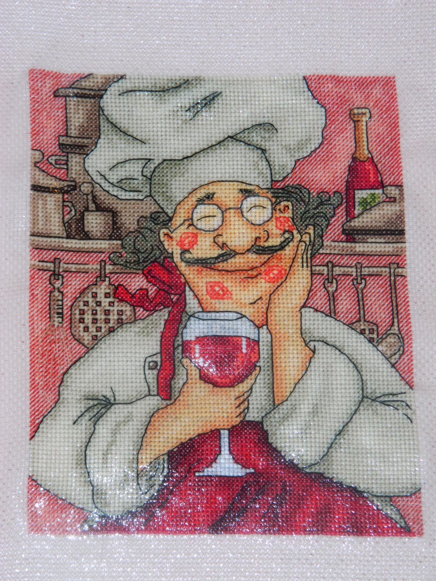 19 апреля 2017 Ну вот наконец принесла вам моего "Зацелованного повара" Бэк так вроде не сложный, но очень долго пришлось повозиться с венчиком и очками. Один глаз кривой косой получился, так и не смогла выравнить. С венчиком вообще беда! Его у меня еле видно, тоже несуразный получился. По схеме надо его шить в два сложения, но после всех проб и распусканий всё же вышила в одну нить. Форма у него тоже вся кривая. Решила пусть чуток полежит, может будет ещё настрой и перед оформлением переделаю. Но самый сюрприз меня ожидал во время стирки. Как только канва попала под струю воды тут же поплыла, причём в прямом смысле слова. Вся ванна была в краске, надо было вам сфоткать, но в тот момент об этом даже не подумала, переживала за вышивку. Процесс стирки был обычным, всё как всегда, нитки тут тоже не причём. На вид канва была обычной, ничего как говорится не предвещало. Хорошо хоть в картине полная зашивка фона, а то не красиво бы получилась. Пробовала сфотографировать, не получается передать оттенок после стирки. Но а в целом работой и процессом довольна. Galagenka, marusya64, Фро-J и 13 других сказали спасибо Поделиться сообщением Ссылка на сообщение