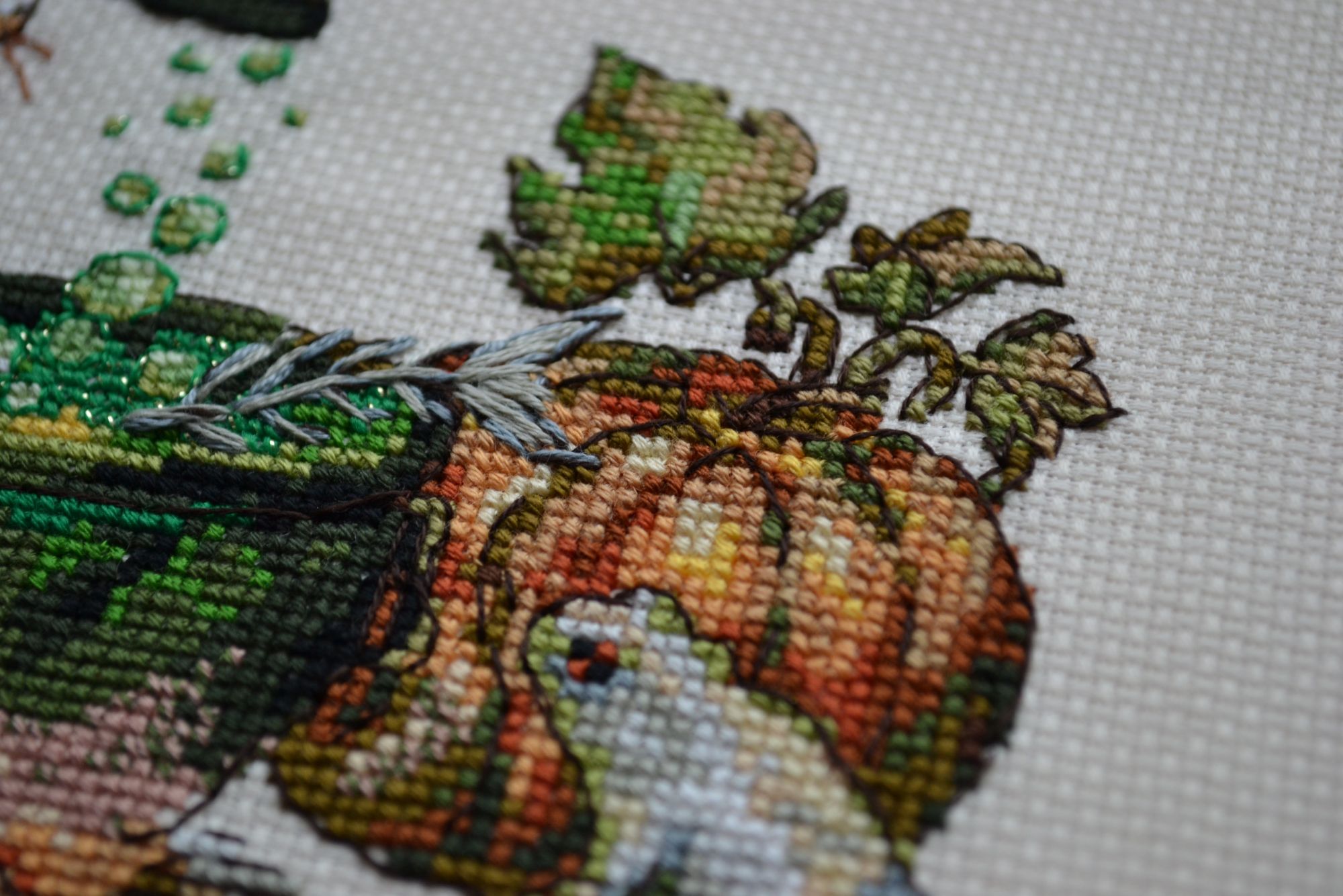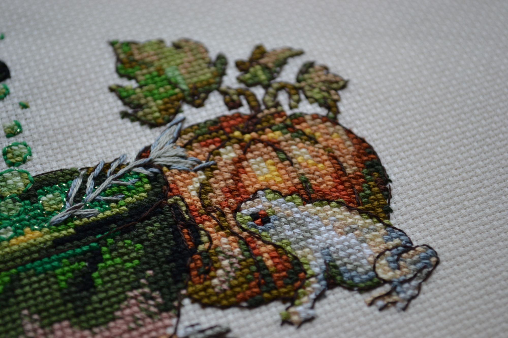 26 октября 2017 Всем привет! Очень я старалась немного наверстать упущенное и повышивать побольше, но на выходных, например, были сплошные прогулы, о чём будет ниже. Скрытый текст Ещё меня срубило какое-то крайне противное и активное ОРЗ, которое не давало (и не даёт, чтоб ему!) заниматься ничем вообще: обморочное состояние в течение уже недели (как раз в прошлый четверг заболела), нереальный кашель, насморк, все «прелести» в виде острого тонзиллита и синусита. И, естественно, ужасная головная боль от всего вышеописанного. А вчера случилось вообще безобразие – пропали обоняние и вкус. И даже хуже – вкус местами исказился. Как же я это терпеть не могу. Зато диета отлично прокатывает: овсянка на завтрак, обед и ужин с той лишь разницей, что утром сладкая. Но меня так просто не победить! Впереди каникулы, и уже осознание этого факта настраивает на позитив. (Дети отправятся на неделю к бабушке). А пока всё же о делах вышивальных. Тигр / Золотое Руно Наконец удалось закончить первую четверть работы. Долго лежал тигрик без движения, теперь взяла его в качестве кухонного процесса, и иногда получается посидеть немного с ним. В других местах шить проблематично, так как надо тут же зачёркивать на схеме отшитое, иначе труба. Но начну вторую четверть и буду с фоном-расслабоном чередовать. Le Charabosse / Nimue Кошечку получилось завершить к дате Х. Шила её две с половиной недели. Жаль только, что оформить уже не успеваю, думаю воспользоваться услугами багетки всё же. Без бэка: Результат (на самом деле цветовая гамма теплее): Подробности: Очень много времени промучилась с бэком. Он тут несчётный, в середину крестиков и мой «любимый» вариант – чёрным по чёрному, коричневым по коричневому… Но результат так умиляет, что, конечно, бэк сразу забывается. Жаль, что очень пасмурно сегодня, все фото мрачноваты, но уж очень хотелось показать, не откладывая отчёт. Начала 20-го очередной внеплановый проект. Там буквально первые крестики, чтобы попасть в нужный день и подкрепить этим загаданное желание. Так что об этом подробнее в следующий раз, наверное. А ещё получила сегодня «конфетку» от Танюши @Galadriel. Ещё раз большое спасибо! Уже залезла внутрь и всё рассмотрела – страшно захотелось тут же начать! Я даже приложила обложку к стеночке, куда обычно мы вешаем новогодние веночки… Будет смотреться сногсшибательно! Так что я близка к тому, чтобы начать вышивать эту прелесть. Тем более, что там замечательная для моих глаз схема (все значки чётко дифференцируются) и нормальный дырчатый органайзер для ниток (новую намотку не люблю совершенно). И про вышивальные прогулы Амели 21-го ездила на очередные соревнования, откуда привезла уже первое место! А мы в это время отправились с любимым в лес по грибы-ягоды. Из грибов нашли только пять шампиньонов, из ягод – набрали шиповника, также нарвали омелы, чтобы под ней целоваться , а ещё полетали. Всем уютного осеннего настроения. titania, apanjul, Galagenka и 43 других сказали спасибо Поделиться сообщением Ссылка на сообщение