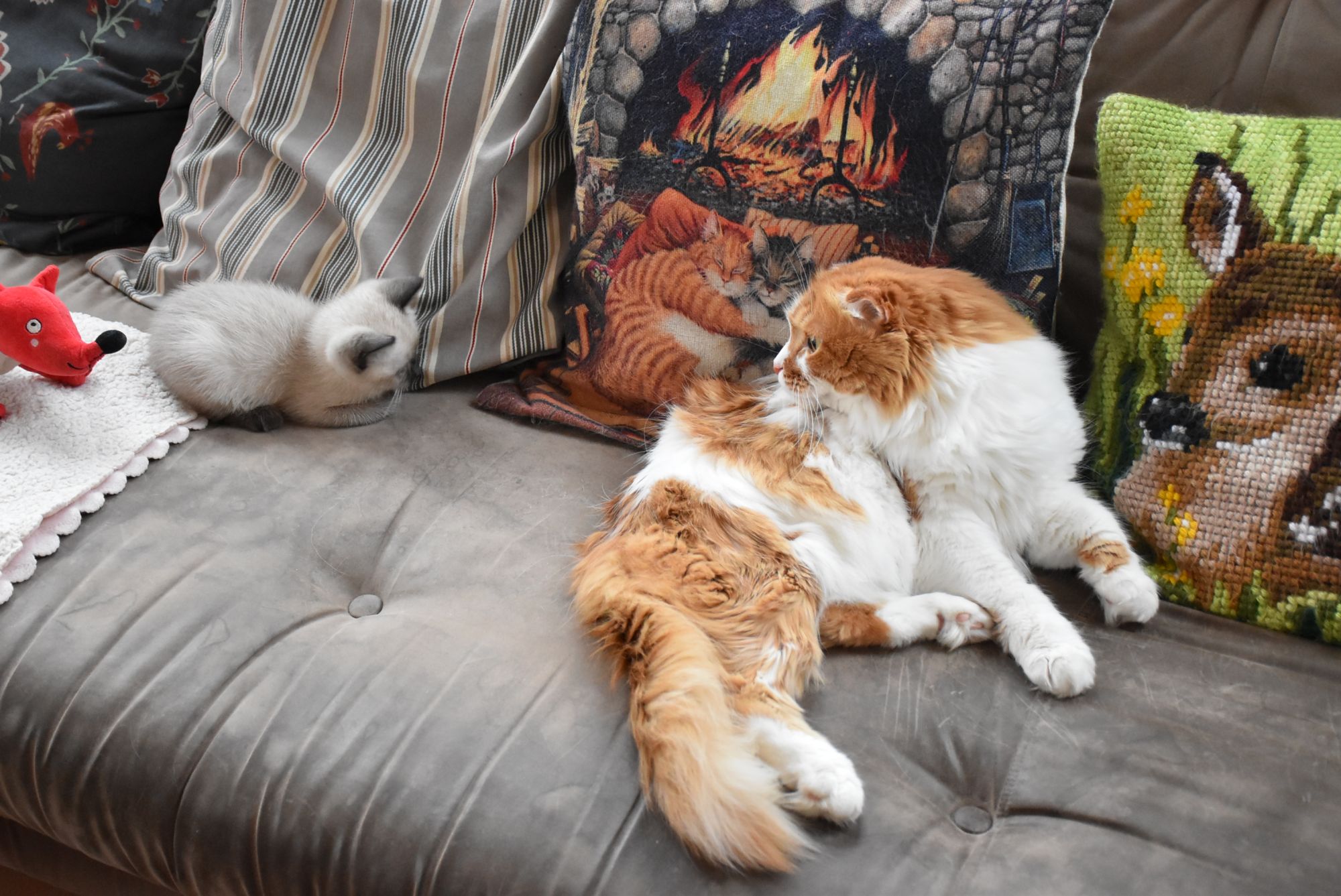 7 января 2022 Всем привет! Попробую отчёты написать-загрузить. Первая попытка внезапно закончилась фиаско, дубль два. Сначала про котикоффф Знакомьтесь, это Тойя. Родился он 17 ноября, а 20-го декабря уже был у нас дома. Вот первые фото, он совсем крошка: Таких мелких без мамки я ещё не взращивала Он не умел толком ни есть, ни лакать. Несколько раз пытался найти сиську у Мии (и даже успешно, чем совсем не радовал собаку ) Но теперь-то он уже гроза дома Проказничает ужасно, всё царапает и грызёт - игрушки, руки, Мию и Шерлока, вышивальные принадлежности, провода и т.д. Поэтому за ним нужен постоянный присмотр. Они спелись с Мией на фоне игрищ, иногда их поддерживает Шерлок, Моня считает его своим щенком (вылизывает и всё такое, очень навязчиво, надо отметить), Ватсон с Токио его игнорят, а попытки поиграть пресекают лапой по моське Когда конкретно набесится (боже, сколько в нём сил и энергии!), приходит спать ко мне на колени, если я сижу вышиваю. Другие котики тоже отлично себя чувствуют! VitaVivien, Lenara, Татуся и 32 других сказали спасибо Поделиться сообщением Ссылка на сообщение