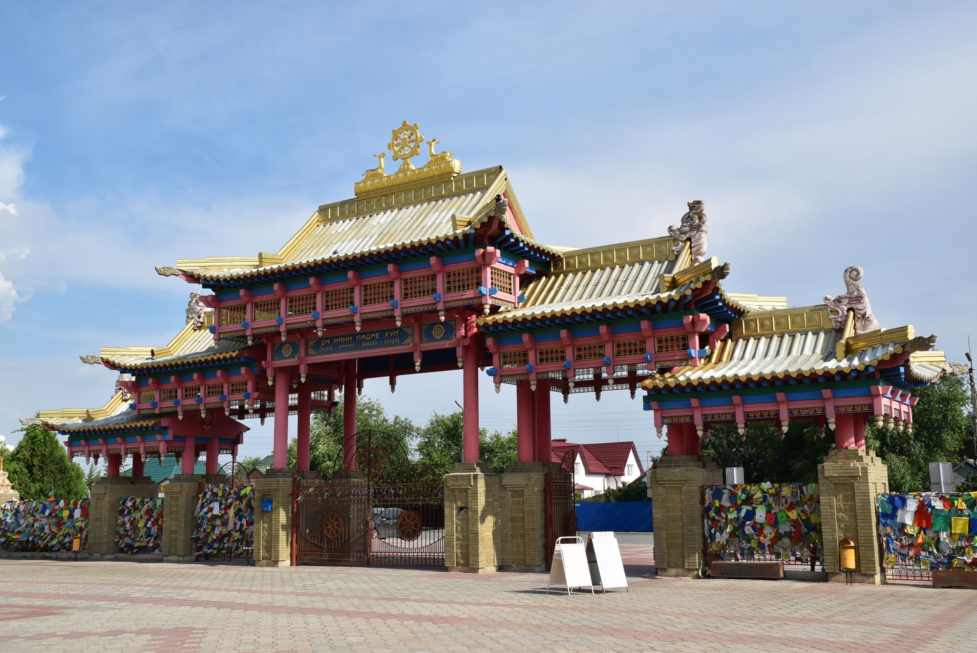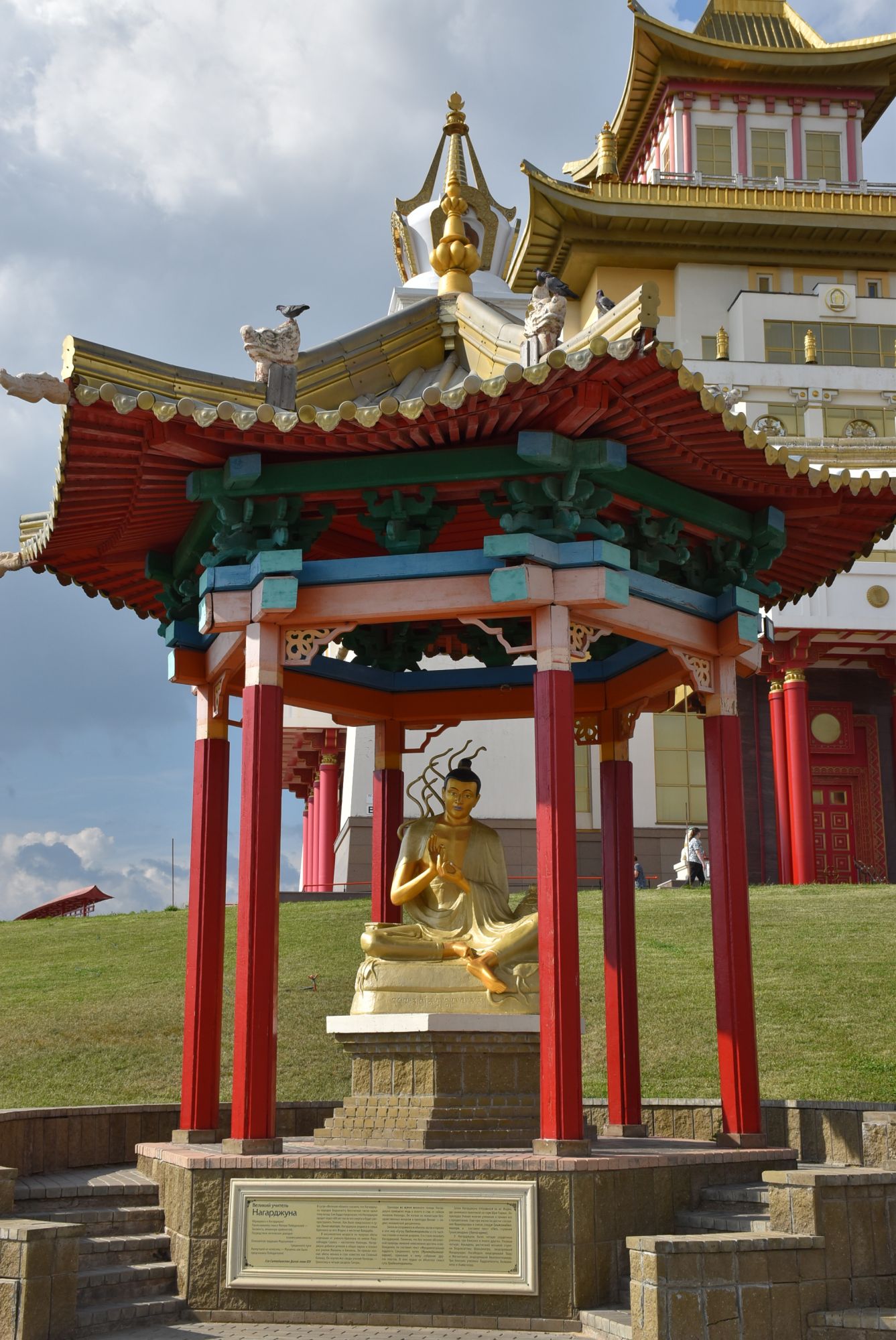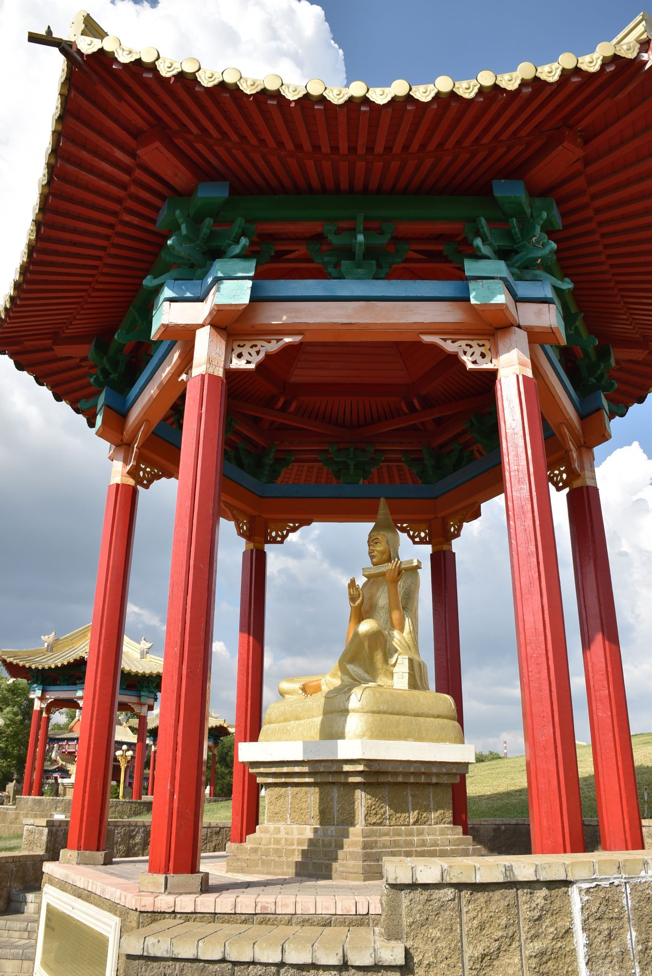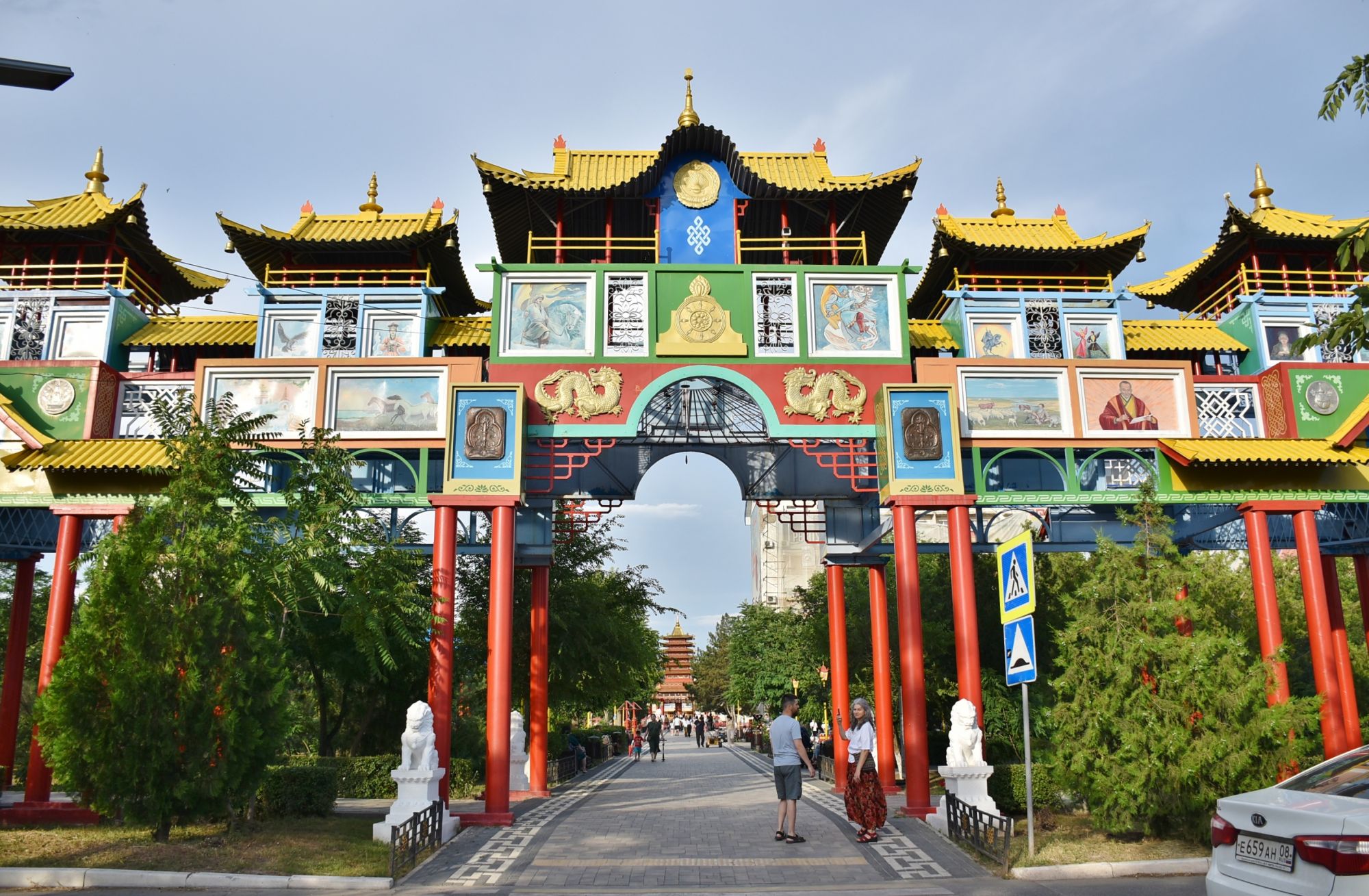24 июня 2023 Рядом с филармонией находится очаровательная скульптура с изображением героев Восточного календаря. Мне она очень понравилась Золотые ворота Алтн Босх Изящное сооружение, возведенное в конце прошлого столетия, по праву входит в число знаковых достопримечательностей Элисты. Золоченый свод 15-метровой арки опирается на ярко-красные колонны. Фронтоны памятника зодчества, декорированы в буддийском стиле. Их украшают 28 колоритных картин, повествующих о важнейших этапах истории Калмыкии. Шедевр архитектуры имеет еще и огромное сакральное значение. Проходя под сводами арки, человек духовно очищается, обретает душевное равновесие. Если в этот момент звенят колокольчики, можно смело загадывать желание. Буддисты верят, что в этом случае оно сбудется обязательно. Пагода Семи Дней Прекрасная пагода является одной из визитных карточек современной Элисты. Уникальное сооружение, возведенное под руководством лам из индийской обители Гьдмед, возвышается в центре гранитной площадки, окруженной чашей фонтана. Пятнадцатиметровое здание имеет семь ярусов колоритных буддийских куполов, декорированных скульптурами и позолотой. Основной свод опирается на 16 спаренных колонн. Под ним установлен молитвенный барабан, покрытый позолотой. В основание кюрде замурованы свитки с текстом более 30 млн мантр. С наступлением темноты, когда включается подсветка, пагода выглядит особенно эффектно. Фонтан «Три лотоса» Подлинным украшением площади Ленина и популярным местом для свиданий является замечательный фонтан, открытый в 2006 г. Уникальная композиция состоит из чаши, облицованной полированным гранитом и аристократичным мрамором, а также оригинальной скульптурной группой. Из центра бассейна как бы прорастают три лотоса, к подножию которых гейзеры извергают воду. Стебли и листики растений выполнены из нержавеющей стали, а раскрывшиеся соцветия покрыты позолотой. Было бы интересно посмотреть на него в действии, но когда мы там были, фонтан не работал. Скульптура «Белый старец» Скульптура представляет собой стоящую в полный рост фигуру старца с посохом в руках. На самом верху посоха находится голова дракона, который издавна считается повелителем водной стихии. Рядом расположились традиционные обитатели калмыцких степей — волк, сайгак, орел. Одна рука старца лежит на голове волка (символ неподкупности). Вся скульптурная композиция располагается на высоком постаменте. На его передней части выгравирован традиционный калмыцкий орнамент, символизирующий бесконечность Вселенной. Скульптура носит на себе религиозный оттенок и является предметом поклонения калмыцких буддистов. За скульптурой находится парк "Дружба", но туда мы уже не пошли. По отзывам и внешнему виду, особо делать там нечего... А у нас были ещё обязательные пункты плана, и мы поехали в сторону Города шахмат. Мимо собора Кирилла и Мефодия, строительство которого ещё не завершено. Но, судя по тому, что можно видеть сейчас, Кирилло-Мефодиевский храмовый комплекс будет очень красивым. В него, кроме собора, также будут включены трёхъярусная колокольня и Часовня Сергия Радонежского. Ступа Просветления Удивительный храм Монлам Тамчед Друпа, является не только сакральным местом, но и входит в число главных достопримечательностей Элисты. Его название переводится как «Исполняющ