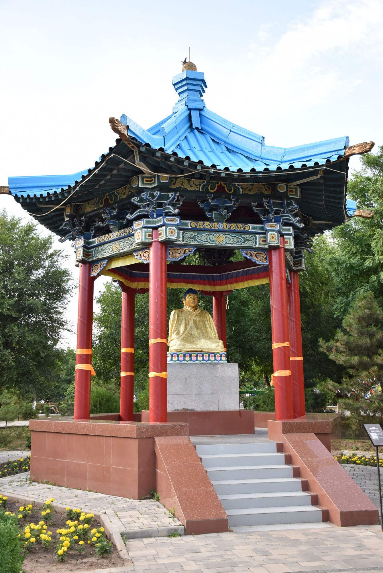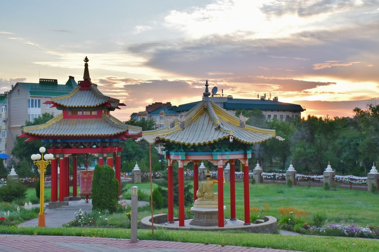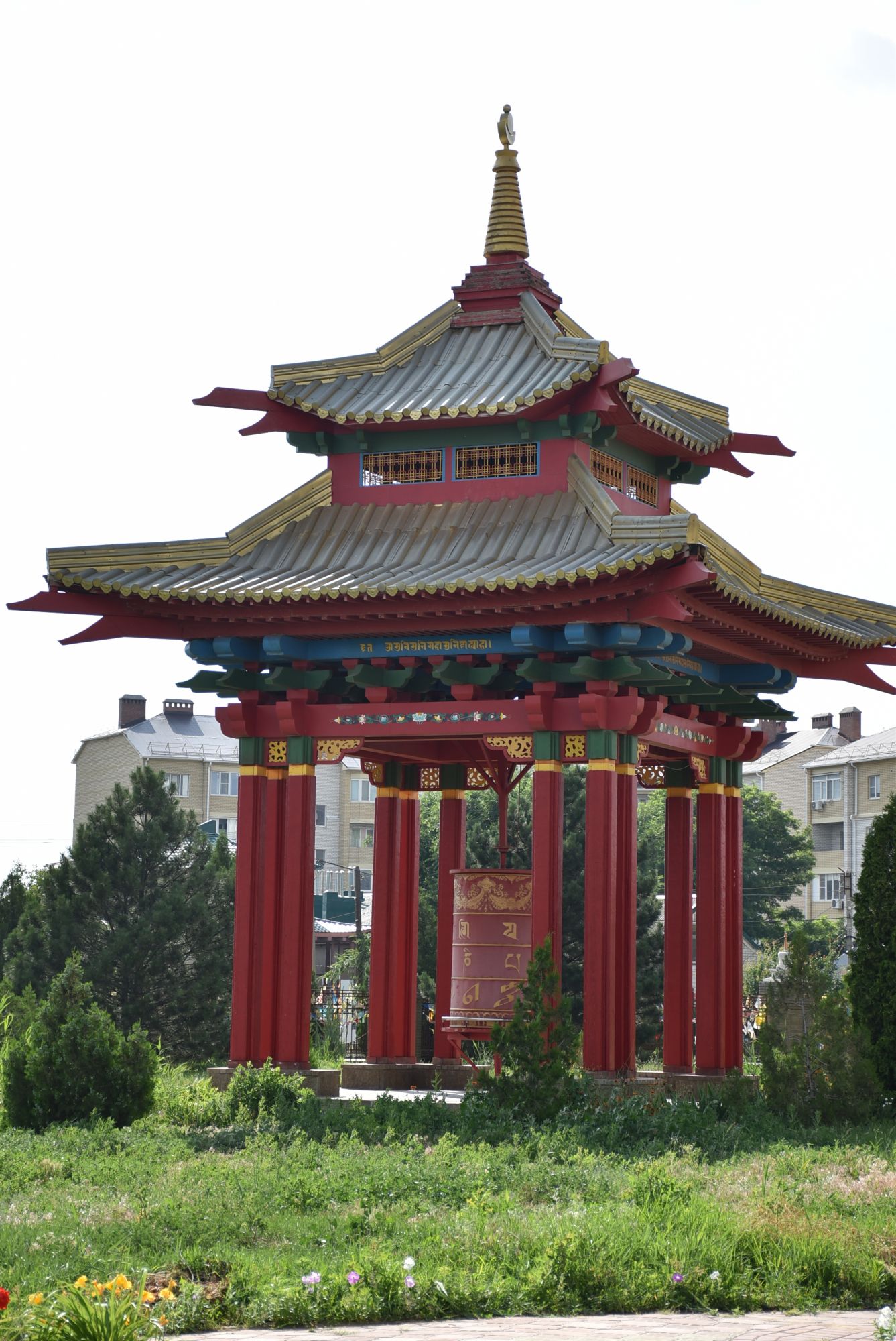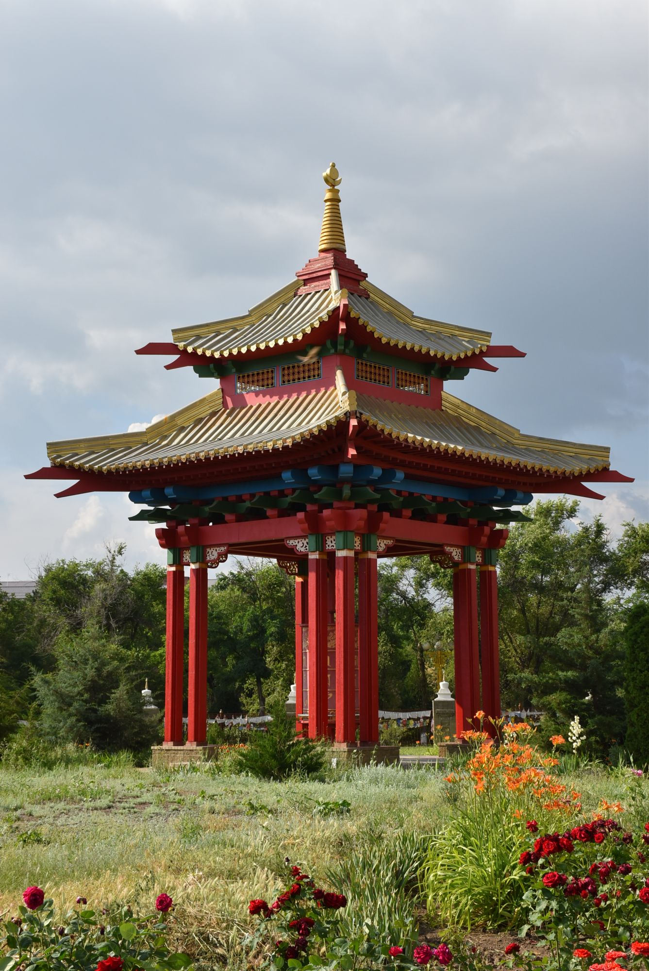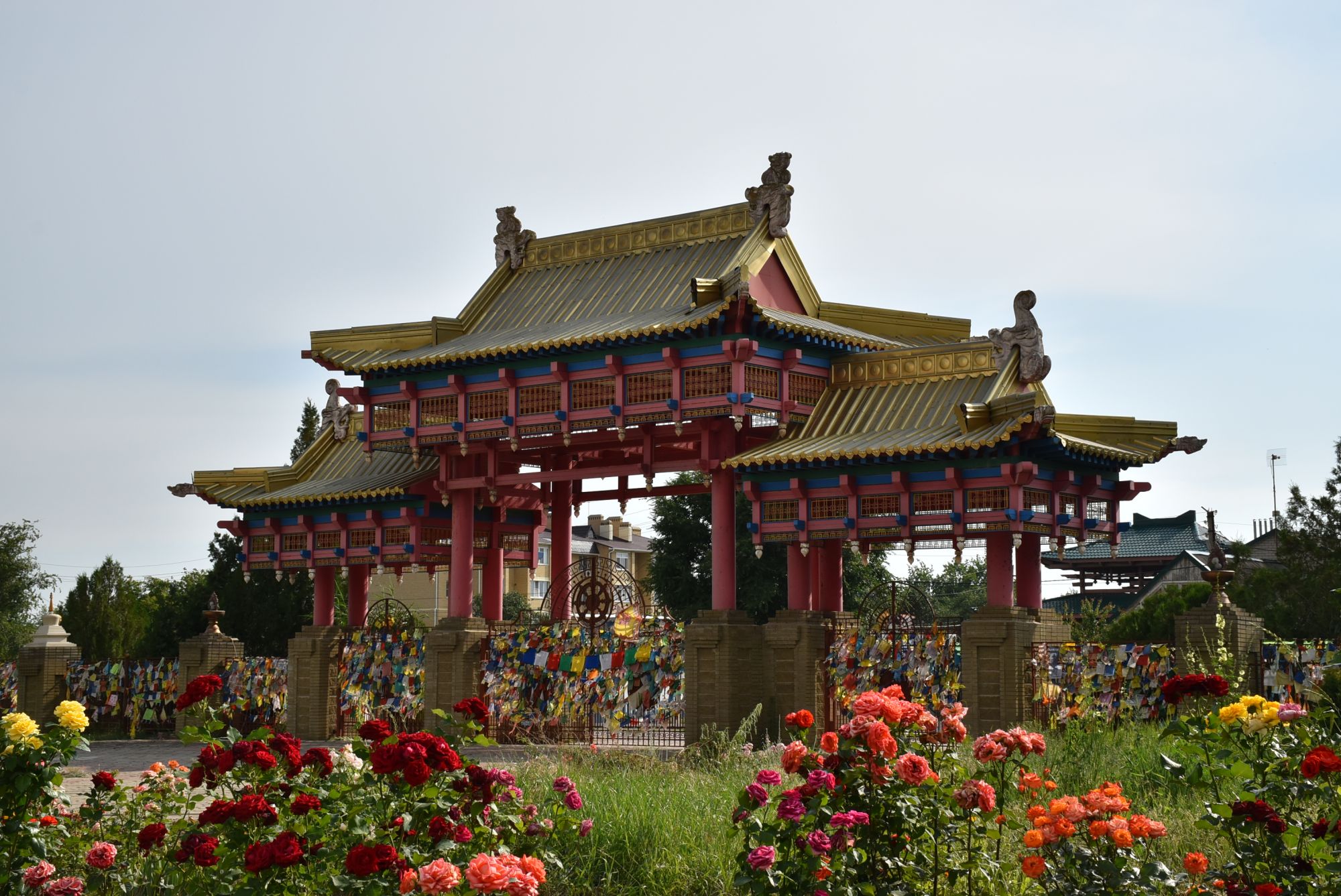 24 июня 2023 Рядом с филармонией находится очаровательная скульптура с изображением героев Восточного календаря. Мне она очень понравилась Золотые ворота Алтн Босх Изящное сооружение, возведенное в конце прошлого столетия, по праву входит в число знаковых достопримечательностей Элисты. Золоченый свод 15-метровой арки опирается на ярко-красные колонны. Фронтоны памятника зодчества, декорированы в буддийском стиле. Их украшают 28 колоритных картин, повествующих о важнейших этапах истории Калмыкии. Шедевр архитектуры имеет еще и огромное сакральное значение. Проходя под сводами арки, человек духовно очищается, обретает душевное равновесие. Если в этот момент звенят колокольчики, можно смело загадывать желание. Буддисты верят, что в этом случае оно сбудется обязательно. Пагода Семи Дней Прекрасная пагода является одной из визитных карточек современной Элисты. Уникальное сооружение, возведенное под руководством лам из индийской обители Гьдмед, возвышается в центре гранитной площадки, окруженной чашей фонтана. Пятнадцатиметровое здание имеет семь ярусов колоритных буддийских куполов, декорированных скульптурами и позолотой. Основной свод опирается на 16 спаренных колонн. Под ним установлен молитвенный барабан, покрытый позолотой. В основание кюрде замурованы свитки с текстом более 30 млн мантр. С наступлением темноты, когда включается подсветка, пагода выглядит особенно эффектно. Фонтан «Три лотоса» Подлинным украшением площади Ленина и популярным местом для свиданий является замечательный фонтан, открытый в 2006 г. Уникальная композиция состоит из чаши, облицованной полированным гранитом и аристократичным мрамором, а также оригинальной скульптурной группой. Из центра бассейна как бы прорастают три лотоса, к подножию которых гейзеры извергают воду. Стебли и листики растений выполнены из нержавеющей стали, а раскрывшиеся соцветия покрыты позолотой. Было бы интересно посмотреть на него в действии, но когда мы там были, фонтан не работал. Скульптура «Белый старец» Скульптура представляет собой стоящую в полный рост фигуру старца с посохом в руках. На самом верху посоха находится голова дракона, который издавна считается повелителем водной стихии. Рядом расположились традиционные обитатели калмыцких степей — волк, сайгак, орел. Одна рука старца лежит на голове волка (символ неподкупности). Вся скульптурная композиция располагается на высоком постаменте. На его передней части выгравирован традиционный калмыцкий орнамент, символизирующий бесконечность Вселенной. Скульптура носит на себе религиозный оттенок и является предметом поклонения калмыцких буддистов. За скульптурой находится парк "Дружба", но туда мы уже не пошли. По отзывам и внешнему виду, особо делать там нечего... А у нас были ещё обязательные пункты плана, и мы поехали в сторону Города шахмат. Мимо собора Кирилла и Мефодия, строительство которого ещё не завершено. Но, судя по тому, что можно видеть сейчас, Кирилло-Мефодиевский храмовый комплекс будет очень красивым. В него, кроме собора, также будут включены трёхъярусная колокольня и Часовня Сергия Радонежского. Ступа Просветления Удивительный храм Монлам Тамчед Друпа, является не только сакральным местом, но и входит в число главных достопримечательностей Элисты. Его название переводится как «Исполняющ