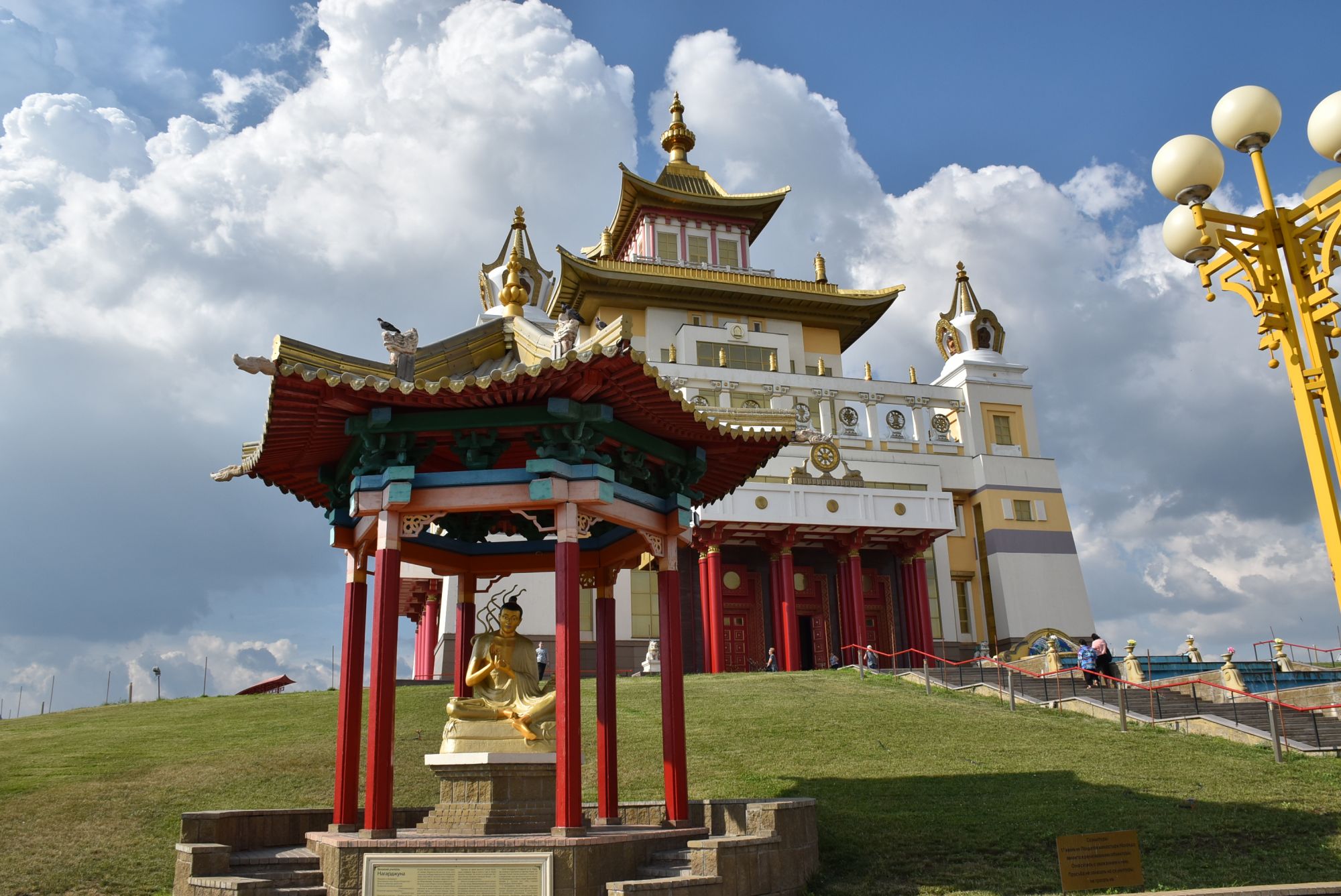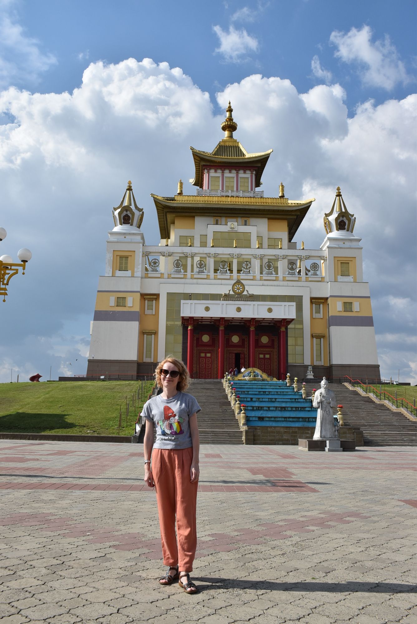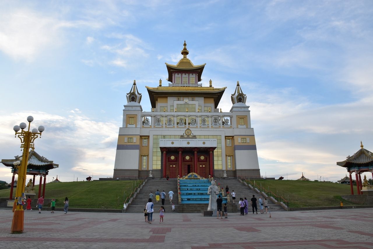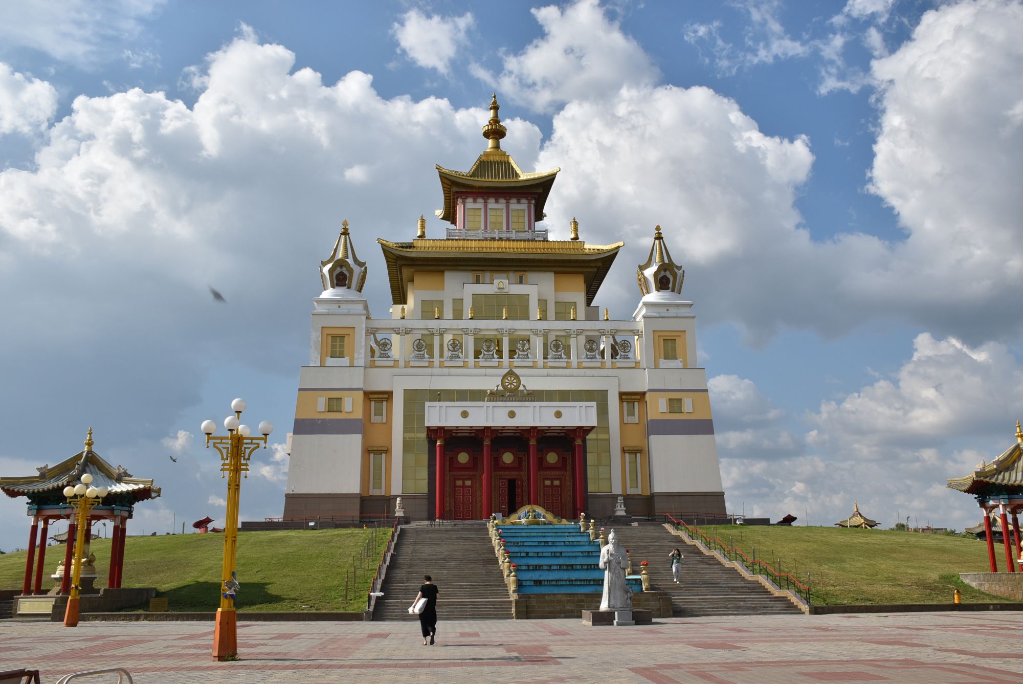 23 июня 2023 При въезде в Элисту сразу в глаза бросается Золотая обитель Будды Шакьямуни Мы Заехали в квартиру, и каково же было наше удивление, когда оказалось, что этот хурул виден с балкона, мы жили буквально в паре кварталов от него. (я для масштаба, кюрде тут есть огромные!) Он по праву считается главной достопримечательностью не только столицы Калмыкии, но и всей республики. Этот грандиозный комплекс входит в перечень «Россия — 10», десятку новых архитектурных шедевров нашей страны. Он действительно великолепен: огромное здание храма, крупнейшее в России и Европе, красивая ухоженная территория, множество статуй и монументов. Гостей встречают четверо ворот, направленных в разные стороны света, и главные из них — южные. Радуют глаз 17 ярких пагод с молитвенными барабанами, и 108 белоснежных ступ. Обойдя территорию по часовой стрелке, попадаем к центральному входу в храм. Здесь нас встречает длинная лестница вверх и скульптура Белого старца из калмыцкого эпоса. Внутреннее убранство хурула не менее примечательно - тут находится одна из самых крупных статуй Будды в России и Европе, ее высота 9 метров. А ещё мы успели попасть в небольшой музей при храме. Очень интересно, но фотографировать тоже нельзя, увы. На последнем фото обратите внимание на собаченьку, валяющуюся на газоне. Эта счастливая пёся покорила меня. Она с таким кайфом и радостью валялась и крутилась под струями поливалки, что невозможно было не улыбаться Мне это место очень понравилось. GreenTea, relax_cross_stitch, Ксен40 и 25 других сказали спасибо Поделиться сообщением Ссылка на сообщение