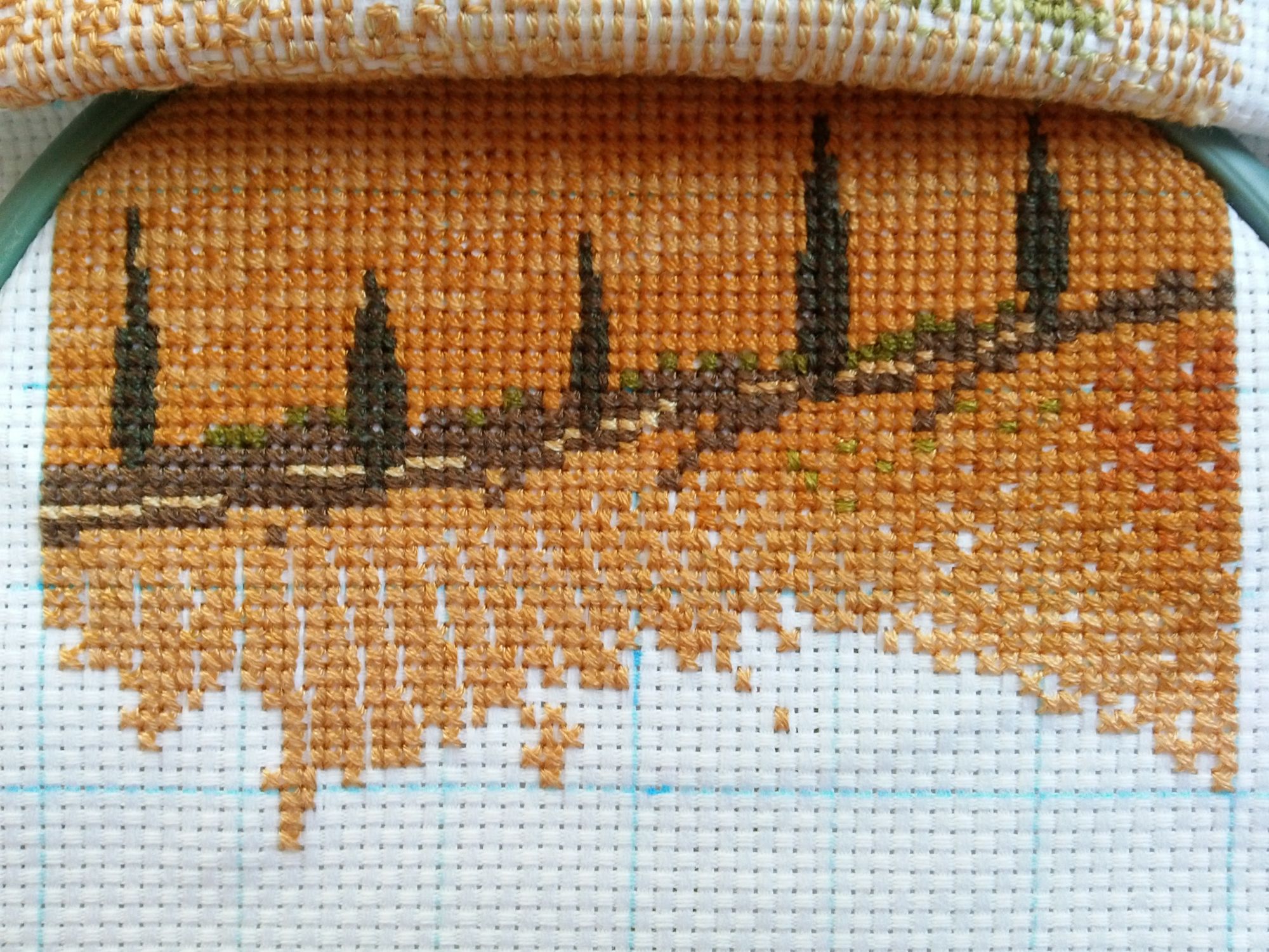 15 сентября 2016 Всем привет! У нас такая чудесная пора! Очень люблю это время года, и с середины сентября до середины октября – мой любимый осенний период! Наслаждаюсь погодой (днём +30, а ночью свежо и прохладно), ещё летним солнышком, но уже прозрачным воздухом и ярко-синим небом! А ещё мы открыли сезон любимого осеннего пирога со сливами! В общем, всех с осенью! И коротко о главном. My First Teddy / Vervaco Первый Кристюшин вышитый мишка готов! Вот всё же 18-ый каунт как-то не моё: шьёшь-шьёшь, а как будто на месте топчешься и при этом ещё глаза в кучу... Ну это ладно, результат-то мне безумно нравится! Мишка плюшевый и очень объёмный! Алфавит русский был предложен схемой, я его не меняла. С цифрами же просто измучилась! Распускала три раза!!! Потом уже плюнула и оставила, как есть. Медведик был со мной полтора месяца, но чистого времени на него ушло недели три. Вот такая изнанка (раньше вроде не показывала потайную сторону своих творений) И финальные фото: Тоскана / Heritage Снова переставила пяльцы. Только фото почему-то совсем неудачное получилось, но другого нет. Тут всё ровно и спокойно, очень нравится шить панельки именно из-за вот такого размеренного спуска вниз по канве, когда не приходится разбегаться далеко. Одиночек нет, только «шахматка» иногда утомляет немного, но в целом пока очень приятно шьётся. Начался сложный кусок: с 8-го по 10-й ряд можно немного попсиховать и поотчаиваться, но где наша не пропадала! И ещё нереально реальная красота. Пока это мой основной процесс, от Херитажа вообще сложно отрываться и переключаться на что-то другое А вот наткнулась на фотку из серии "моя семья и другие животные" Котэ ведёт себя странно. Видимо, подозревает неладное. Всем добра! apanjul, Ксен40, ирония и 34 других сказали спасибо Поделиться сообщением Ссылка на сообщение