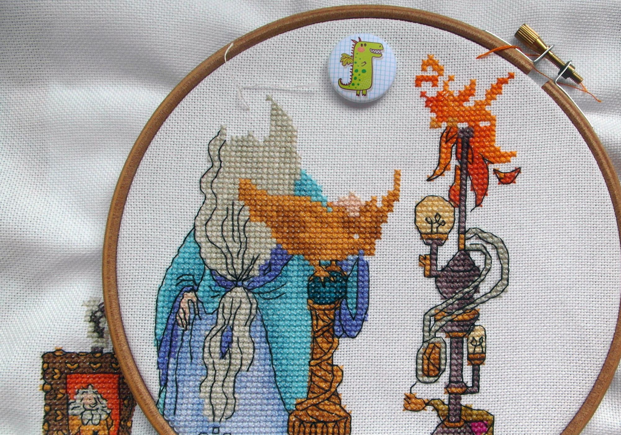 29 апреля 2017 Ахтунг! Несу +2 зеленых гаечки! Меня можно было бы упрекнуть в лени - чего так долго несла?! - и впрочем я сама себя не совсем одобряю... Но тут не она! Не только мой работун приложил свою когтистую лапу, но и то, что мне дико сложно и долго фотографии копать! Итак, как оно было. Песнь историческая многобукфенная У меня же ж сверхидея была отшить каждого гыпышника на канве разных цветов - так вот идея имела волне конкретное своё воплощение в стопке разномастной луганы. Я самоотверженно сливалась в пламенном экстазе с картой образцов равномерки и подбирала-подбирала-подбирааала. Это были те ещё шаманские пляски - то я ждала солнца в зените, то лампочки Ильича под напряжением. Какие-то ГыПэ товарищи сразу нашли свой цвет тряпочки, другие не очень, с 1 я до сих пор в раздумьях. Ну, креатив он покоя не даёт! Вот эти +2 зеленые гайки это результат цветопоиска. Я такая была в диком восторге от Бубльгума - так-то это Дамблдор, но у меня это Бубльгум (из книги Порри Гаттер). У него такая сумасшедшая мантия - каааакой цвет, какие закорюшечки... Ыыыы! И такой Бубль требовал какую-нибудь такую симпотную тканюшку. И я сразу к нему приписала 3835/4061 (бледно-абрикосовый). Я прямо попискивала от предвкушения. Но провидение жестоко и сурово сказало, что такой цвет сняли с производства. Я плакаль... А я ж уже настроилась. Поэтому взяла то, что вроде как близко - 3835/443 (бледно-розовый). Оно на самом деле нигде не близко. От слова совсем. Но это была безысходность. Этот бледно-розовый такой розовый, бледный, холодный и не симпотный. То есть совершенно не то, что хотелось. И я это поимала, когда складывала ткань в корзину. И когда жмакнула купить тоже понимала. И потом - я понимала, но держалась курса. Как отшился Драконтан я протянула дрожащую руку к Бублю. Рука чесалась, я вся подпрыгивала. Курс был на 3835/443 - так и начала. Но отшив кусочек я поняла (вот тут именно ПОНЯЛА), что цвет основы не подходит от того самого слова совсем... А рука-то чешется, и нитки все подобраны... В общем, у меня был кусочек 3835/101 (молочный), который в принципе не был приписан к ГыПышникам - он слишком похож для меня на 3835/7011 (серебристая луна, которая уже с Дракотаном)... А мне хотелось именно, чтобы были совершенно разные по цвету основы. И чтобы это было видно. А рука уже от чесотки отнимается. И усё готово. И суббота свободная на дворе! А как же розово-бледная канва? - спросил меня Жаб. А вот же у меня свежекупленный Ремус с Сириусом. 2 мужика на розовом - однозначно ДА! Жаб был удовлетворен, формальности были соблюдены. Я покорилась судьбе и взяла для Бубля молочную... Итак плюсик нумер раз - Бубльгум. Основа Zweigart 25 ct. Lugana 3835/101. Нитки - дикий ква-подбор. Дизайн нумер 2 по изображению Rosalia Radosti. У меня были порывы потоптаться Бублю по мантии - там бисерку накидать, металликом пройтись, блестяшек нашить... Но я сказала себе - Стопэ! Он же и так прекрасен. Юля, положи на место пакетик с паетками цвета термоядерной фуксии и иди вышивай по схеме. Единственное, что сделала - это так же, как и у Драко - изменила цвет румянца. Если Драко грозил диатез, то тут уже проблема куда более высокой социальной значимости - пьющий директор! Это ж кошмар. Потому просто румяный крепкий старикашка. Пьянству бой! По деталькам: Портрет - ыыы! Какой симпатичный дядька. Такая борода... Мантия - крышесносная. Я от цвета этого суперического вся слюнями изош
