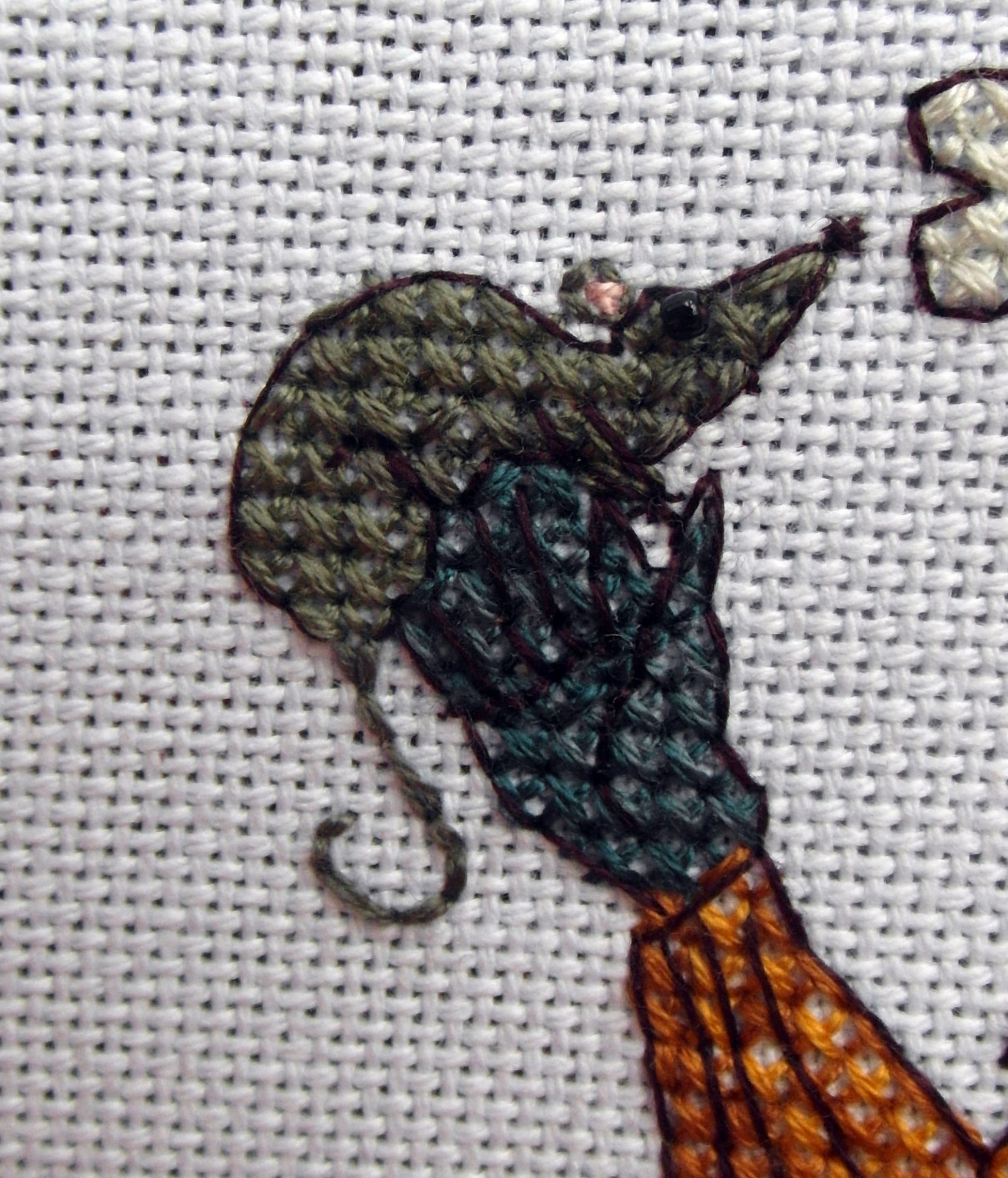 1 мая 2017 13 часа назад, Каори сказал: Спасибо, успокоила. Надеюсь кость изо рта ты вытащишь, а то неэстетично ))) Боюсь, что еду изо рта вытащить рука не поднялась Были у меня на этот счет метания, и я даже уже рукава засучила и поприкидывала... Голову надо было перерисовывать почти полностью - он же такой круглощёк, потому что жуёт. Плюс наклон головы - убираем кость и её положение не совсем оправданным получается. И я в целом всё это рисовала в нескольких вариантах... И со всем этим он выходил каким-то ненормальным (если можно, конечно, так про этот дизайн). И со ртом проблемсы... И я подумала - а кто я такая, чтобы еду (возможно, что последнюю) у ребятенка отнимать?! Да, и пока я колдовала - мне чо-то так эта ножка курья понравилась И честно говоря у меня противопоказаний к ней никогда не было, а топталась благодаря силе внушения - увидела, что девчонки просили Катю кость достать и меня забурлило. Вобщем я порешила, что ноге быть и пилу циркулярную отложила. Ой, я так довольна, что её оставила! Правда. Она клевая! Но я отняла у него всё же одну. Обжорство - верный путь к ожирению! Вот тут потопталась. Думала ему просто ладошку оставить. А потом меня осенило - а где Короста?! Рон не могёт быть без Коросты. И я нарисовала крысу... Уиии!!! Как я собой горжусь. Такая она офигенная вышла 1. По фото не видно, но в ней погибло 2 серых цвета - темнее и светлее. Брюшко потемнее, спинка посветлее. Теньс. 2. У неё есть когтики на лапке и носик. 3. Розовое ушко! 4. Глазик - черная бисеринка. Из смешного - я всё удивлялась, почему Рон без Коросты. Так вот я её отшила и наконец-то нашла! Она справа снизу на шапке - нууу, это ж догадаться надо! Не буду её вышивать - она у меня уже вон какая красавица есть! Ну, и ещё - потопташки поскромнее: 1. заменила темно-коричневые фрузелы на тарелочках на разноцветный мелкий бисер. 2. Выкинула розовую шляпу - не хочу её. Тем более, что она очень слабо на шляпу похожа. 3. Заменила цвет румянца на щечках - было слишком термоядерно. В гаечку Немножко подрос котэ. Тортик и вишню до и после переставления пялец - это я значки перепутала - крестик и жирный крестик. Когда я-ленища перерисовывала значки на органайзер я так и нарисовала - крестик и крестик. Мысля о том, что голубой и вишня не пара проскользнула... Но я подумала, что это отблеск такое. Ага. А в прослойке - это крем. Логика - страшная сила Хорошо, что я включилась на 2-ой вишенке. Ой, покатушки Ох, это я тут вытворяю, потому что отпуск. Мне бы надо работу искать, а я прокрастинирую вышивкой... Так что даже не знаю, когда у меня ещё время найдется - отпуск закончился irchick2308, Catopuma, Aleksacha и 7 других сказали спасибо Поделиться сообщением Ссылка на сообщение