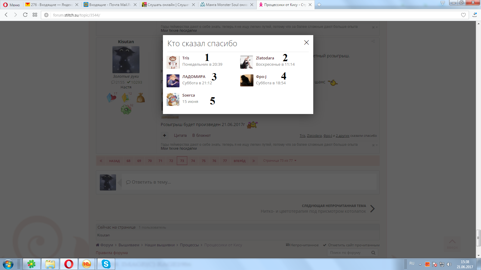 21 июня 2017 Вот я дурочка Совсем вылетело из головы про конфетку и так, конфетка, Панна - Охотник. Вышивка гладью И желающих было аж целых пятеро: . И победитель ..... Номер 3... И это у нас @ЛАДОМИРА Поздравляю с победой, жду адрес в личку Конфетку отправлю в субботу Графиня, Хозяйка смешных зверей, kiliska и 12 других сказали спасибо Поделиться сообщением Ссылка на сообщение