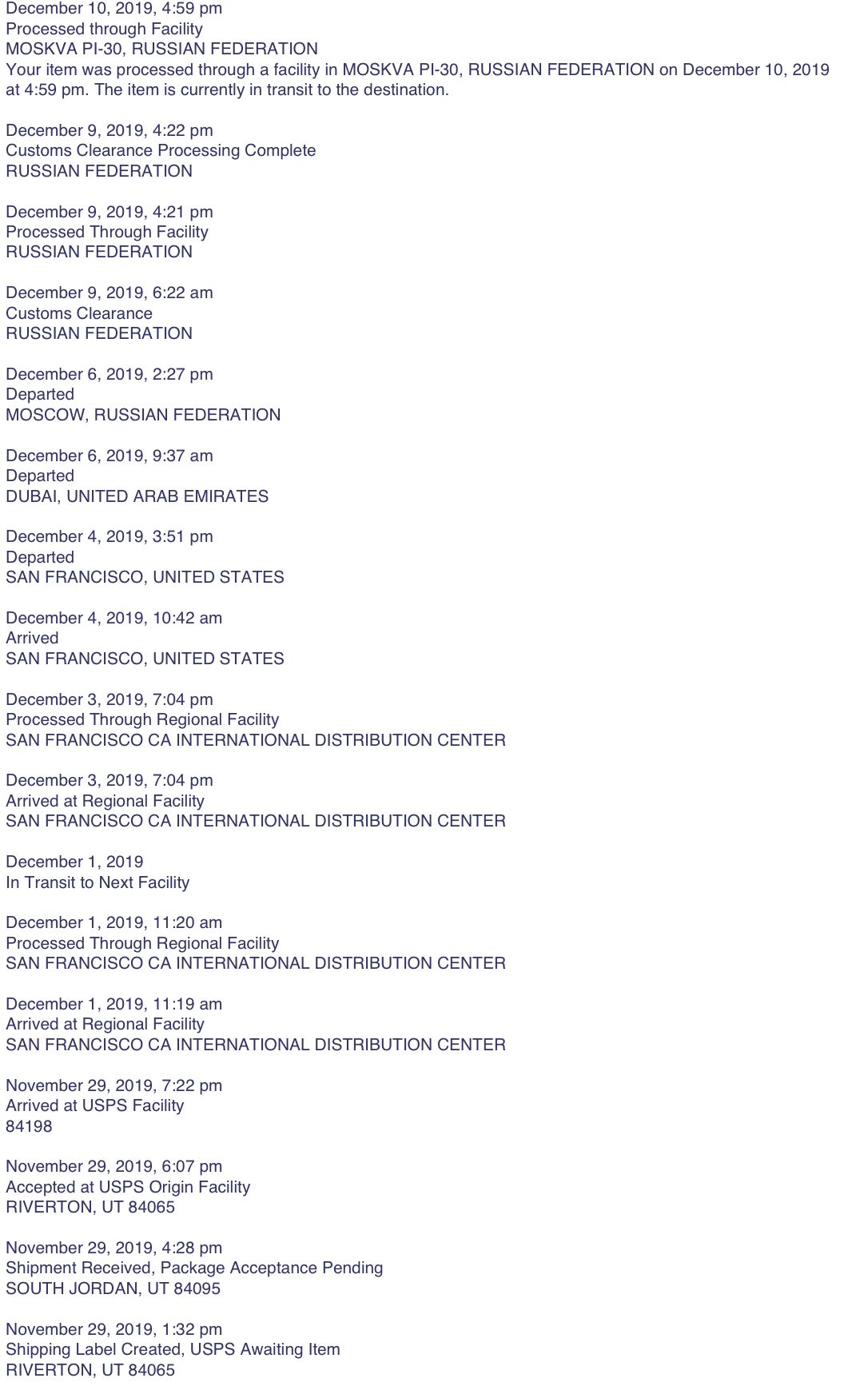 9 января 2020 1 час назад, viola33 сказал(а): Итого, ровно месяц в пути. После "черной пятницы" и накануне новогодних праздников все "задерживается и замедляется". Я из Англии с 29 ноября жду (летом за три недели доходила). Надеемся дальше АлёNка и letka сказали спасибо Поделиться сообщением Ссылка на сообщение