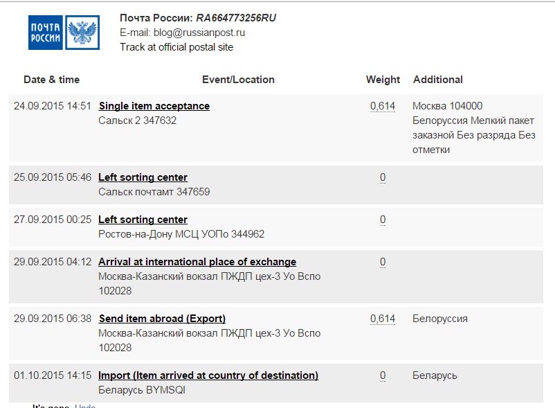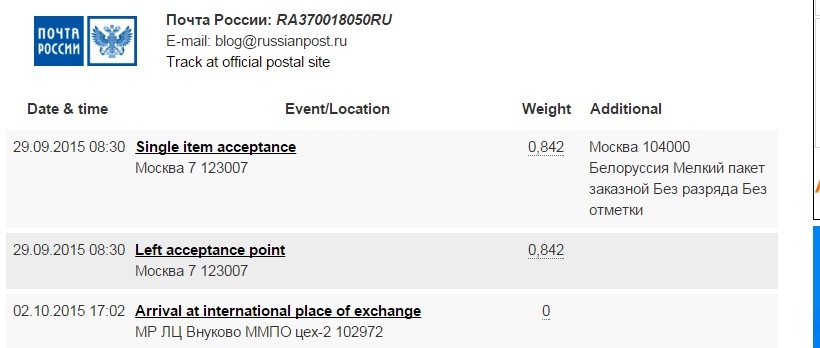 2 октября 2015 Дашенька, расскажи, пожалуйста, как ты мне отправляла робины? Обычное отправление идёт вот так: (заказ от Александры из Dimshop-а) В Москву на Казанский, а оттуда паровозиком - чух-чух. А твоё пошло в аэропорт Аж во Внуково Заказная посылка? Господи, сколько же за неё уплачено Поделиться сообщением Ссылка на сообщение
