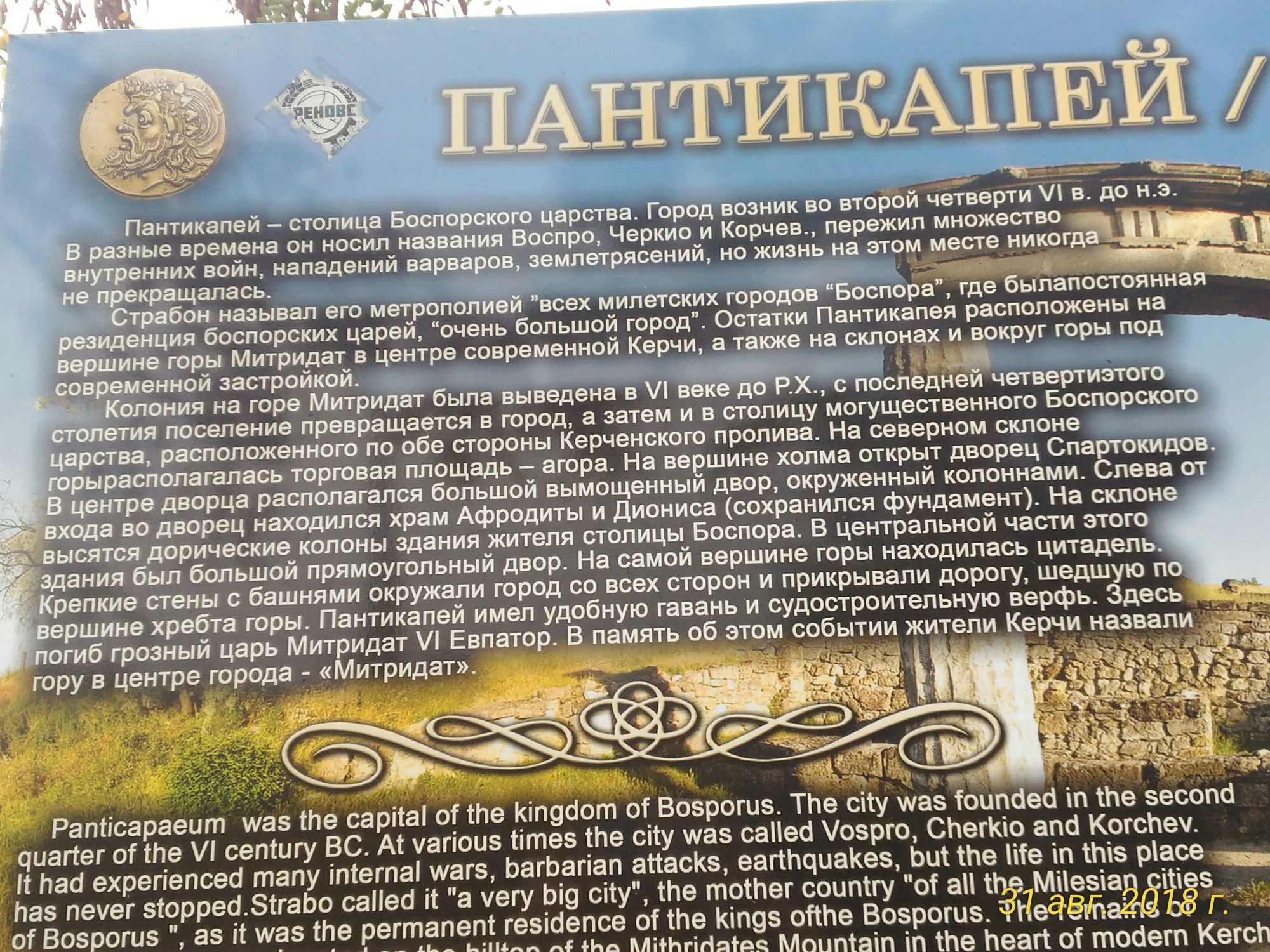 15 сентября 2018 Девочки-модераторы, все фото не для гаечки! Путешествие в Крым было недолгим , под конец моего отпуска. Так много всего было услышано и прочитано, что захотелось посмотреть своими глазами и Крымский мост и полуостров. А еще свозить туда маму, поэтому место я выбирала очень долго, чтобы ей было комфортно ходить. Когда Саша @Gala83 делилась впечатлениями о своем путешествие, мне очень понравилось как она описывает Евпаторию. Ведь я ее даже не рассматривала…но выбор сделан , мы едем именно туда. Спасибо, Саша! Уже по традиции мы делаем остановку в Ростове, где меня ждет Света veta, а утром продолжаем путь. Надо сказать, что в этом путешествии мы полностью положились на технику и зря, перефразируя известную поговорку « на технику надейся, а сам не плошай!». Сколько раз нас « покрутил» Навител!!! Начиная с того, что почему-то мост он не видел ( перед поездкой я проверила обновления) и повел нас в порт Кавказ на паромную переправу, но я вовремя заподозрила неладное и на мост мы все-таки попали. Немного удивила реакция мамы, которая сначала очень хотела его увидеть, а потом так же очень боялась по нему ехать. « Ну и что в нем такого?» - спросила она, «совершенно не страшно». Конечно, сооружение грандиозное, 19 км над морем, хотя чисто внешне мост, как мост. И вот он …Крым! Когда-то в детстве , я даже не могу сейчас вспомнить точно свой возраст, попалась мне книга «Митридат» Виталия Полупуднева, это сейчас я знаю автора, а тогда только имя грозного царя отпечаталось в памяти. Царь, успешно ведший войны с римской империей, беспощадный и к врагам и к друзьям и собственным детям. Наверное , это была первая на тот момент, прочитанная историческая книга, что я оказалась под таким впечатлением от нее. Проехать мимо Керчи, с развалинами столицы Боспорского царства Пантикапея , я не могла. На осмотр у нас был только один день, поэтому осмотрели центр города, залезли на гору Митридат , полазили по развалинам Пантикапея. Вершина горы соединяется с центром лестницей, которая носит название Митридатской . Произведение в стиле классицизма итальянского архитектора Александра Дигби, 436 ступенек, и мы их одолели ! Сейчас находится на реставрации, но никаких работ мы на ней не заметили. На вершине мемориал воинской славы и обелиск павшим героям при освобождении Керчи . Пантикапей - Основали поселение на горе Митридат в 7 столетии до н.э. Вначале это было отдельное поселение, но уже в 480 году до н.э. он превращается в столицу Боспорского царства. Город вел оживленную торговлю, через Пантикапей проходили торговые пути из Средиземноморья и даже Китая. Из города вывозили вино, рыбу, зерно. Пантикапей занимался чеканкой монет, которые вскоре стали главной денежной единицей царства. На них изображали грифона, бога Пана, хлебный колос или животных. Расцвет Пантикапея пришелся на середину IV века до н.э. А в 107 году до н.э. при царе Перисаде вспыхнуло восстание , приведшее к смене династии и попаданию Боспора под власть Понта и царя Митридата. Спустя 100 лет Боспор попадает в зависимость от Рима, но постоянные нашествия кочевников привели к падению города в 370 году — в него вошли гунны. Это ознаменовало конец Боспорского царства, но город еще продолжает существовать: В 6 веке он под именем Боспор входит в состав Византии. После этого бывший Пантикапей начинает переходить между народ