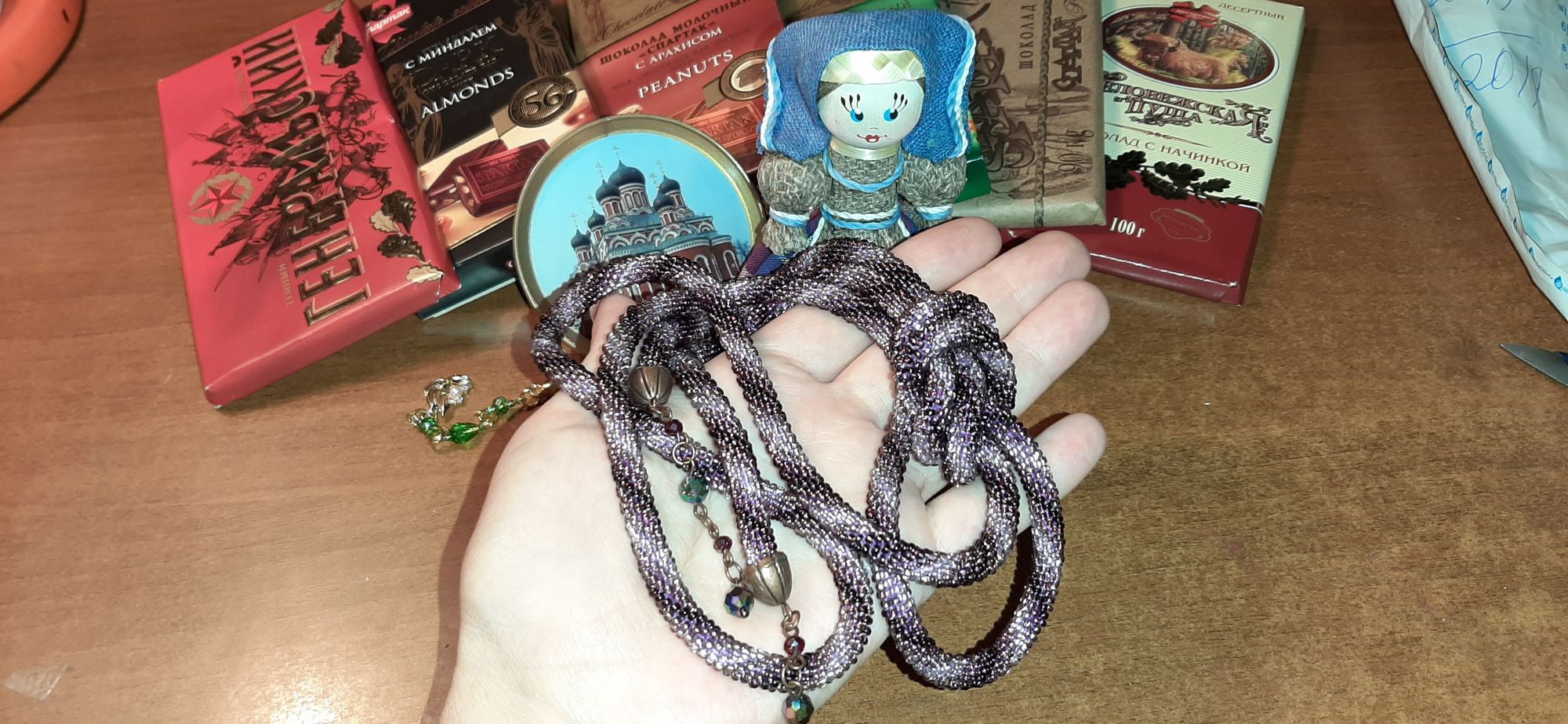 21 сентября 2020 Танечка, mamatata, позволь поблагодарить тебя здесь Когда-то читала дочке про Дедов Морозов разных стран, и, кажется, в Беларуси этого сказочного дедушку зовут Зюзя. А теперь я точно знаю, как зовут белорусскую Снегурочку – @mamatata! Благодаря тебе внезапно в сентябре у меня случился настоящий "Новый год с мешком подарков". СПАСИБО ОГРОМНОЕ! Немного поясню)))) Если кто-то пропустил, Татьяна начала очень интересную проработку схемы – и предложила по началу схемы угадать, что это будет, а наградой был красивый (просто волшебный) лариат Честно признаюсь, в схемах вышивки крестом я не понимаю ничего от слова совсем, и угадала (винюсь) скорее как поисковик, а не как рукодельница. Даже сначала и не поверила, что угадала. И неудобно было принимать такой замечательный подарок, вроде как неправильно что-то… наверное, и сейчас до сих пор чуточку не верится.. но вопли "внутреннего ребёнка": "ааааа, ну угадала же, а там ТАКАЯ ПРЕЛЕСТЬ!", - победили муки совести За путешествием посылки по трек-коду от Татьяны следила как дитя за картой передвижения Дедушки Мороза )))))))) И на почту бежала "вприпрыжку", боясь, что не успею после работы до закрытия отделения. Фффууух, успела! Жду маленький пакетик с лариатом, а мне выносят…. Ой.. Это что? Всё мне? А это точно моя коробочка? И фамилия моя? Из Беларуси? От Татьяны? Мамадарахая! Домооой! Бегооом-бегом-бегом! (увидев маму с коробкой на пороге, дочь притащила ножницы и подпрыгивала от нетерпения рядом)) Танечка, спасибо за всё! За конкурс, за лариат и за такие неожиданные и приятные сюрпризы! Аромат шоколада почувствовали, не раскрывая коробки, а только сняв упаковочный пакет)))) ЭЭээх, жаль фото аромат и вкус не передаёт! Белорусский шоколад - вкуснотища!!! Очаровательную белорусскую куклу-Ниночку дочь "подружила" с матрёшками и якутяночкой))) Подвеска-рыбка с жемчужинкой явно исполняет желания, я (как мартовская рыбка) точно знаю! Магнит (со Свято-Воскресенским собором? Правильно определили?) занял почётное место на холодильнике )))) А лариат … (какой же он красиииивый!!!!!!!!!) облюбован, поглажен, перемерян с гардеробом, сфотографирован (не смогла дождаться дневного освещения, простите за качество фото)))), продемонстрирован семейству живьём, друзьям с помощью вотсапа, а теперь и тут (не могу не поделится такой радостью!!!)! КРАСОТА!!!! И теперь у меня!!!! АААААА!!!!!! Да-да-да-да-да!!!!! Танечка, спасибо тебе, добрая волшебница, за золотые руки и такую невероятную красоту!!! На душе солнечно и радостно, ведь ко мне с лариатом приехало и душевное тепло замечательной белорусской волшебницы! Танечка! Вдохновения! Новых творений! Исполнения желаний и волшебства в жизни! Ещё раз БОЛЬШОЕ СПАСИБО! P.S. уверена: "Сон разума" в твоей вышивке будет прекрасен! Маса, lenning, sette venerdi и 25 других сказали спасибо Поделиться сообщением Ссылка на сообщение