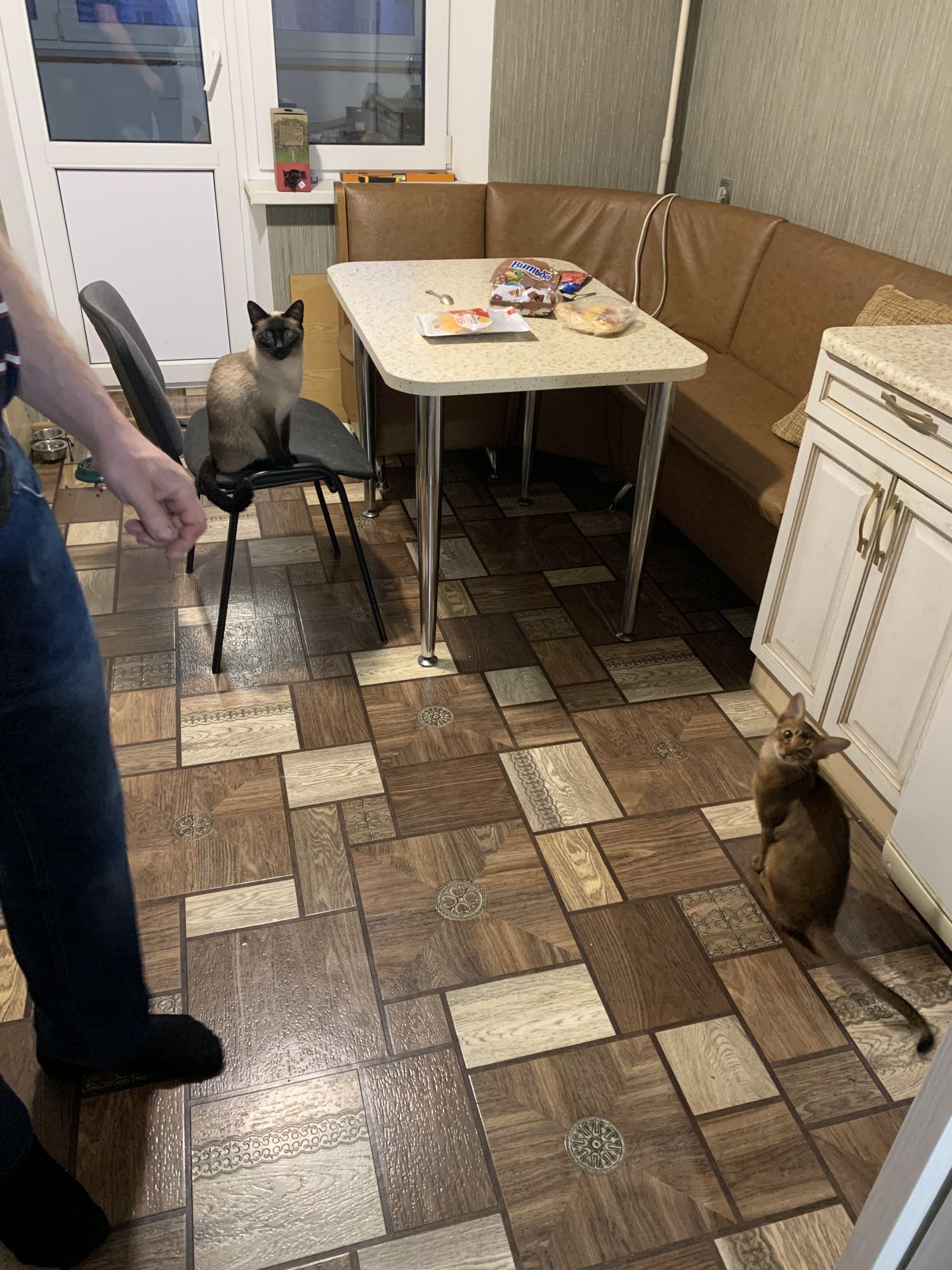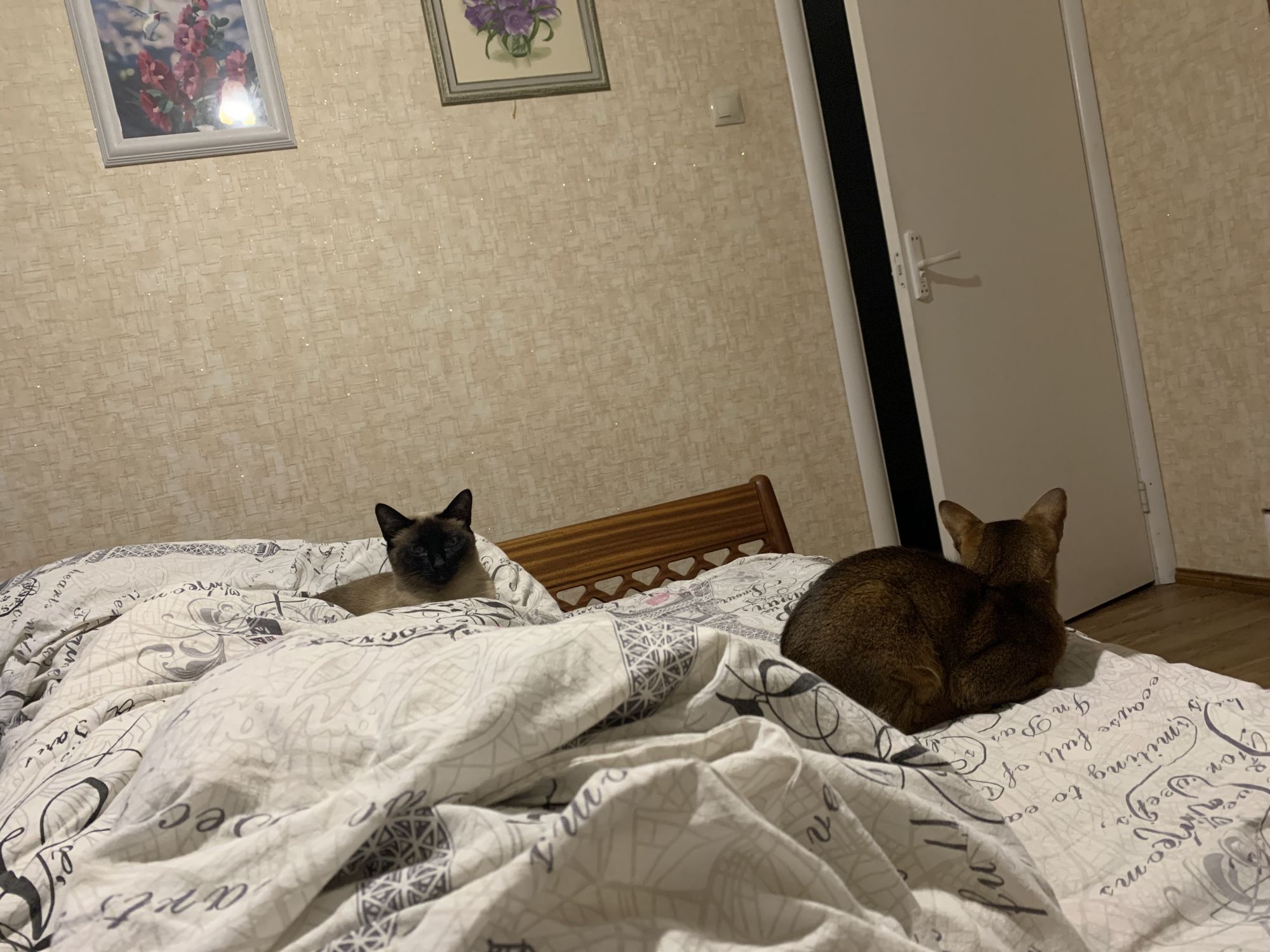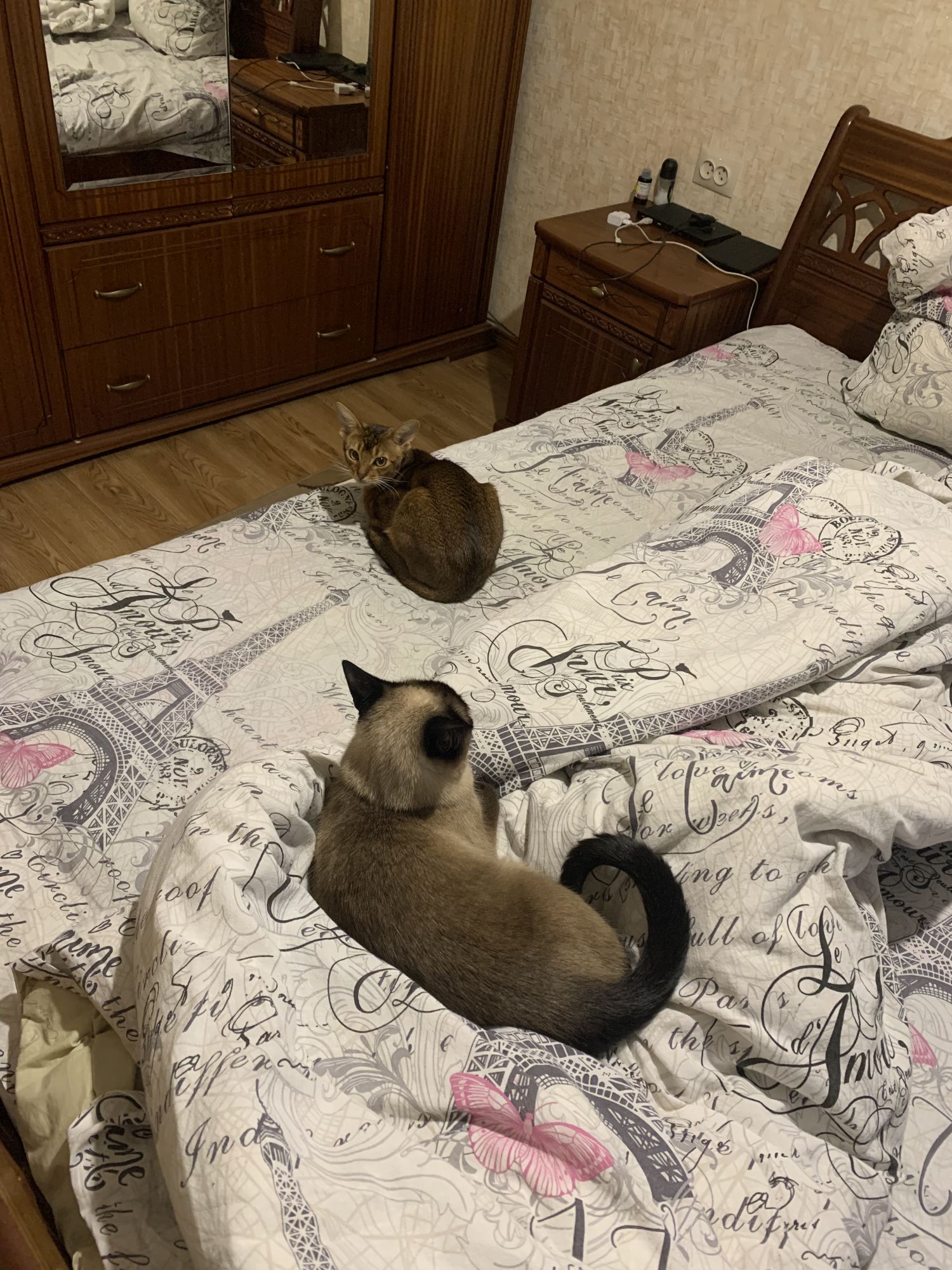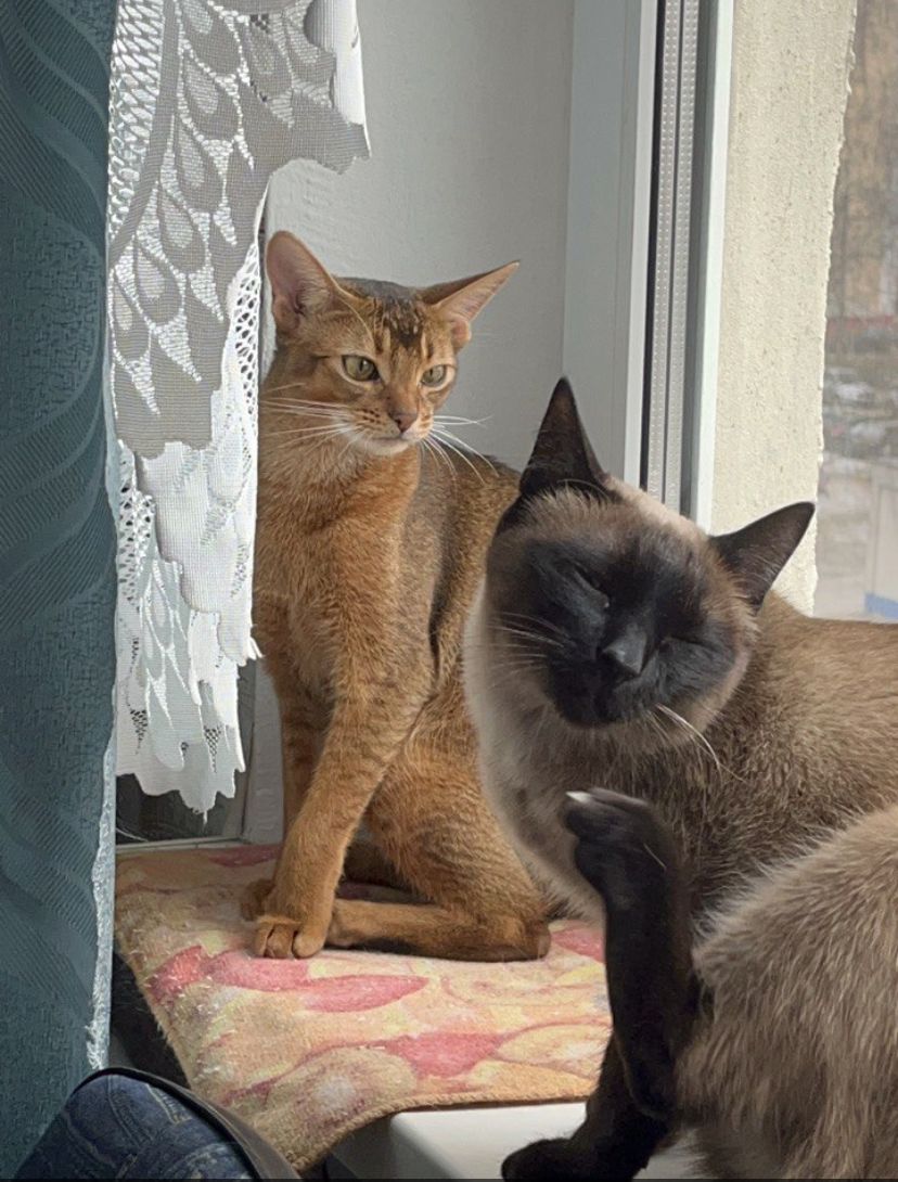 28 марта 2022 Котенька девушка уже взрослая, сильно не меняется. Исключительно в пределах, природой очерченных. Вот, например, может притвориться квадратной А вообще, как выросла горделивой сиамской с чуть ориентальным профилем, так и держится. В меру ленива, в меру игрива, в меру ласкова, но исключительно к хозяевам и членам семьи. Причём, мои старшие дети в этот круг не включены ибо с нами не проживают, бывают редко. А тут так получилось, что дочь приехала на пожить, да целый месяц. И привезла Бублика. Очаровательного семимесячного обалдуя абиссинской породы. Игруна, лишенного чувства самосохранения и страха , как следствие вышеназванного дефекта. Да ещё и с хроническим чувством голода, не зависящим от того, как давно и сытно его кормили. Он просто самый голодный кот на свете. Ну, ещё и самый наглый. У него есть и более приличные фото, но эта характеризует его полнее. Притирались они друг к другу долго. Котя притиралась. Бублик радостно жил и осваивал новую территорию. Дрались, конечно, но обошлось без кровавой резни бензопилой в Техасе. В общем, все выжили и приспособились. В обычное время Котя более-менее гоняла Бублика, на время кормежки приходилось их разделять, так как тут у Бобла пропадало всякое понятие о берегах, и единственное, что его заботило, невозможность есть из двух мисок одновременно. Он бросал свою, бежал к Костиной, возвращался обратно, рыча, урча и матерясь одновременно. Котя была в ахере и предпочитала удалиться. Пришлось кормить по очереди. При открытии двери на кухню, Бублик немедленно врывался, перепрыгивая через уже находящуюся на выходе Котю и вылизывал ее миску дочиста. Я была довольна, пропала необходимость мыть котясь посуду. А вот с туалетом беда. При наличии своего у каждого, коты предпочитали «вражеский». Почему-то закапывание происходило с особым остервенением Прошу прощения за подробности. К концу марта мохнатые даже спали уже в одной комнате, но не вместе Бублик периодически претендовал на мамины колени И вот в эти выходные они уехали. Вика говорит, Бублик скучает. Котя оккупировала меня и наслаждается единоличным владением nogres, Lenara, Фро-J и 28 других сказали спасибо Поделиться сообщением Ссылка на сообщение