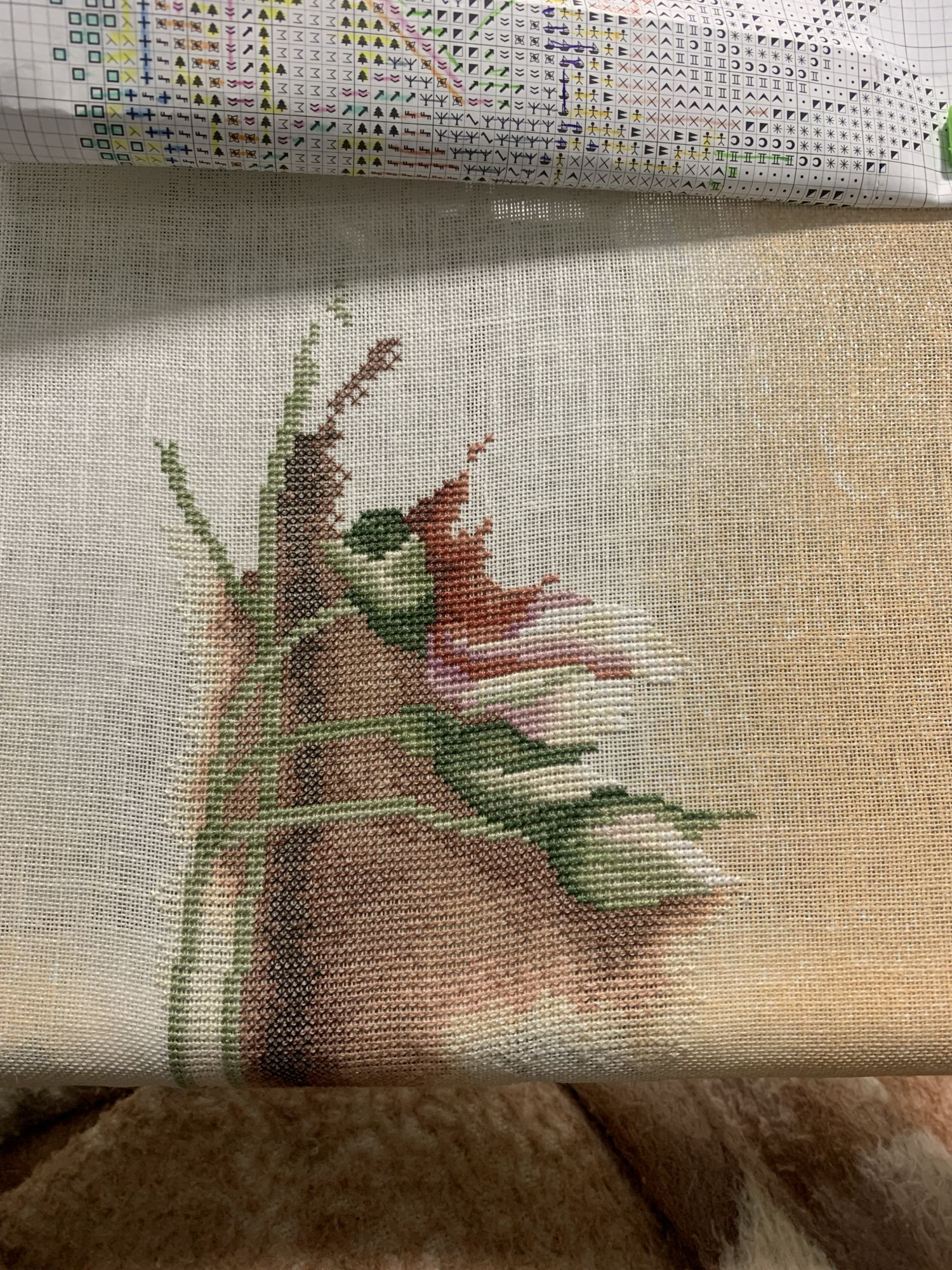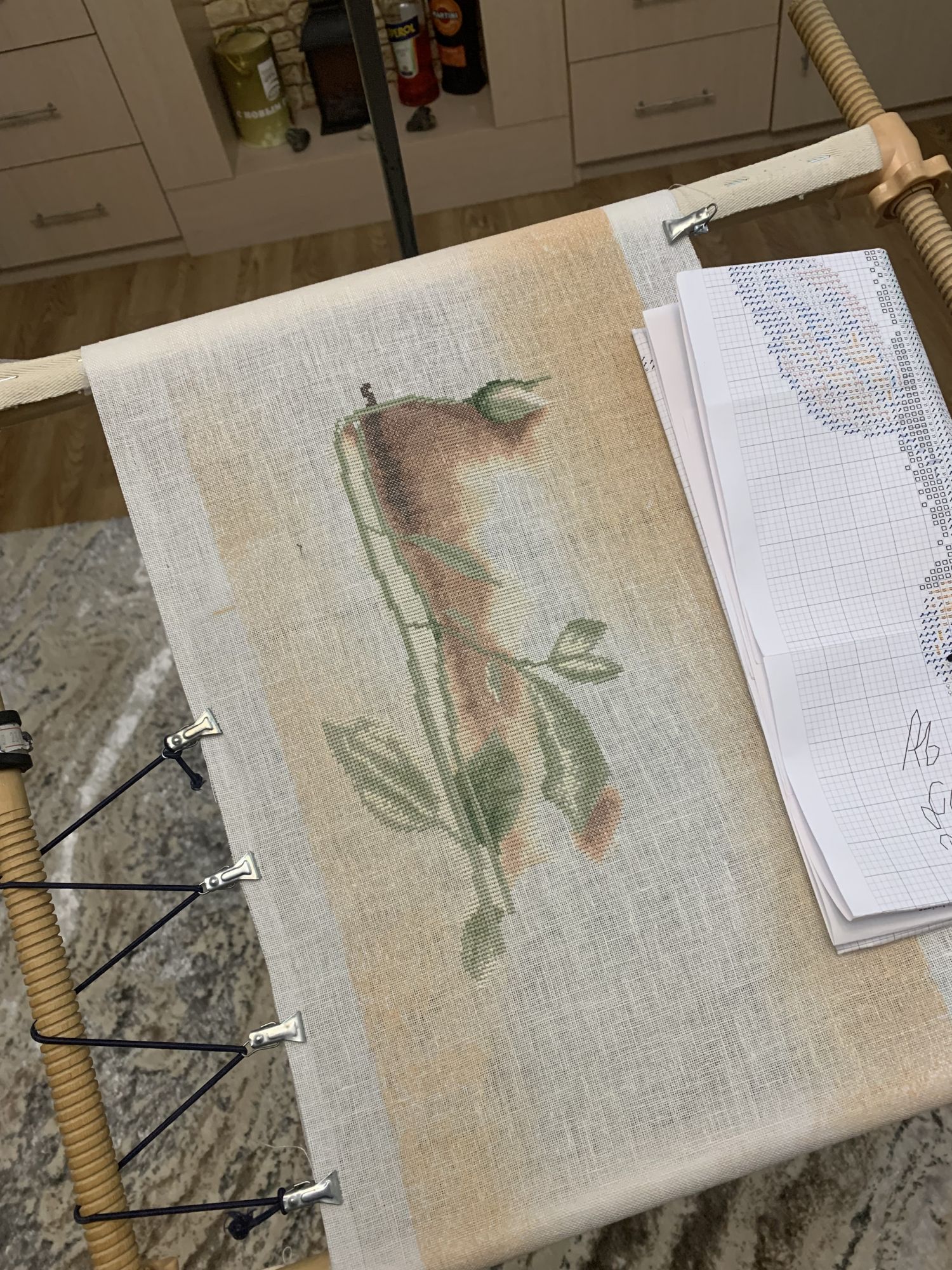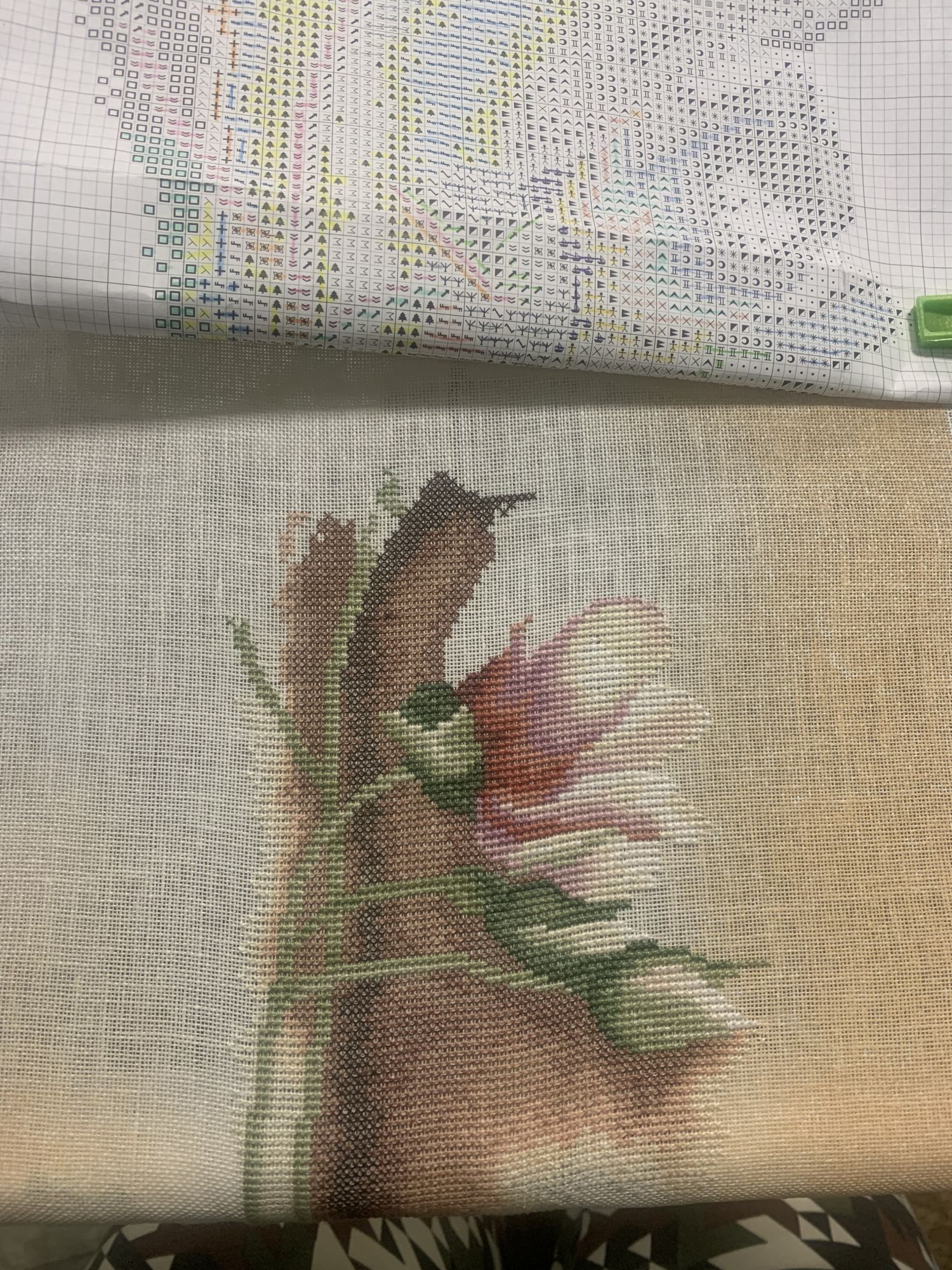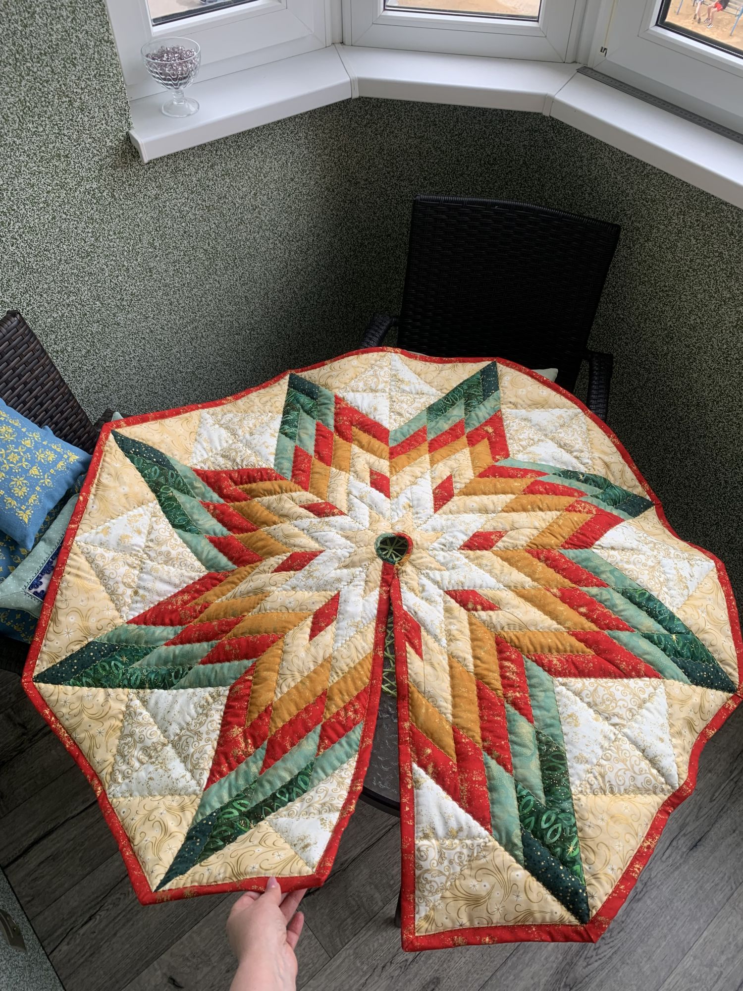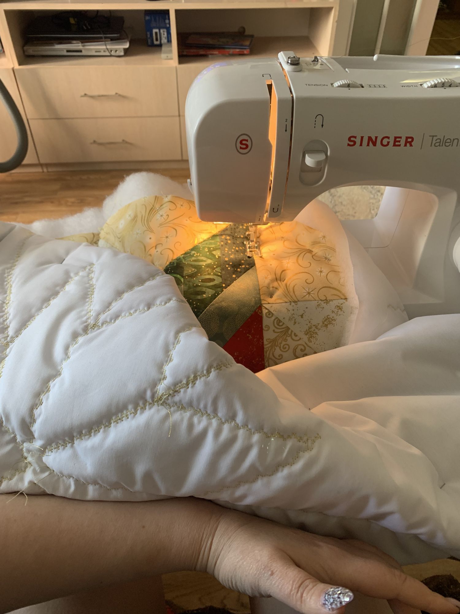 19 июня 2023 Отчет. 1. Пэчворк. Юбка под елку. Майский отчет я профилонила. А май ознаменовался уже традиционной поездкой в Питер за весенним солнышком, прогулками и дружескими посиделками. И была еще одна цель намечена и достигнута - посещение магазина с тканями для пэчворка. Ибо дорогие сестры во игле внемли моим воплям "хочувотэтотмастерклассссс!!!" и подарили мне МК по пошиву юбки под елку в стиле пэчворк. То, что юбку я не вышью я уже поняла, но кто мешает мне ее сшить, тем более в свете последнего моего увлечения. - это я в Питере хвастаюсь приобретениями. В Питере было еще много всякого интересного. Походов, поездок, музеев, но я вам не расскажу. И не потому, что я такая вредная, просто у меня это не очень получается. Покажу только наше с Аней @monstrochka селфи А вот как я шила юбку под елку - поделюсь! О! Это была еще та эпопея! И наполнена она была захватывающим разрезанием купленных тканюшек на тонкие полосочки шириной два дюйма, сшивание их, разглаживание, разрезание уже попарно или по три, или по четыре сшитых полоски под углом и снова сшивание. И так тридцать лет и три года! В итоге были собраны восемь вот таких ромбов . Из них и надо было собирать юбку. Вариантов было 3 Дальше в процессе примерки активное участие Котенька. А эти фото сделаны чисто с целью похвастаться, как ловко я совместила все швы , что, поверьте мне, автоматически никак не получается. Пришлось приложить усилия. После выбора варианта расположения ромбов пришло время вновь браться за кройку - между ромбами пространство пустым не оставишь. И новая примерка, как расположить нарезанное Для любопытных "вид сзади", изнанка и лицо в профиль Что ж, половина дела сделана! Впереди очередной интереснючий этап - стежка. Это когда делаешь бутерброд из сшитого из лоскуточков, синтепона и еще одного слоя ткани и прострачиваешь все это в разнообразных направлениях. Фигуры крутить ввиду отсутствия большого опыта и маленькой машинки я не стала. Пошла по простому пути. Иногда это самый верный вариант. Строчила по швам, но фигурной строчкой и люрексом. Кто ж знал, что его уйдет 4 катушки! Получилось Вот такое одеялко , которое предстояло обработать бейкой. - цвет бейки выбираю. Остановилась на красной. Итог - мне понравилось! Главный вывод - надо готовиться и все продумывать. Планы - хочу еще, но пока продумываю и готовлюсь . 2. Lanarte 34926 (8050), Pоза (Rosa Botanical). Только недавно вернулась к вышивке. Пока двигаю розу от Ланарте. Было / стало / Nadinka-Blondinka, Galagenka, pellbell и 26 других сказали спасибо Поделиться сообщением Ссылка на сообщение
