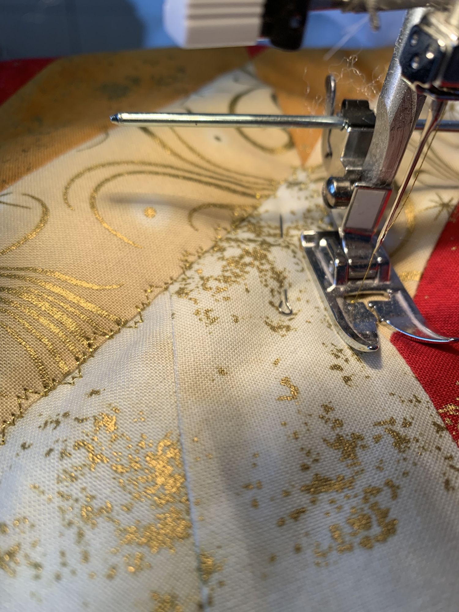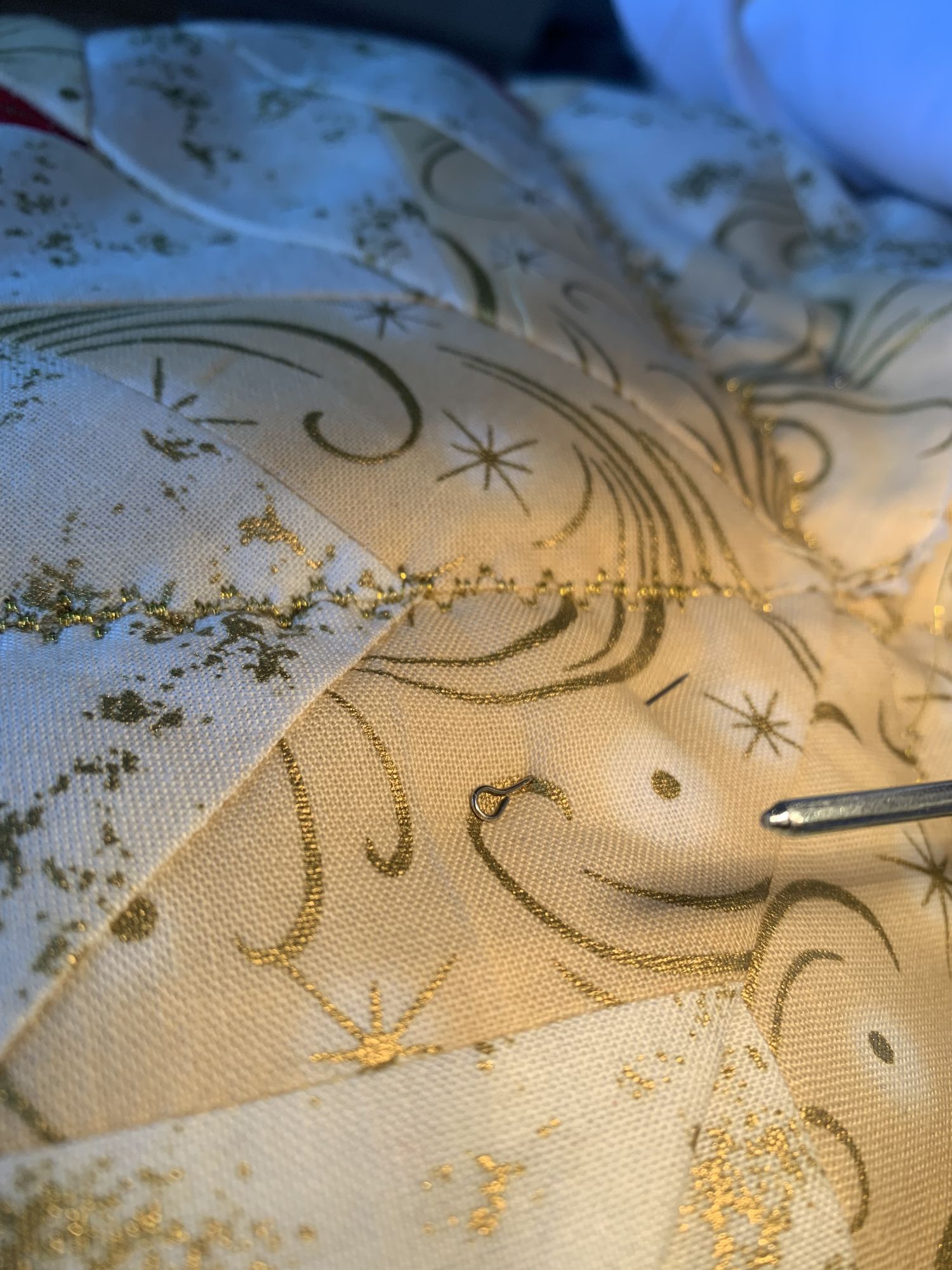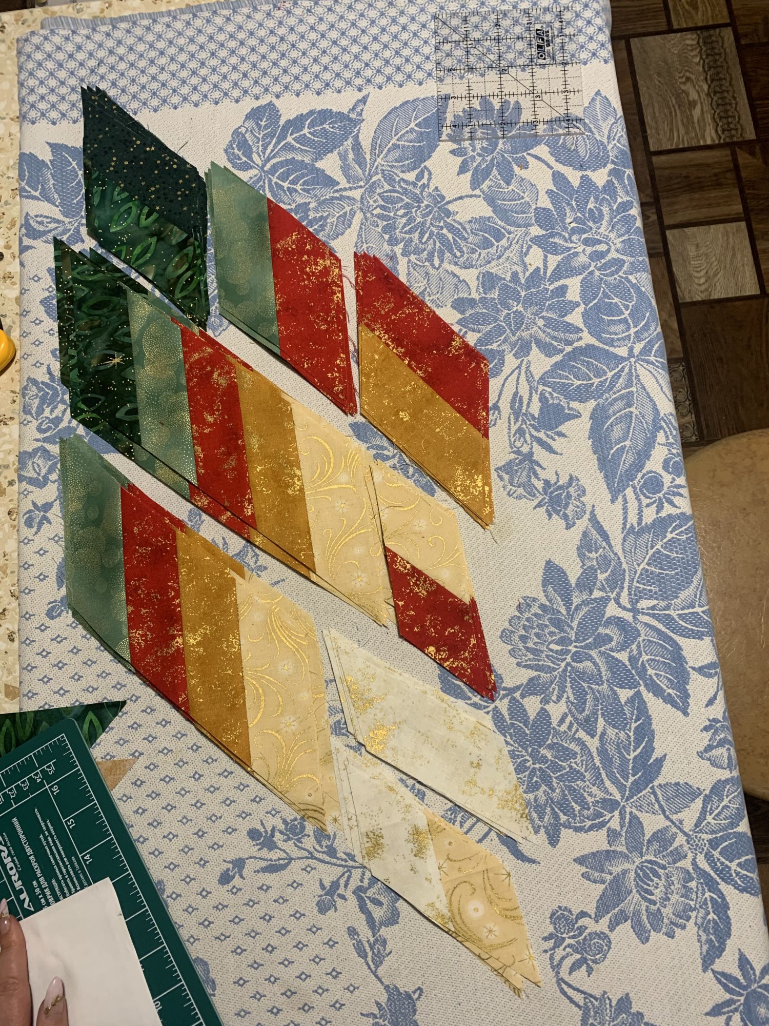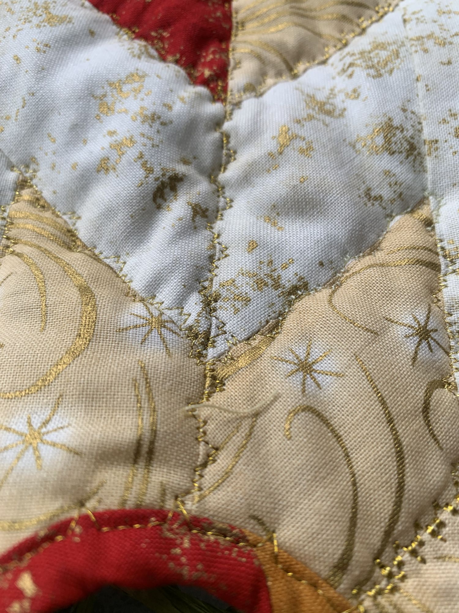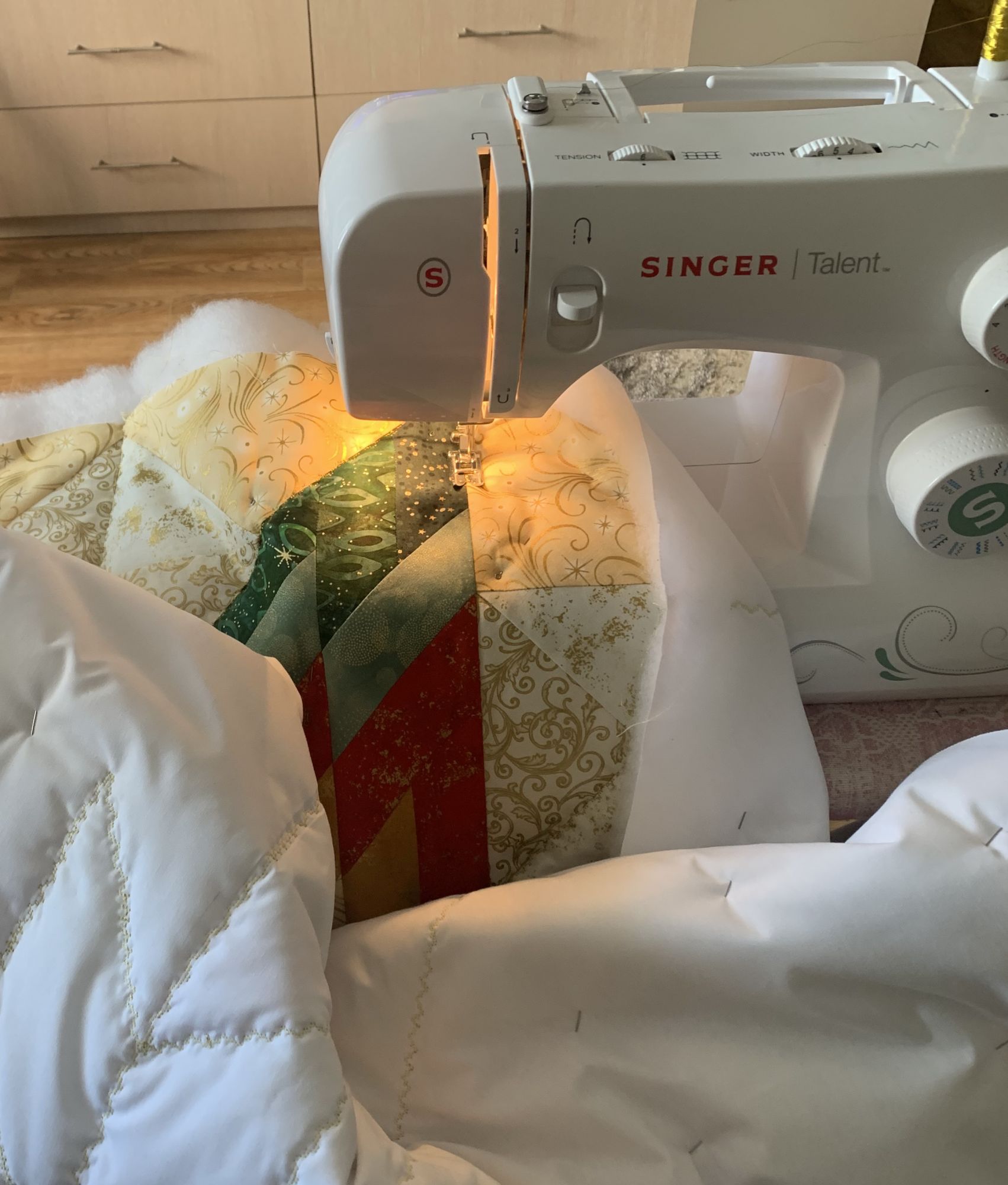 19 июня 2023 Отчет. 1. Пэчворк. Юбка под елку. Майский отчет я профилонила. А май ознаменовался уже традиционной поездкой в Питер за весенним солнышком, прогулками и дружескими посиделками. И была еще одна цель намечена и достигнута - посещение магазина с тканями для пэчворка. Ибо дорогие сестры во игле внемли моим воплям "хочувотэтотмастерклассссс!!!" и подарили мне МК по пошиву юбки под елку в стиле пэчворк. То, что юбку я не вышью я уже поняла, но кто мешает мне ее сшить, тем более в свете последнего моего увлечения. - это я в Питере хвастаюсь приобретениями. В Питере было еще много всякого интересного. Походов, поездок, музеев, но я вам не расскажу. И не потому, что я такая вредная, просто у меня это не очень получается. Покажу только наше с Аней @monstrochka селфи А вот как я шила юбку под елку - поделюсь! О! Это была еще та эпопея! И наполнена она была захватывающим разрезанием купленных тканюшек на тонкие полосочки шириной два дюйма, сшивание их, разглаживание, разрезание уже попарно или по три, или по четыре сшитых полоски под углом и снова сшивание. И так тридцать лет и три года! В итоге были собраны восемь вот таких ромбов . Из них и надо было собирать юбку. Вариантов было 3 Дальше в процессе примерки активное участие Котенька. А эти фото сделаны чисто с целью похвастаться, как ловко я совместила все швы , что, поверьте мне, автоматически никак не получается. Пришлось приложить усилия. После выбора варианта расположения ромбов пришло время вновь браться за кройку - между ромбами пространство пустым не оставишь. И новая примерка, как расположить нарезанное Для любопытных "вид сзади", изнанка и лицо в профиль Что ж, половина дела сделана! Впереди очередной интереснючий этап - стежка. Это когда делаешь бутерброд из сшитого из лоскуточков, синтепона и еще одного слоя ткани и прострачиваешь все это в разнообразных направлениях. Фигуры крутить ввиду отсутствия большого опыта и маленькой машинки я не стала. Пошла по простому пути. Иногда это самый верный вариант. Строчила по швам, но фигурной строчкой и люрексом. Кто ж знал, что его уйдет 4 катушки! Получилось Вот такое одеялко , которое предстояло обработать бейкой. - цвет бейки выбираю. Остановилась на красной. Итог - мне понравилось! Главный вывод - надо готовиться и все продумывать. Планы - хочу еще, но пока продумываю и готовлюсь . 2. Lanarte 34926 (8050), Pоза (Rosa Botanical). Только недавно вернулась к вышивке. Пока двигаю розу от Ланарте. Было / стало / Nadinka-Blondinka, Galagenka, pellbell и 26 других сказали спасибо Поделиться сообщением Ссылка на сообщение