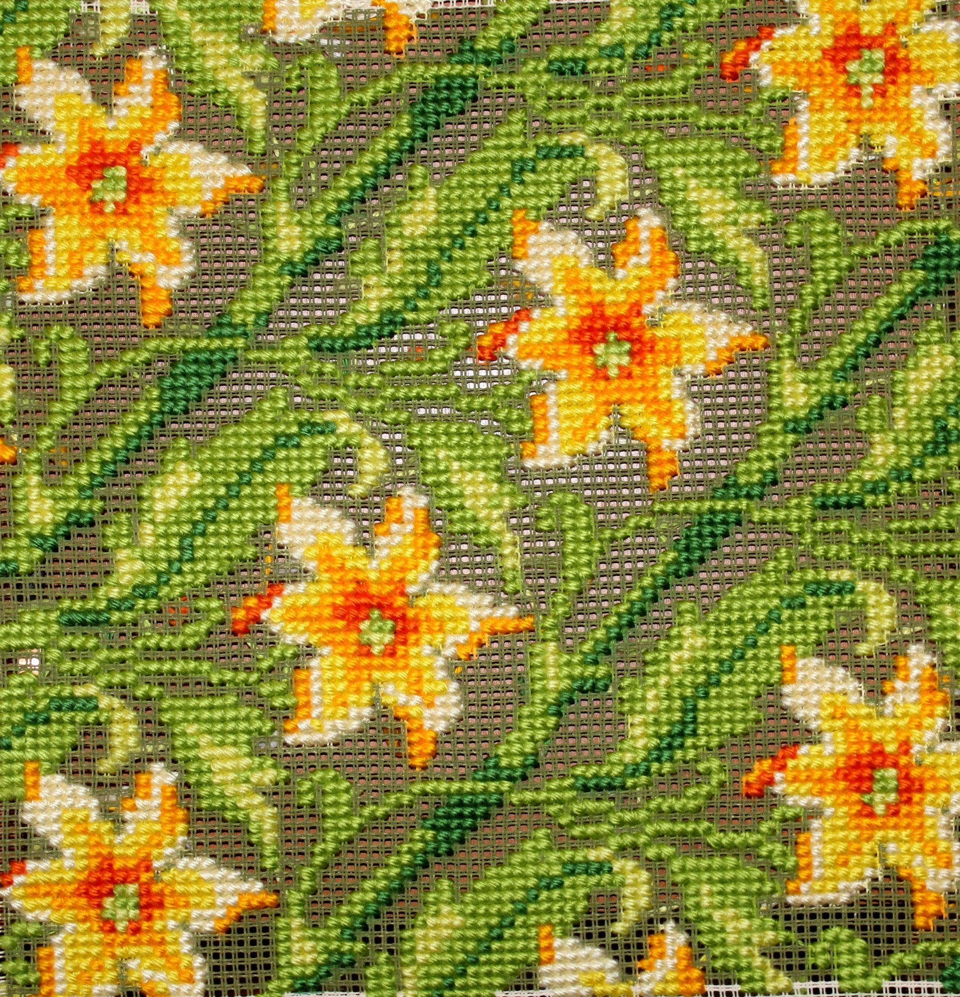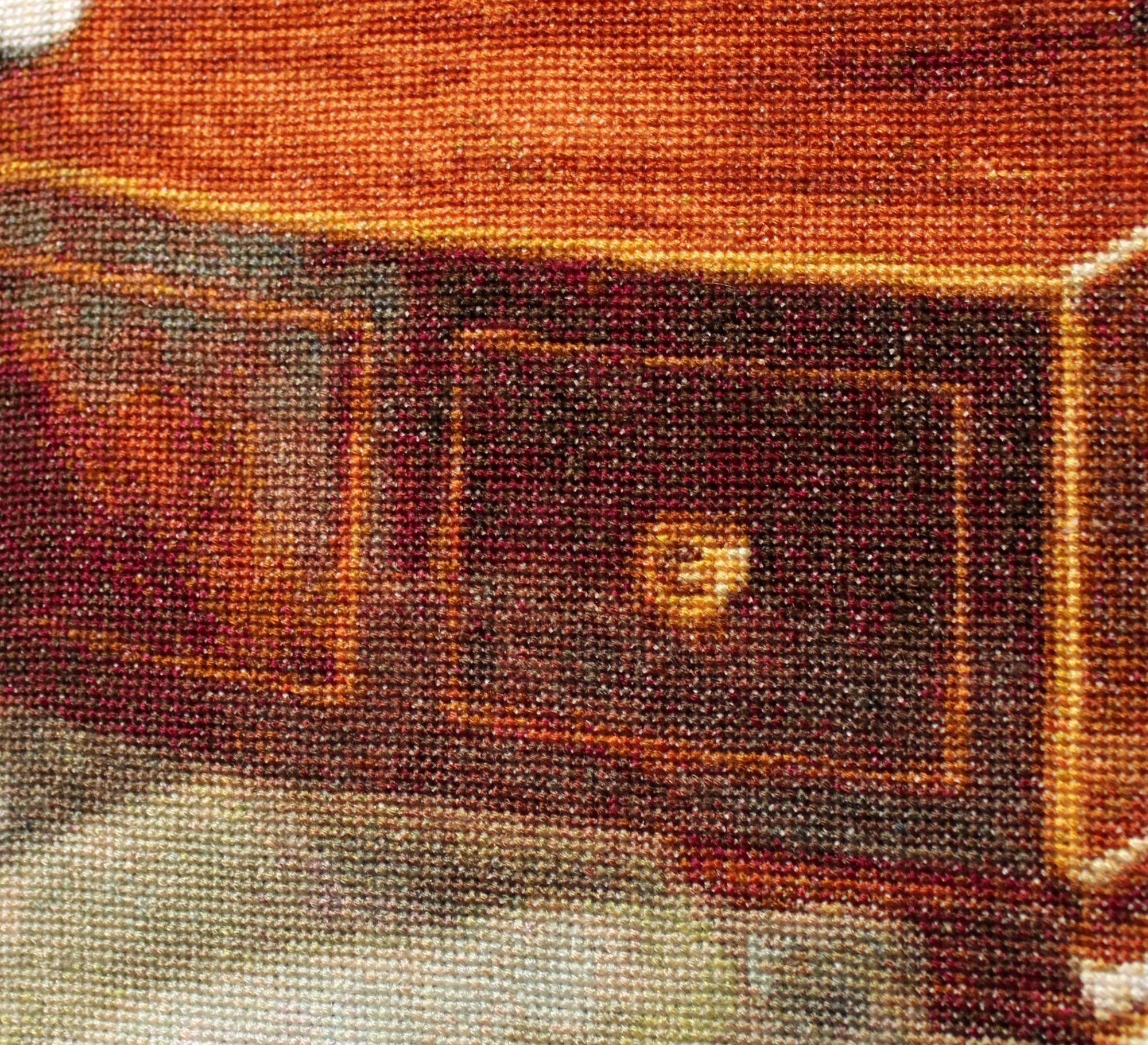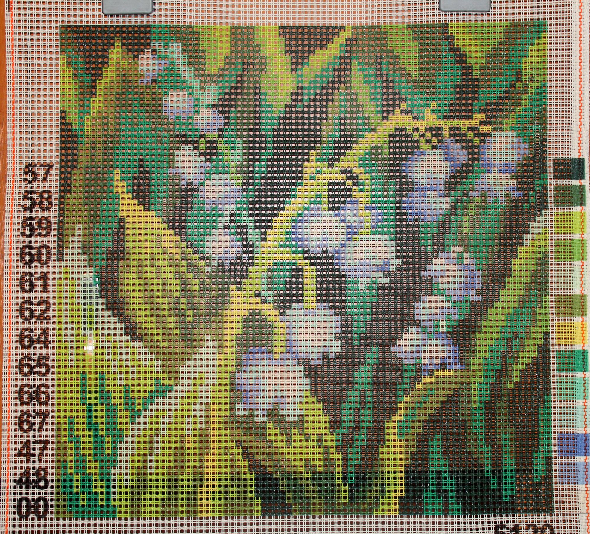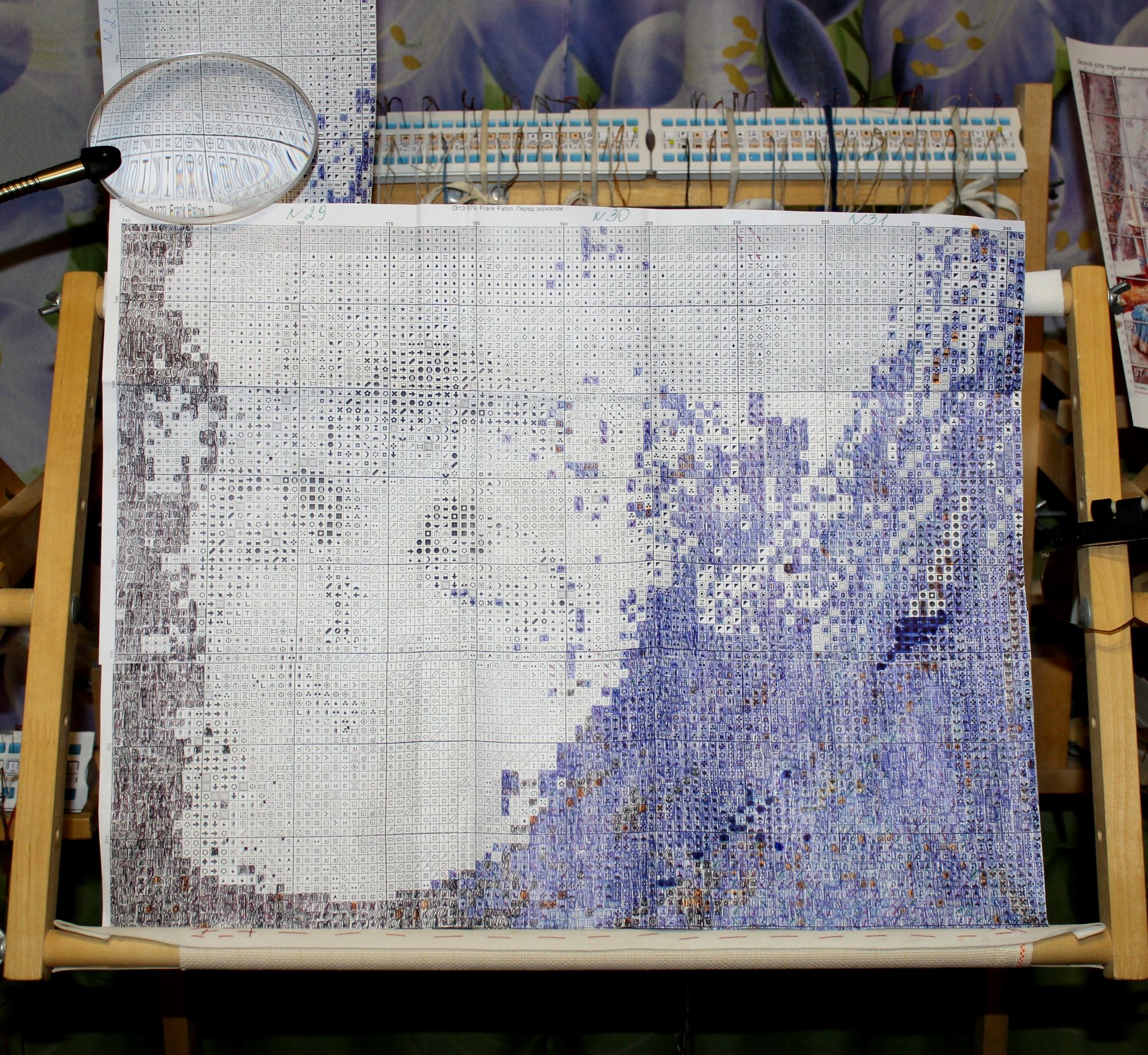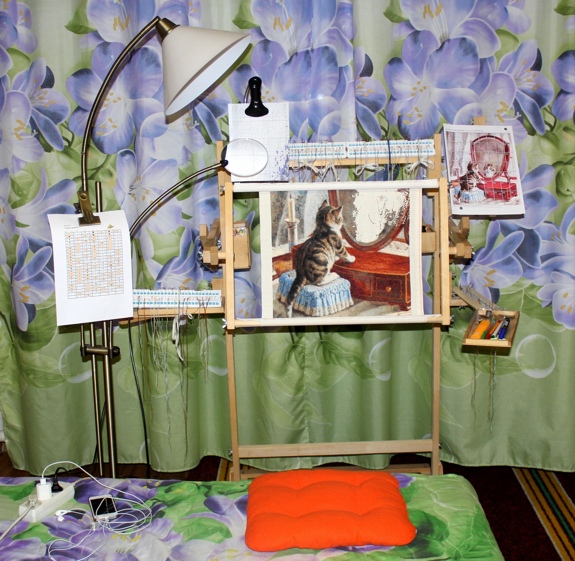 29 июля 2019 ВЫШИТО. 1). Заготовка для подушки ЛИЛИИ от Коллекшн Д"Арт Лтд. ( не для гаечки) 2). Заготовка для подушки АНЮТИНЫ ГЛАЗКИ от Вервако. ( Не для гаечки) В ПРОЦЕССЕ. 1). Работа ПЕРЕД ЗЕРКАЛОМ. ( В гаечку. Продолжение.) На первом фото показано как организован мой процесс. Иголки с нитками размещены на трех органайзерах Пако и одном Дубко. Два органайзера Пако я привязала к верхней планке станка, а третий - к полке слева. Органайзер Дубко положила на направляющую правой полки. Привязаны органайзеры обычными шнурками. Конечно, смотрится не очень красиво, но мне нужно чтобы они были закреплены жестко. Я часто передвигаю станок или могу нечаянно толкнуть его и тогда органайзеры летали бы в разные стороны. Справа к станку прикручен держатель схем на магнитах. На него положила картинку с разбивкой по листам схемы. На гибкий держатель от напольного светильника повесила шпаргалку, которая входит в комплект наборов ЭСТЭ. Очень нужная и полезная вещь в работе над такими картинами. Все значки схемы разбиты на семь столбиков по группам: треугольники, квадратики, стрелочки и т.д. Очень просто найти нужный значок на органайзере. Вышиваемый лист схемы я размещаю на самой раме слева или справа. Его на фото нет. Лист схемы, который выше вышиваемого, я размещаю на гибком держателе схем над рамой. Он прикреплен к верхней планке станка. Сами нитки у меня хранятся на органайзерах, входящих в комплект наборов ЭСТЭ. Они лежат на диване( на фото не видно). На фото запечатлен момент когда я вышиваю сидя на диване. Могу вышивать сидя на стуле. Тогда станок разворачиваю вправо, светильник передвигаю еще левее. По правую руку оказывается подоконник, на котором размещаю рабочую папку, нитки на органайзерах и другие приспособления. На втором фото показана вышитая часть будущей картины. За июль вышила много. В прошлых отчетах я писала что все участки схемы одинаково сложные. Есть все таки более легкий участок. Это верхняя часть тумбы. На ней всего 22 цвета. Если во всей работе, к примеру, 40 цветов, то участок в 22 цвета считается сложным. В этой картине 154 цвета, а это значит, что такой участок легкий. Для сравнения. Над верхней частью тумбы есть светлый участок. Так на нем в каждой сотне крестиков по 40-48 цветов. А еще выше есть участок чуть потемнее ( треугольник). В нем 58 цветов. Да что там говорить. На белом кончике хвостика около 60 цветов! Фото передает в 10 раз меньше цветов чем на самом деле. На третьем фото часть тумбы крупным планом. На четвертом фото я показала что иногда склеиваю между собой несколько листов схемы. На фото 37-ой,38-ой,39-ый,29-ый,30-ый и 31-ый листы схемы. Так мне удобнее будет вышивать мордочку котика. 2). Подушка ЛАНДЫШИ от Коллекшн Д"Арт Лтд ( Греция) арт.5.120. (В гаечку. Новый процесс) makalicha1970, Lenara, maui и 15 других сказали спасибо Поделиться сообщением Ссылка на сообщение