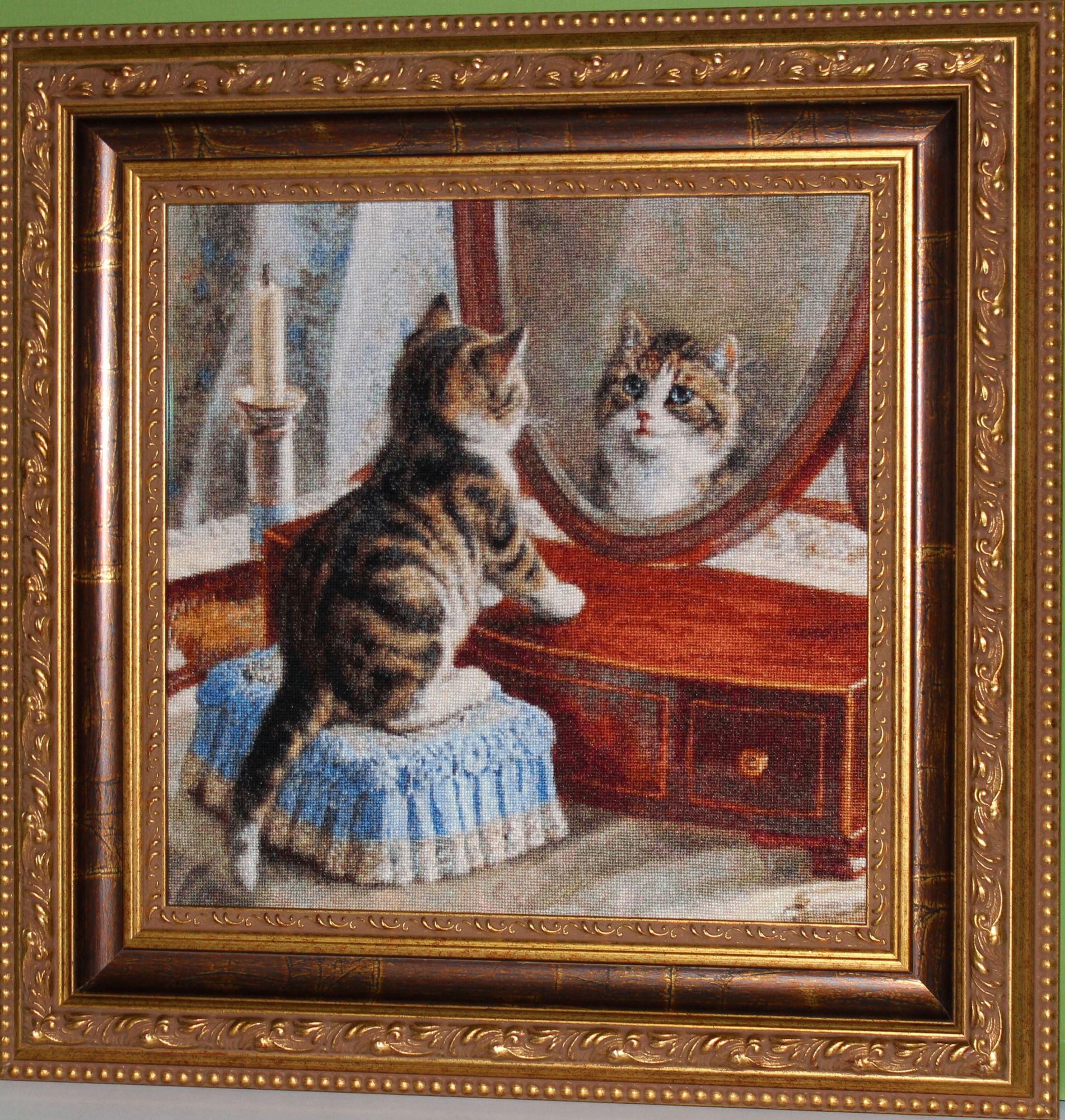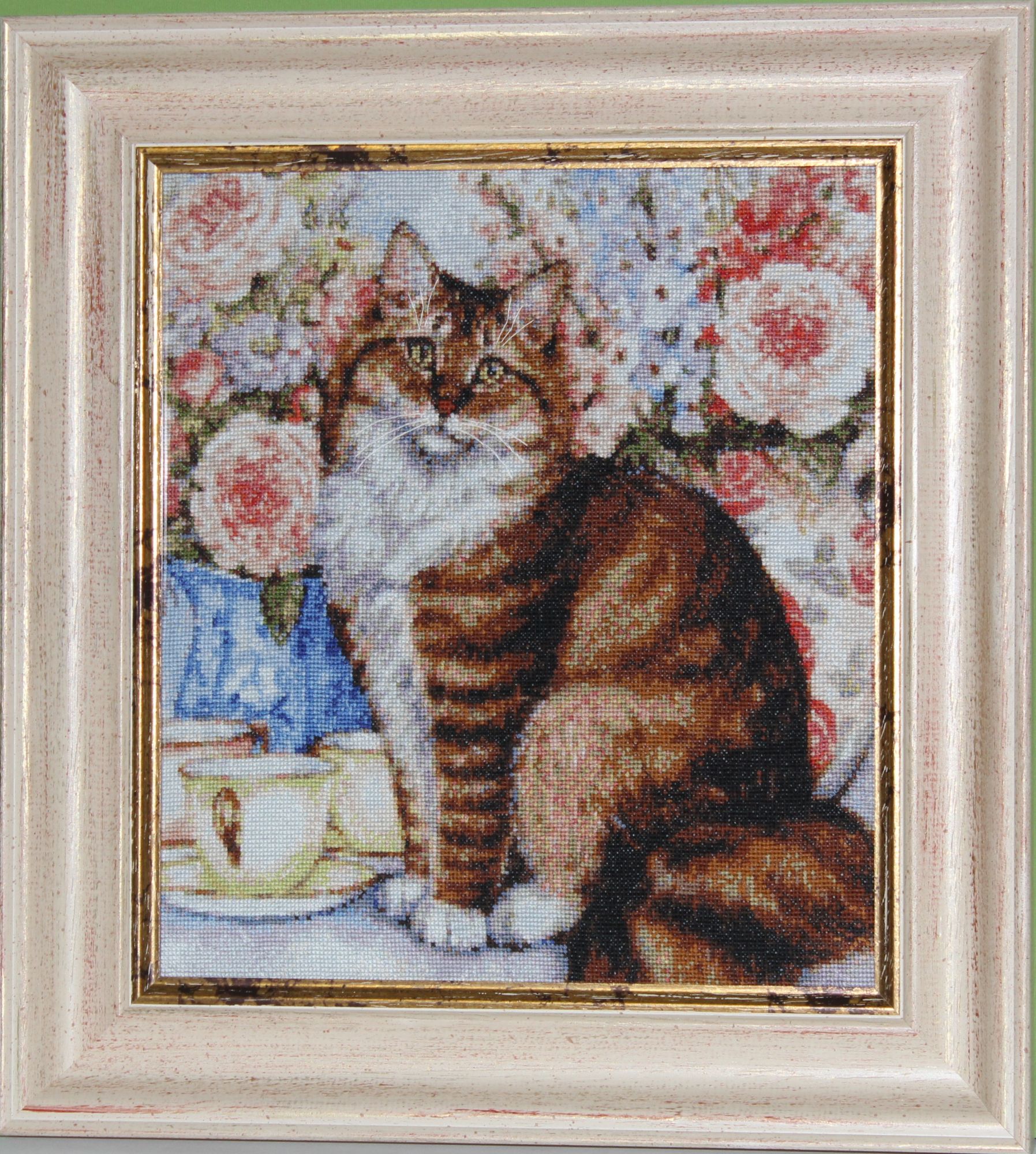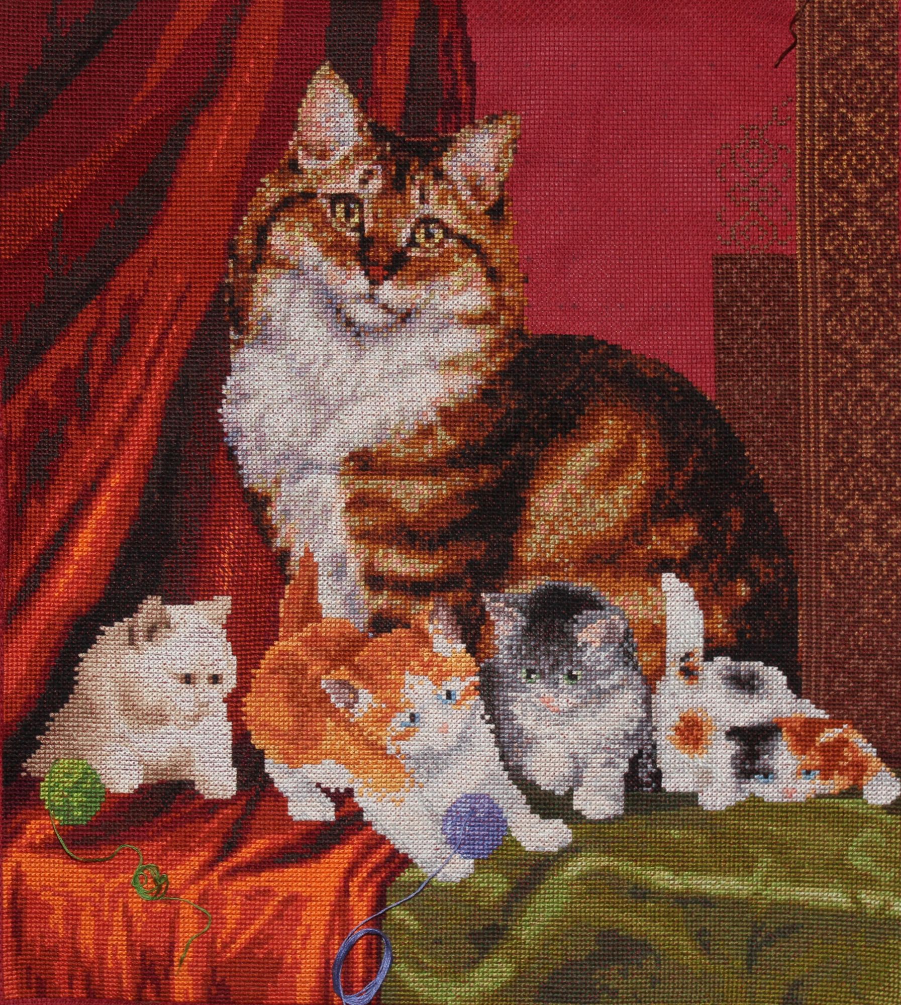 29 декабря 2019 Скрытый текст Дорогие мои гости! Всем доброго времени суток! На исходе месяц декабрь, а с ним и 2019 год. Это значит что пора подводить итоги. Итак, в декабре. ОФОРМЛЕНО. 1). ПУШИСТАЯ КОШКА по набору Кустом Крафт. Схемы в наборах КК не многоцветные. Всего 40. Однако не простые в исполнении. В других вышивках цвета размещены группами. Не без одиночных крестиков, но все же. А в схемах КК одиночки всех цветов прямо по всей вышивке. Этой кошке хорошо подходит коричневый багет, но такой светлый выбрала так как фон в нежных цветах и сочетается с вкраплениями розовых оттенков на багете. К тому же Кошка на софе от этого производителя в таком же багете. 2). КОТЯТА И ЗИНГЕР по набору Мережка. Схема цветная и простая в двух вариантах: с линиями для бэка и без них. Нитки мадейра, которые я люблю как Анкор и ДМС. Схема разработана по мотивам картины всемирно известной нидерландской художницы Генриетты Роннер-Книп, которая прожила долгую, но не легкую жизнь. Я часто люблю разглядывать картины художницы и когда увидела набор, сразу узнала этих котят. Набор купила немедленно.Вот фото картины для сравнения. Только разработчик схемы поменял фон. Вышивала легко и быстро. Две картины я вышила не случайно. И кошка, и котята воплотились в картине, которую я так хотела закончить к концу месяца, но не успела. Пишу что воплотились потому что они уже вышиты. А скатерть и шторы придумывала сама. Без схемы вышивать очень тяжело. Представляешь одно, а на канве получается совсем другое. Приходилось несколько раз пороть и переделывать. В скрытом содержании показываю, но это пока в "сыром виде". Продолжение следует. Скрытый текст Скрытый текст В ПРОЦЕССЕ. Картину я назову "Кошачье семейство".(НЕ ДЛЯ ГАЕЧКИ! Процесс будет выставлен полностью после его завершения так как нет пока титульного фото). Узнаете? Еще два котенка из другой картины, которую надеюсь вышить в январе. Если бы только стена и бэк, я бы, возможно, напряглась и закончила. Но большой участок шторы над головой у кошки буду пороть и переделывать потому что мне не нравится как вышито. makalicha1970, BlueeYeS, Raduga777 и 10 других сказали спасибо Поделиться сообщением Ссылка на сообщение