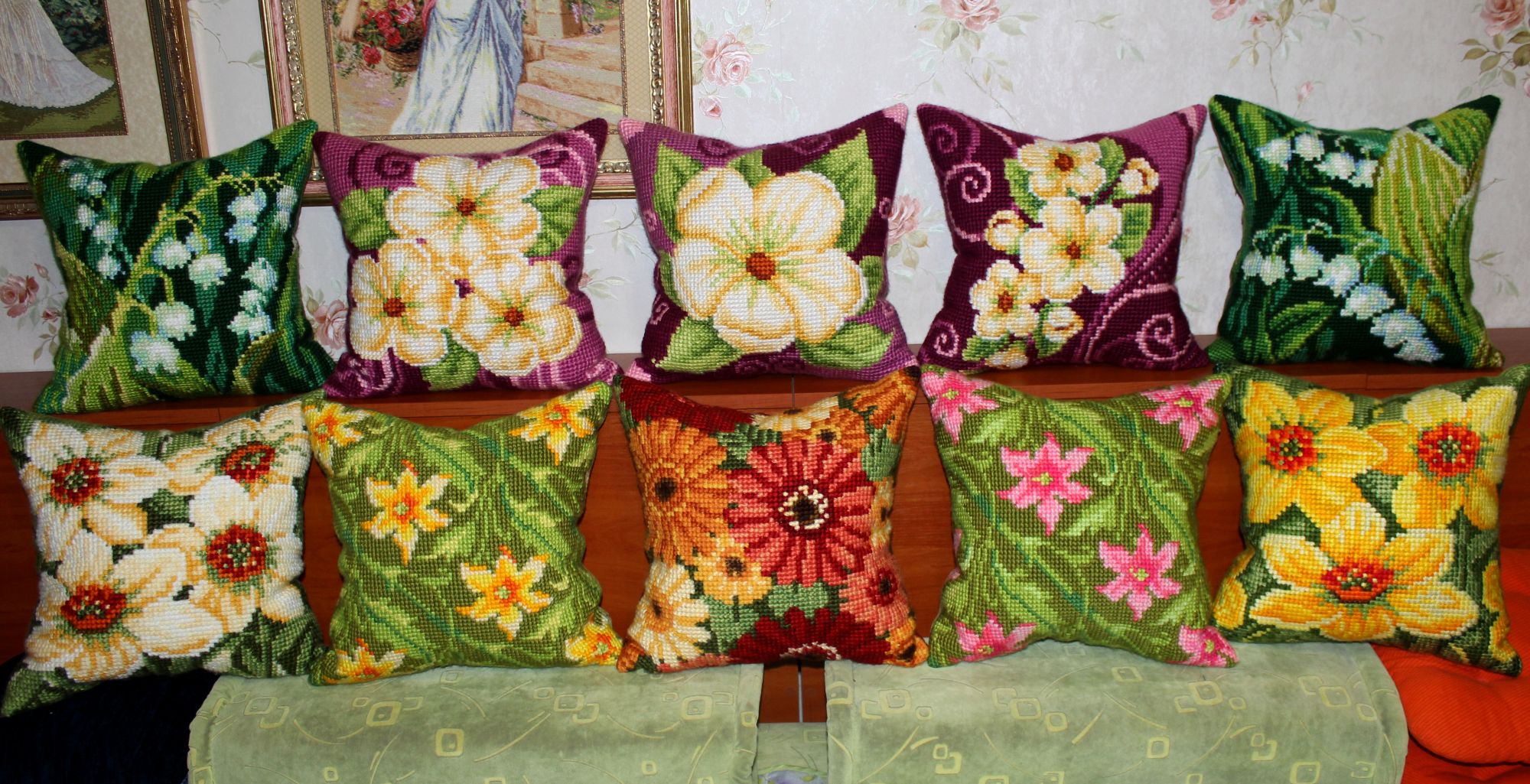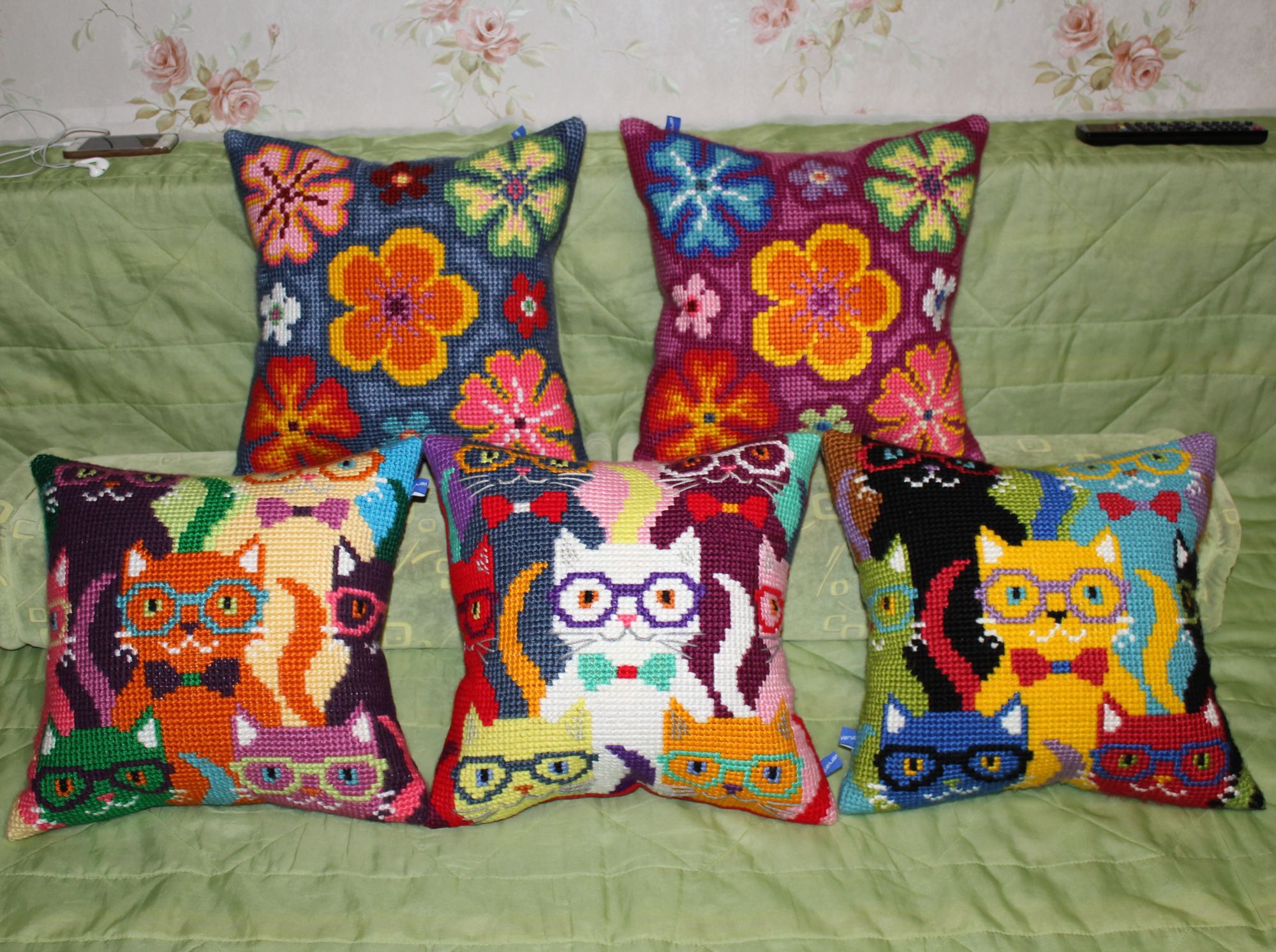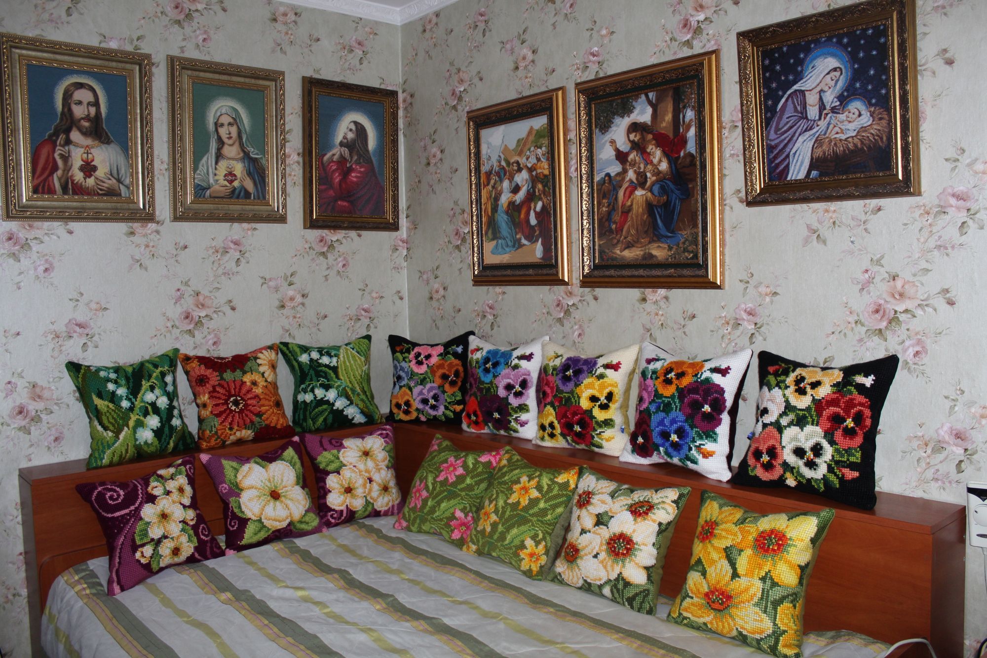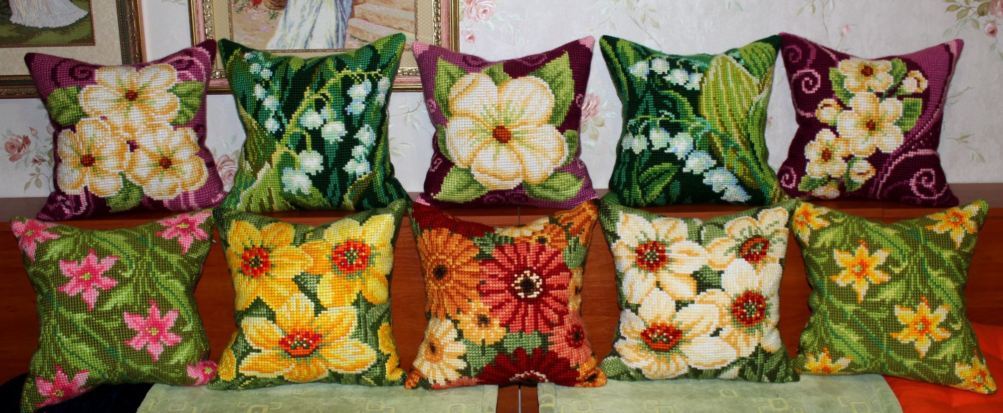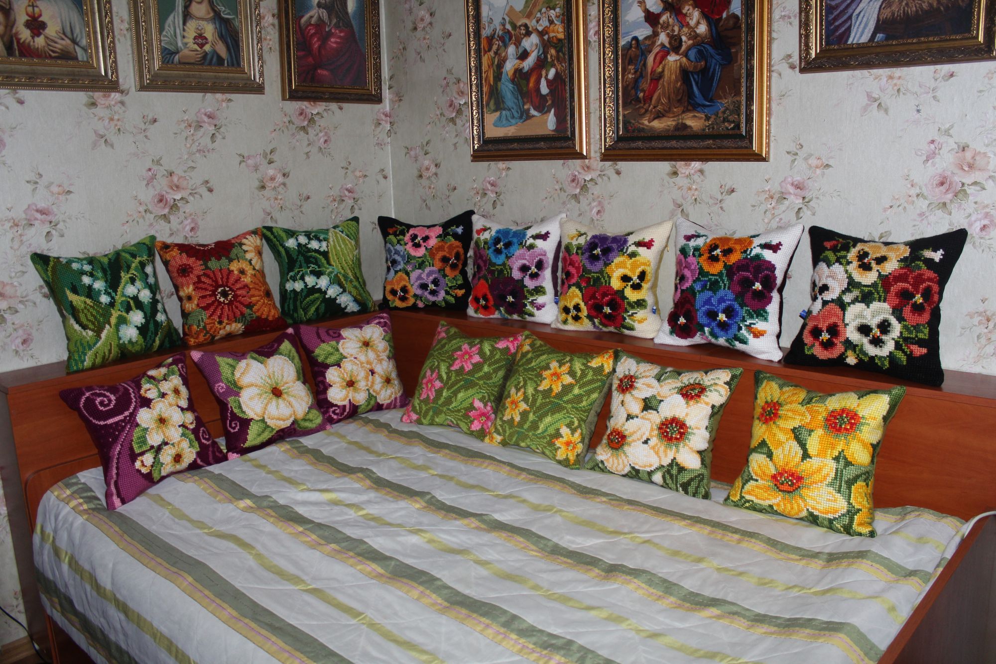 30 декабря 2019 ПРО ПОДУШКИ. Кто о чем, а я о своем. Из подушек с цветами образовались две серии, которые состоят из трех трио и пяти дуэтов. Вот их фото Еще я сделала фото подушек в интерьере и решила показать А теперь подвожу подушковые итоги за весь год. Итак, от Вервако и Коллекшин Д-Арт вышито 22 подушки и один коврик из которых образовано четыре серии: 1).ЦВЕТОЧНЫЙ ОРНАМЕНТ В ЯРКИХ ТОНАХ 2). КОШКИ В ЦЕТАХ 3).АНЮТИНЫ ГЛАЗКИ 4).ЦВЕТЫ Кроме этого от Вервако дуэт длинных подушек И еще дуэт котов от Марьи Искусницы Всего 24 штуки. Если говорить о картинах, то их пять. Вернее три картины и две картинки: Теперь, кажется, все. Буду прощаться. Но прежде от души поздравляю всех с наступающим Новым годом. Девочки, всем здоровья, любви, добра, благополучия и удачи во всем! Юнона1960, ivk_, nata2017 и 19 других сказали спасибо Поделиться сообщением Ссылка на сообщение