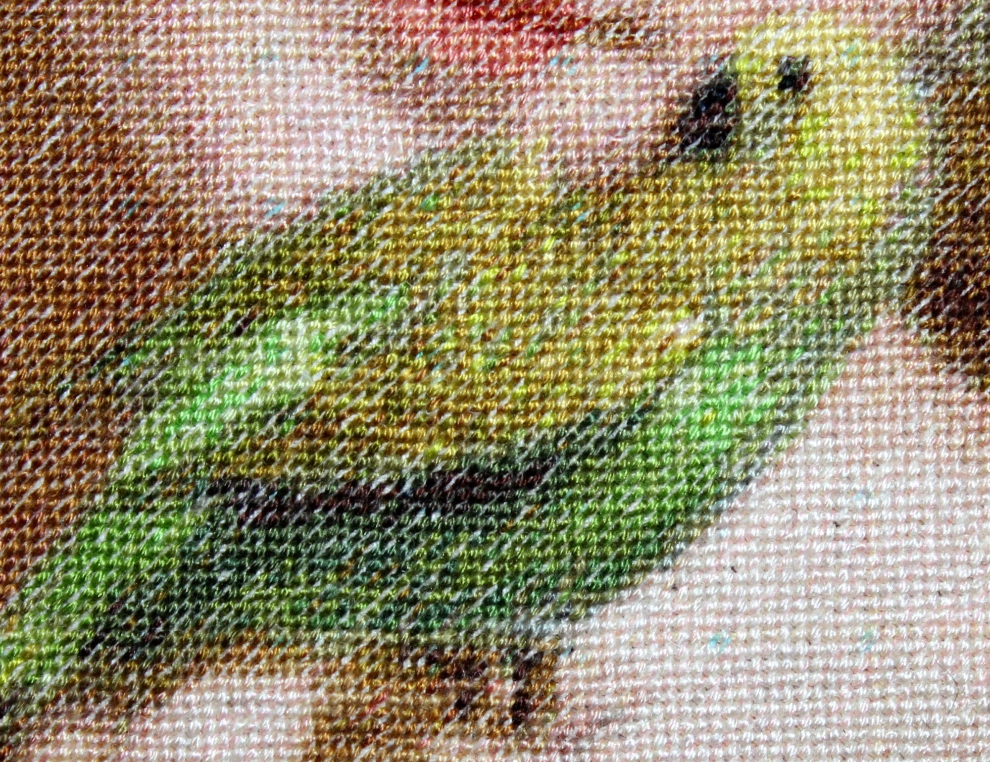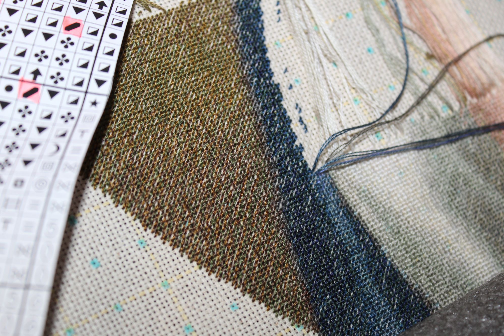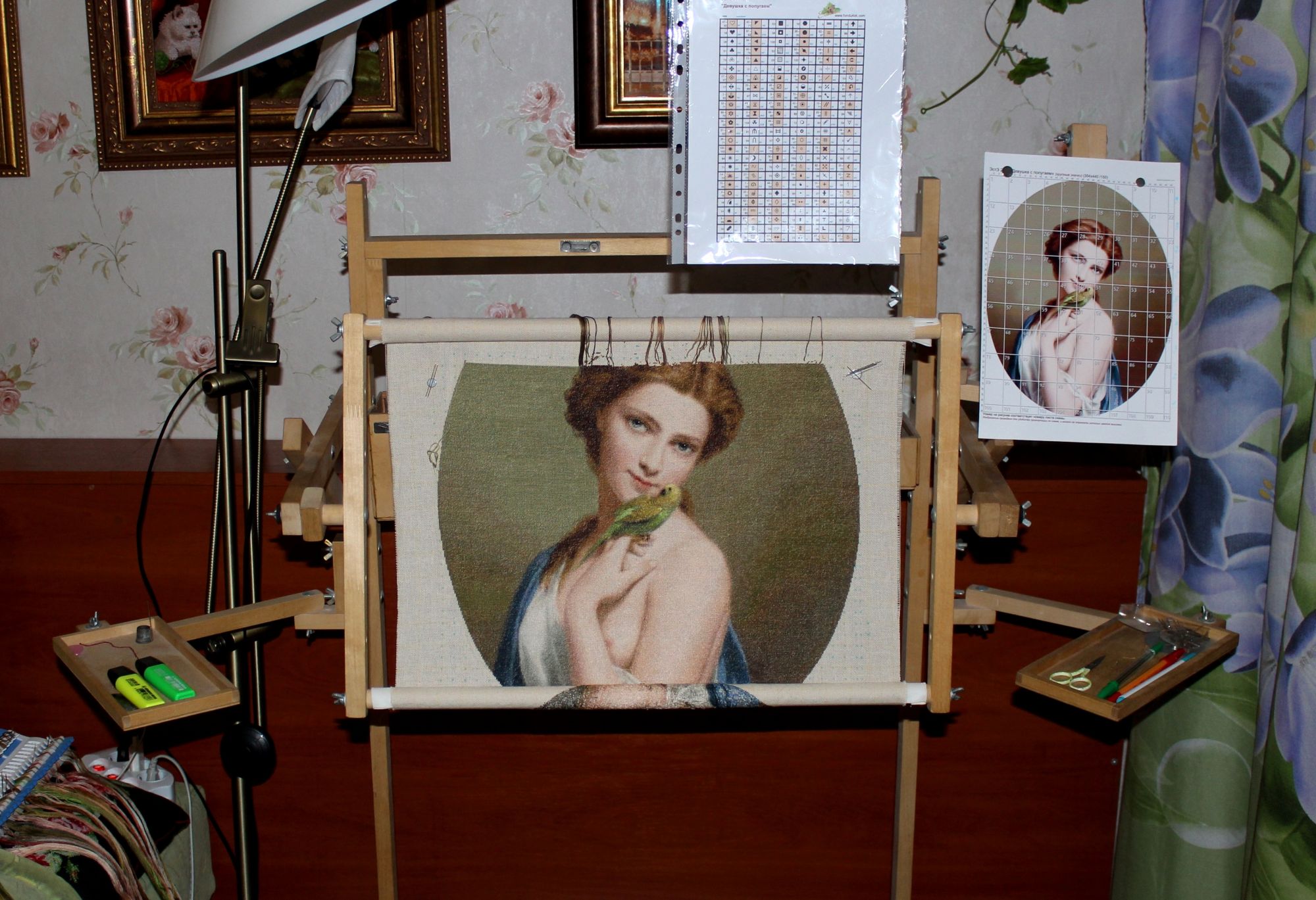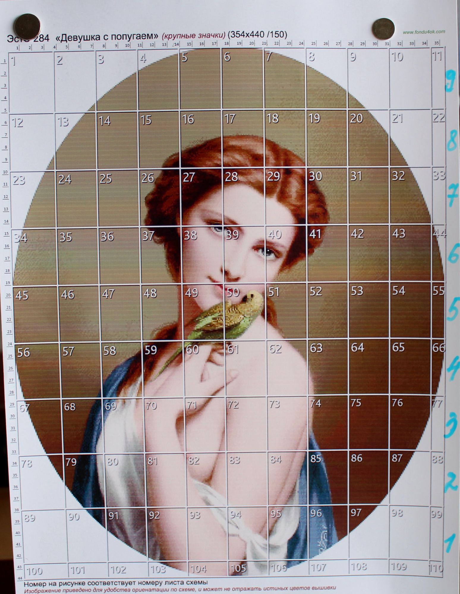 28 мая 2021 Доброго дня всем кто пришел в гости! В конце прошлого года я показала набор, по которому хочу вышить картину. 2 января этого года начала работу над картиной от ЭСТЭ "Девушка с попугаем", которая завершит дамскую серию. На некоторое время работа была приостановлена по причине того что не стало моей мамочки. Она ушла внезапно и тихо. Боль утраты невосполнимая. Я взяла себя в руки и возобновила работу спустя месяц. Вчера закончила и решила показать как вышивала эту красивую девушку. Вот фото с разбивкой по листам схемы. Справа голубым маркером пронумеровала ряды листов. Вышивала рядами слева направо.(Уважаемые модераторы! Все фото не для гаечки так как гаечку вчера "позеленили"!). Вышивала двумя способами. На примерах фото покажу каждый способ. Вот фото, на котором закончен первый ряд. На первый взгляд кажется что вышивка методом парковки. Вообще считается что если нитки паркуешь, то это уже парковка. Я про себя назвала такую парковку "между рядами схемы". Дело в том что она не имеет ничего общего с известными видами парковки ( классическая, ленивая, по цветам внутри квадрата и другими ). Вышиваю я слева направо снизу вверх по рядам переходя от одного листа ряда к другому. Вверху каждого листа есть три ряда, на которых значки напечатаны более светлым шрифтом. Они являются последними в листе вышиваемого ряда и первыми в листе ряда который выше.Я вышиваю вверх до этого светлого шрифта методом "решето"и если такого значка нет в листах справа, то паркую нитку как как раз в светлом ряду чтобы ее не обрывать. Эти нитки на стыке рядов используются после перехода на следующий ряд. Далее про способы. Способ первый. На примере фото второго ряда. На нем видно что вышиты все нитки, которые были запаркованы и перешли с первого ряда. Суть заключается в том что я не ввожу новых ниток пока не вышью запаркованные. Если нитки остаются, то они паркуются в листы следующего ряда ( на фото видно что их мало). После этого я ввожу нитки, которые закончились или которых еще не было в работе и вышиваю так же методом "решето" по листам ряда слева направо . На следующем фото второй ряд закончен, а запаркованных ниток намного больше. Преимущество данного способа в том что иногда хочется отдохнуть и не вводить новые нитки, не обращаться к органайзеру. В ряду много листов и можно несколько дней не трогать органайзер. Недостаток способа в том что приходится повторно возвращаться к каждому листу чтобы вышить значки нитками, которые закончились или которых еще не было. Способ второй. На примере пятого ряда. Вышиваю лист за листом в ряду. Сначала запаркованные нити и тут же ввожу новые. И так до конца ряда. Преимущество : все вышивается подряд и не приходится возвращаться к листам схемы. Недостаток : постоянно напрягаю внимание при вводе новых ниток во избежание ошибок так как блэндов много, цвета едва различимы между собой. В следующем сообщении напишу про ошибки которые возникают в процессе работы. И еще про просветы в вышивке. Ксен40, ЛАДОМИРА, maui и 11 других сказали спасибо Поделиться сообщением Ссылка на сообщение