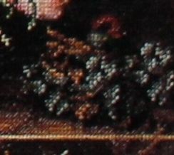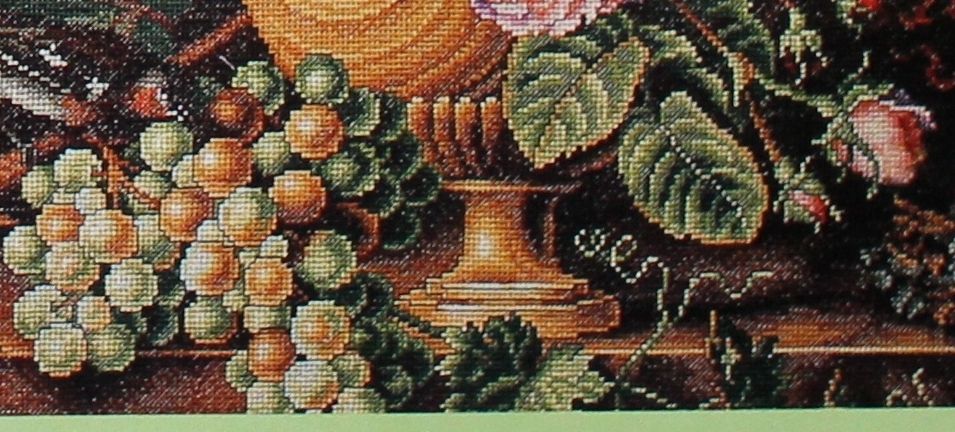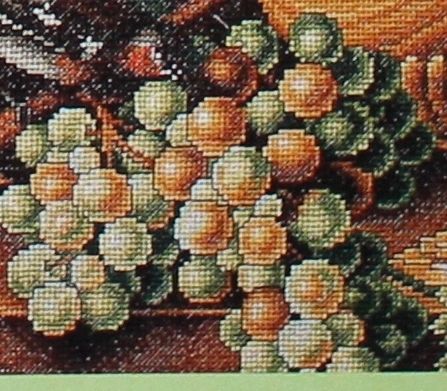4 января 2023 Девятая. Виноград. На него то я сразу не обратила внимания. Работа шла легко, быстро и с песней. Вот фото слева по схеме и справа мое. Такой виноград не пришелся мне по душе. Присутствие коричневого цвета меня огорчило. Думала до Нового года работу завершить, а тут пороть надо много и все виноградинки, в которых коричневый цвет надо переделывать. Такое непринятие вызвано тем что они мне показались подгнившими и кушать такой виноград я бы не хотела. Оставила только песочный цвет и то в минимальном количестве. С правой стороны виноград с чернотой. Я черный цвет заменила на зеленый. Вот оба мои фото для сравнения. АлёNка, Ксен40, BlueeYeS и 12 других сказали спасибо Поделиться сообщением Ссылка на сообщение
