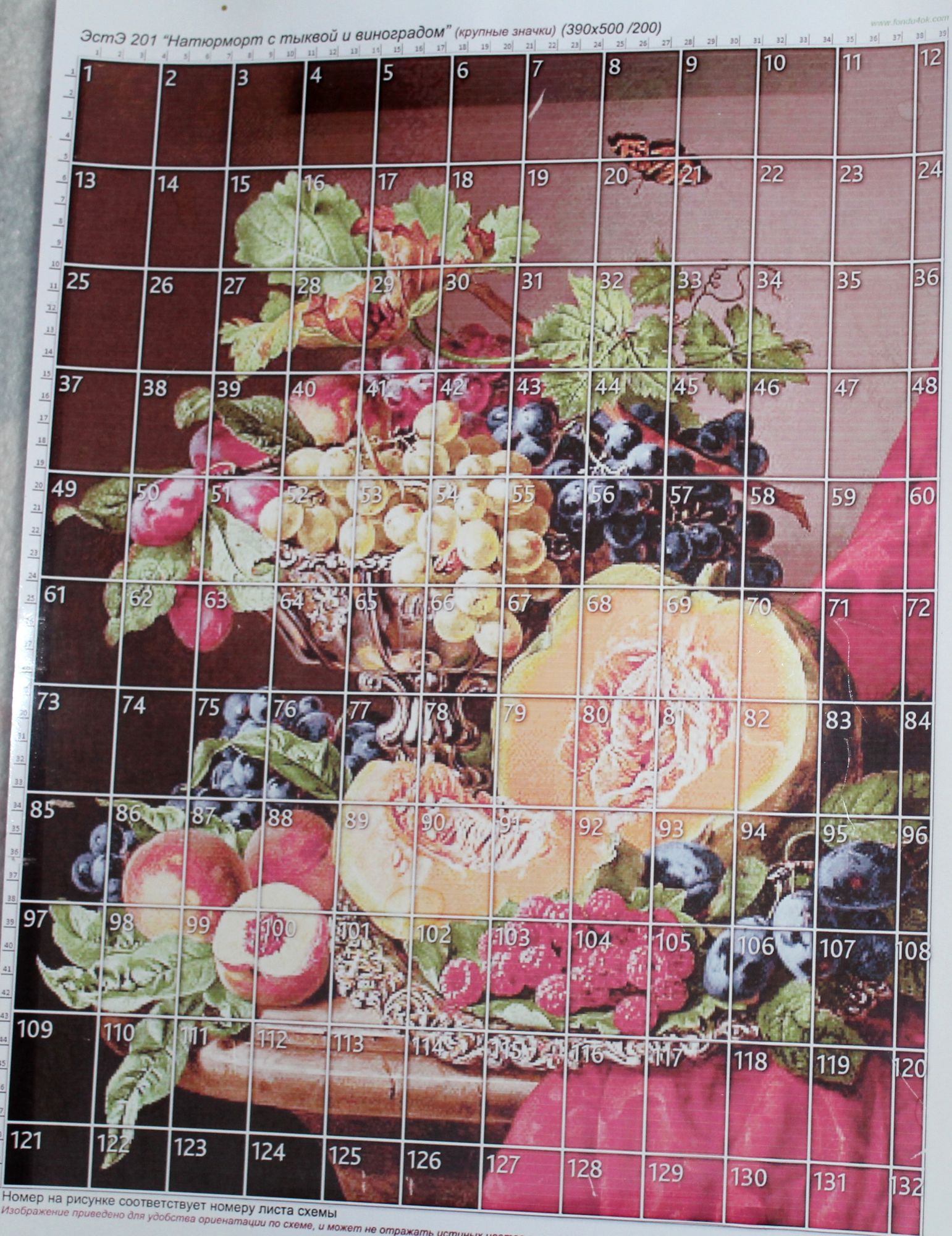 5 сентября 2023 Вот фото с разбивкой по листам схемы. Сильно выгорело так как все месяцы работы было на держателе для схем. Начинаю работу снизу вверх слева направо т. е. с 121 листа. Затем лист за листом до 132 листа. После этого перехожу на ряд выше ( с 109 по 120 листы). И так до самого верха. Каждый лист вышиваю методом "решето", который заключается в следующем. Светлым маркером закрашиваю клеточки с определенным значком, вышиваю их. Затем вышитые полукрестики (или петитки) закрашиваю более темным маркером. Далее выбираю следующий значок и так продолжаю до тех пор пока все значки листа не будут вышиты. Так как вышивка многоцветная, то в листе есть множественное количество одиночек. Причем количество одинаковых значков по одному-два-три. Встречаются и группы значков, но редко. Посмотрите как выглядит схема листа 101. Это часть блюда на котором лежат тыква, малина и сливы. Valvariella, Zanfiska, svetlana62 и 8 других сказали спасибо Поделиться сообщением Ссылка на сообщение