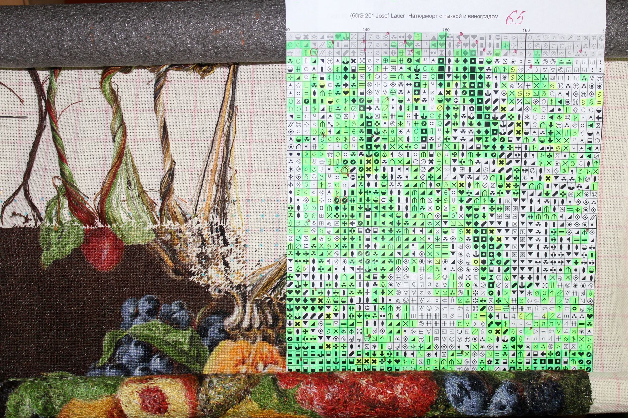 5 сентября 2023 Добрый вечер всем! Я пришла чтобы написать и показать как работала над Натюрмортом с тыквой и виноградом. Работа над этой вышивкой значительно отличается от работы над предыдущим натюрмортом, который выполнялся методом парковки. Раньше я писала что наконец то осилила парковку. Это правда. Даже время занимает почти как при работе обычным методом так как довела работу до автоматизма. Но это касается вышивки крестиком. Данный натюрморт выполнялся техникой петит-полукрест на канве ДМС 25 каунта разлинованной квадратами 20 на 20 клеточек. Если использовать канву 18 или 16 каунта то размер вышивки будет значительно больше. Тогда картины у меня поместятся только в один ряд. А нужно чтобы было два ряда картин. Размер вышивки 500 на 390 клеточек. В сантиметрах после стирки получилось 48,5 на 37,5. Количество цветов 200. Я не умею вышивать полукрест парковкой. Вернее знаю как, но на практике мне трудно. Надо считать четные и нечетные ряды. В четных рядах отсчет идет справа налево, а в нечетных - слева направо. Короче говоря, запутаешься. Поучиться можно на простой вышивке.Продолжение следует. Путешественница, АлёNка, svetlana62 и 8 других сказали спасибо Поделиться сообщением Ссылка на сообщение