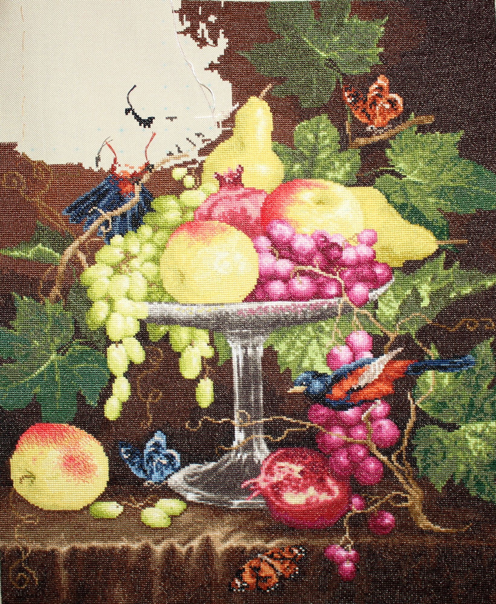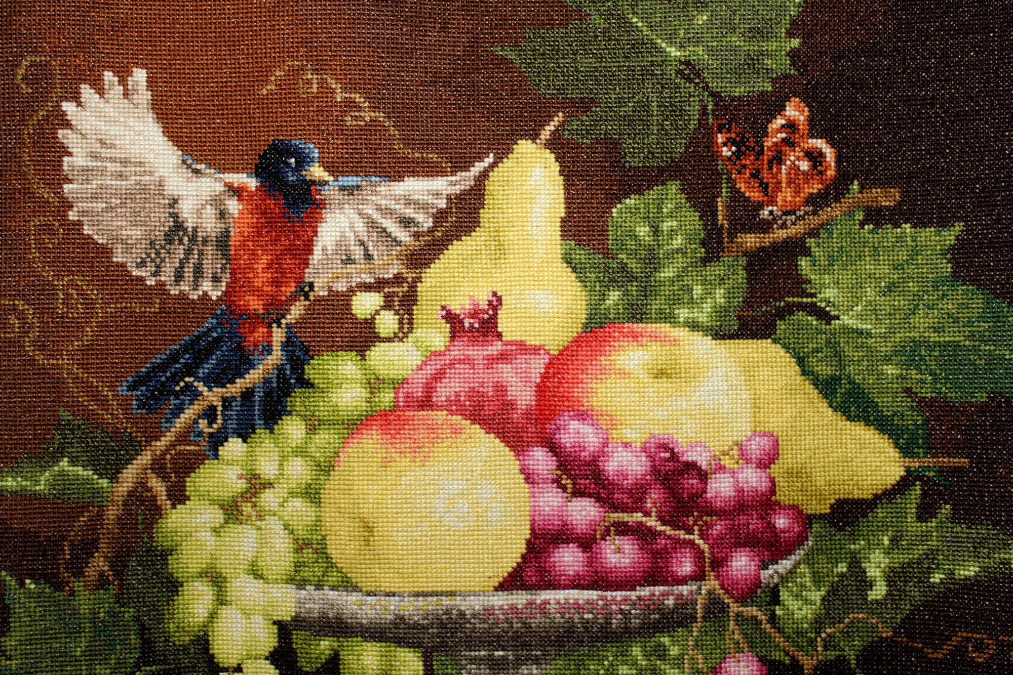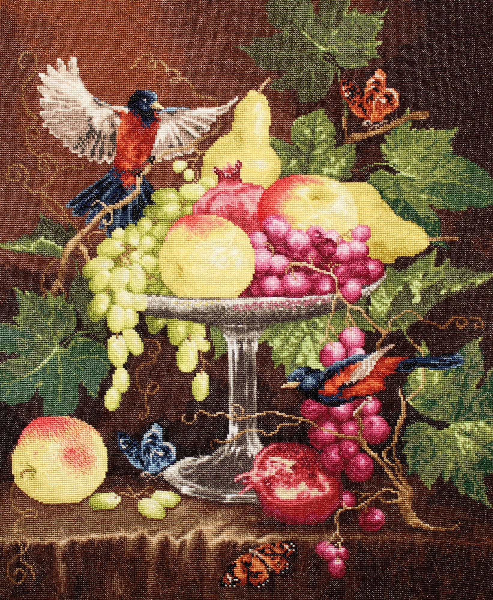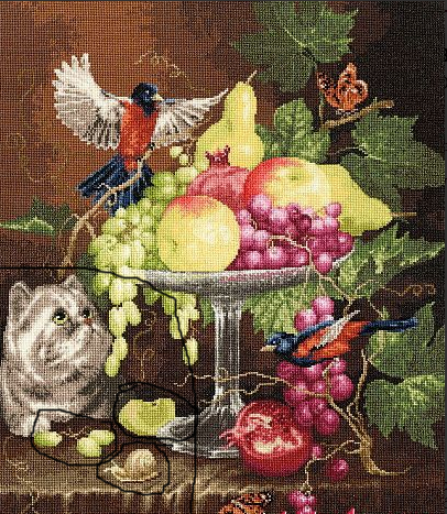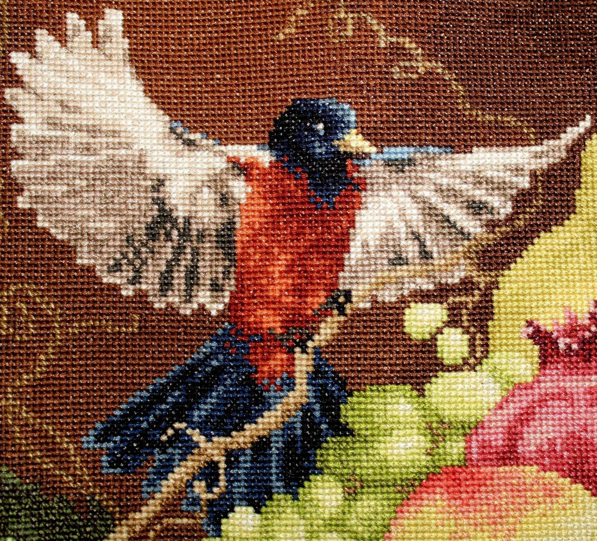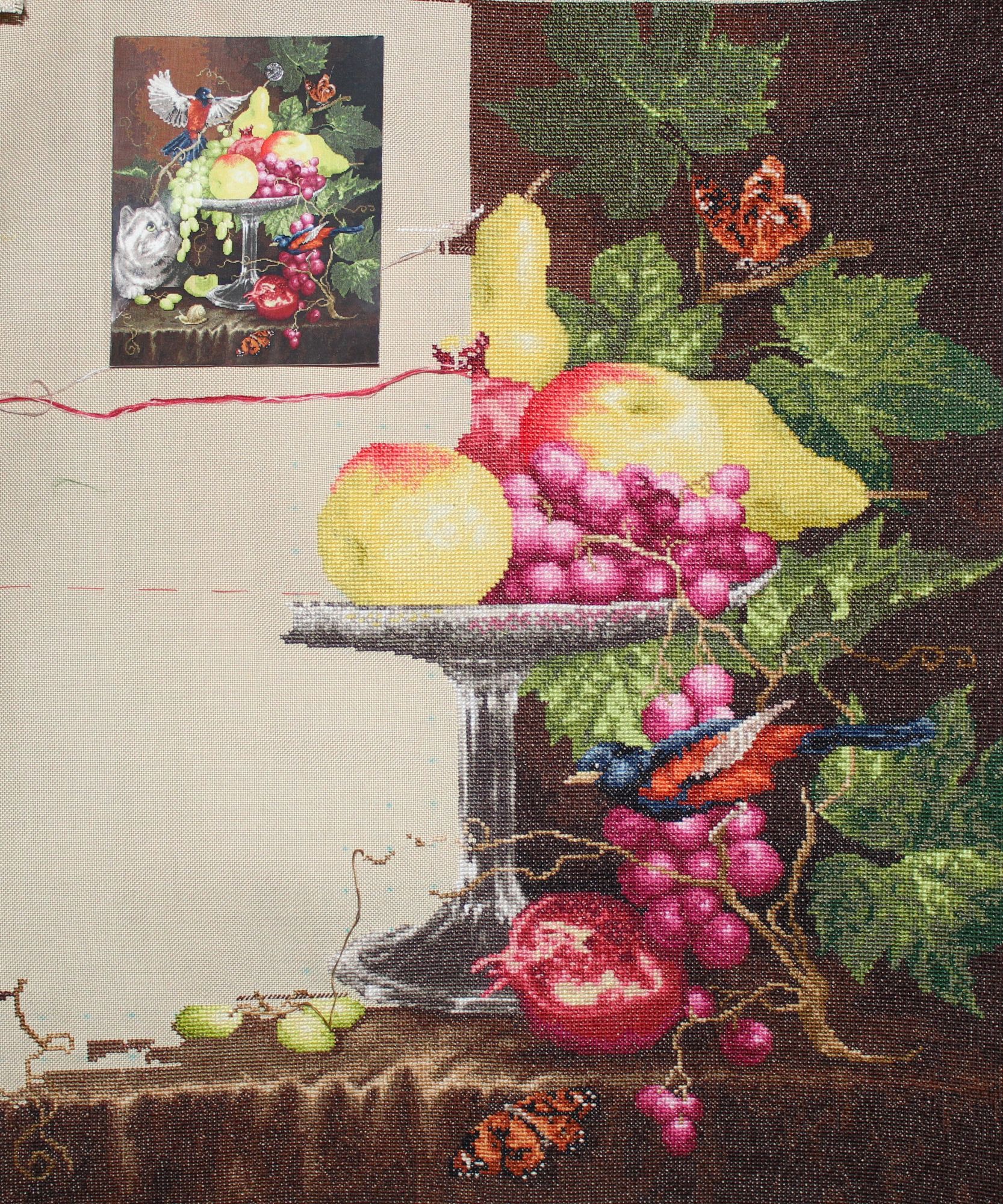 5 сентября 2024 17 часов назад, Ярославовна сказал(а): Татуся! Все фото ниже не для гаечки! Покажу на фото как это было. Не понравились мне улитка и долька яблока на столе. На место улитки "передвинула" виноградинки. На месте дольки яблока вышила вторую бабочку. Вместо котика вышила яблоко над которым лист винограда. Виноградный лист очень похож на остальные листы поэтому хорошо вписался и не нарушил стиль написания самой картины. Канва в наборе была 18 каунта. Я заменила на равномерку 28 каунта и вышила крестиком через одну нить основы. Таким образом был достигнут нужный размер вышивки по вертикали. Очередной красивейший натюрморт. И как мне нравится во многих работах тон в коричневых тонах! Изменения пошли на пользу. Котик с улиткой здесь смотрятся не очень. А крестиком через одну нить основы в две или одну нить? 18я канва и так мелкая,а тут еще и через одну нить.... asdfgh090490, Ярославовна и Betta сказали спасибо Поделиться сообщением Ссылка на сообщение