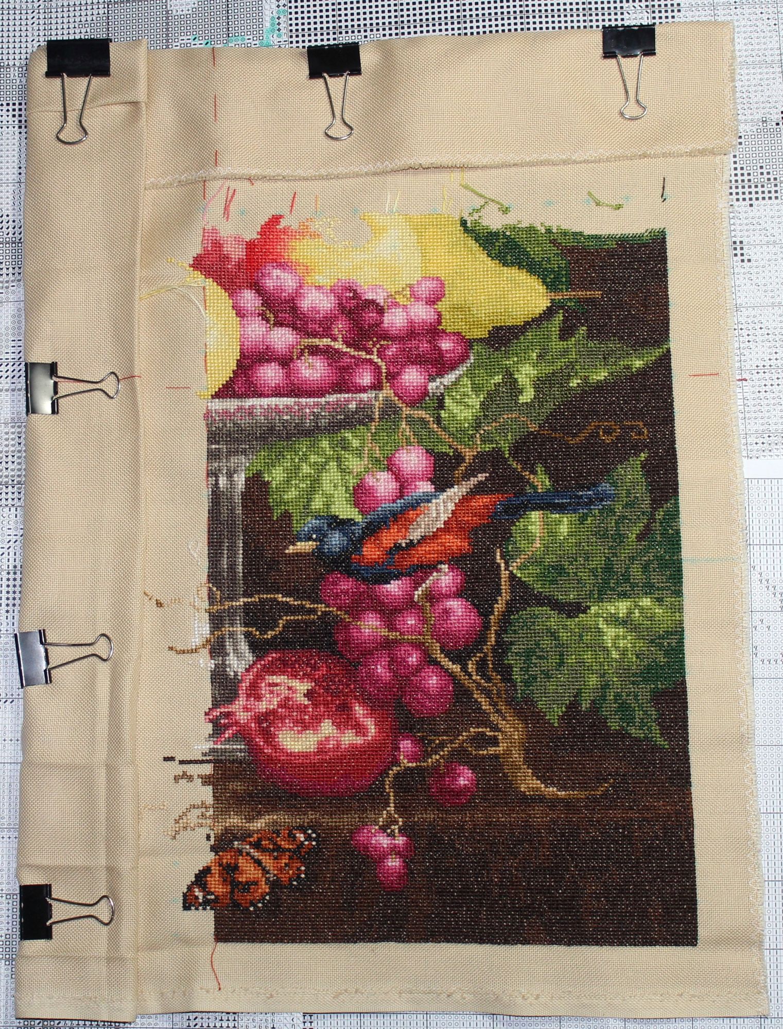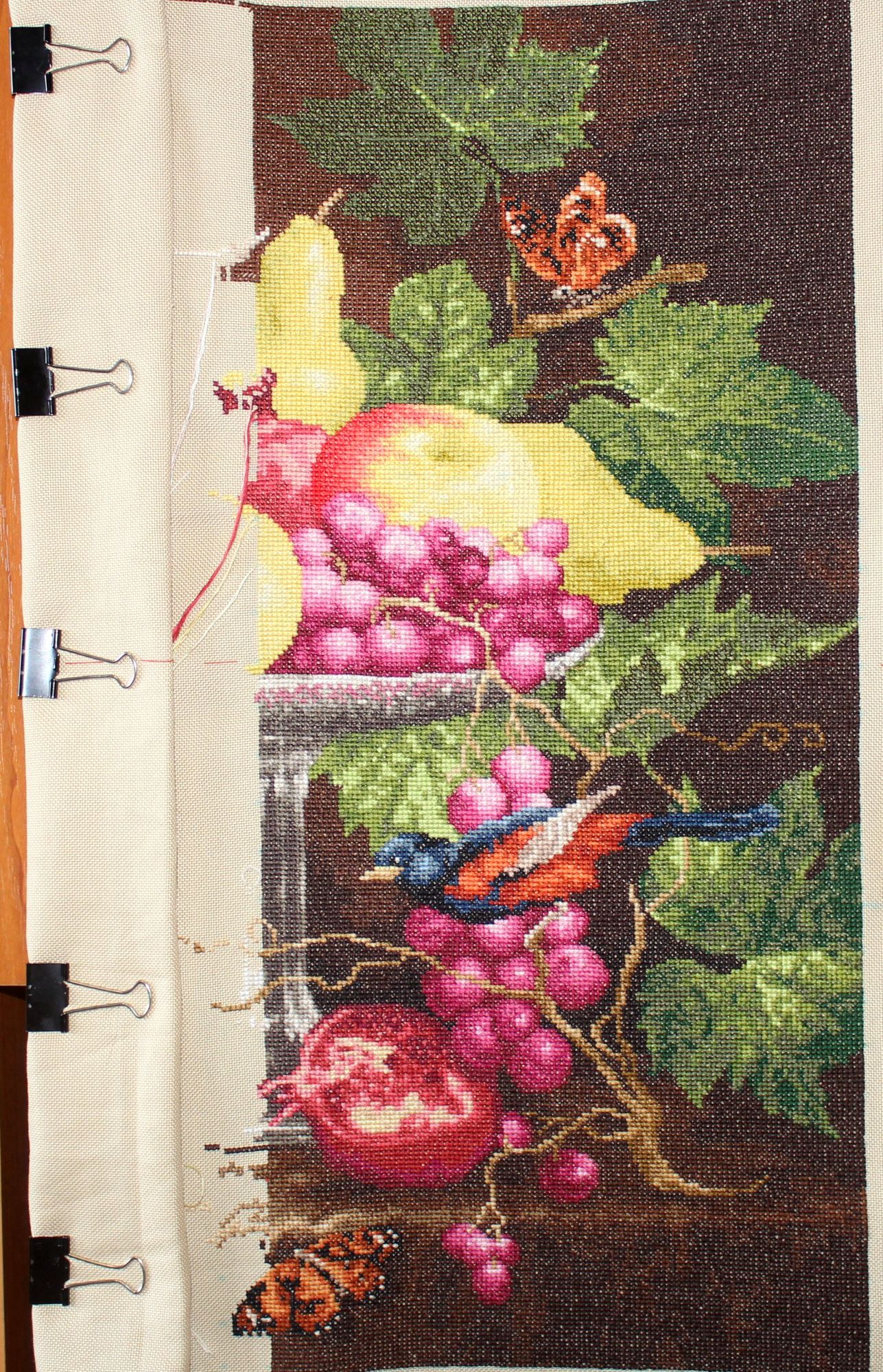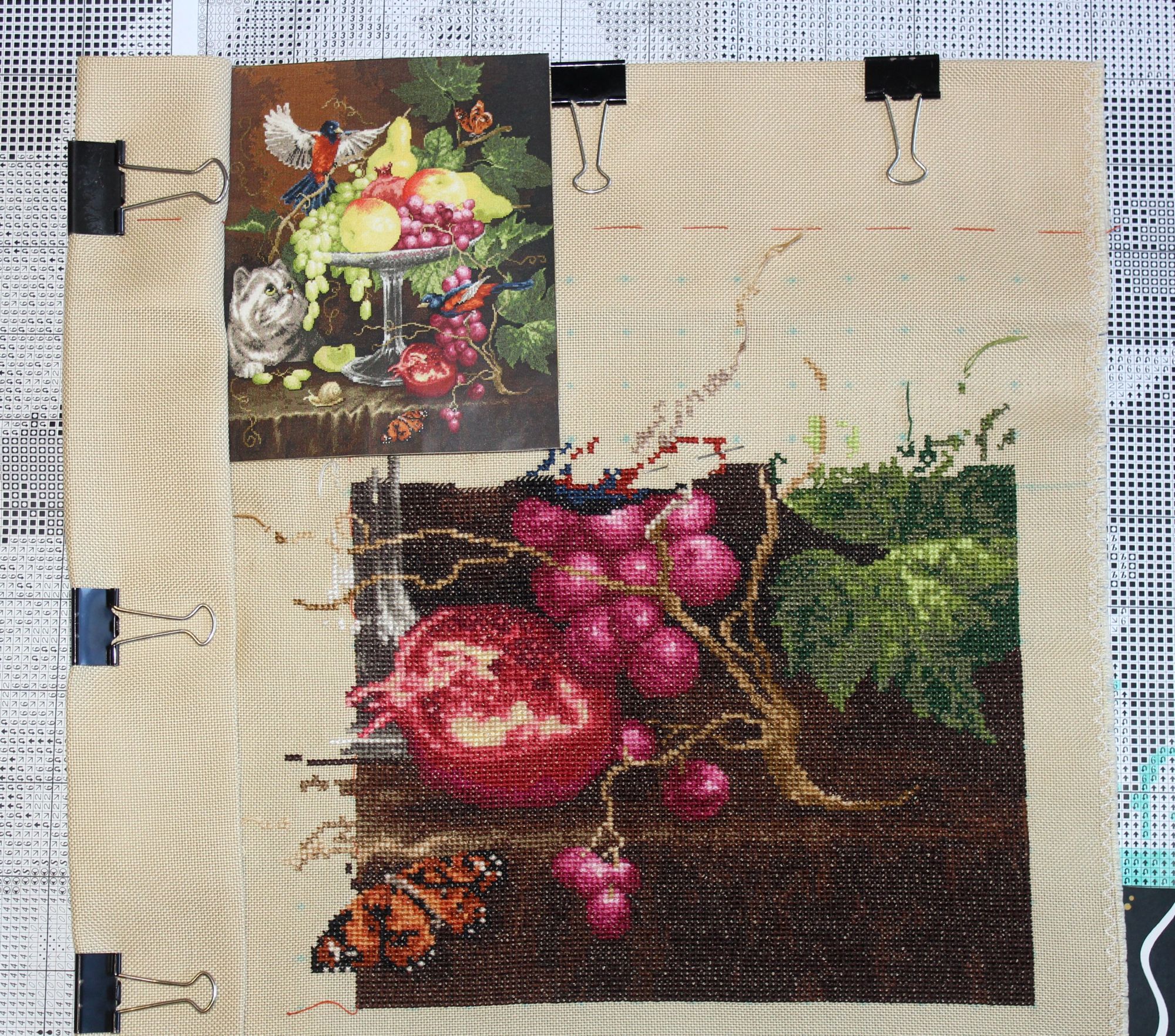 4 сентября 2024 Татуся! Все фото ниже не для гаечки! Покажу на фото как это было. Не понравились мне улитка и долька яблока на столе. На место улитки "передвинула" виноградинки. На месте дольки яблока вышила вторую бабочку. Вместо котика вышила яблоко над которым лист винограда. Виноградный лист очень похож на остальные листы поэтому хорошо вписался и не нарушил стиль написания самой картины. Канва в наборе была 18 каунта. Я заменила на равномерку 28 каунта и вышила крестиком через одну нить основы. Таким образом был достигнут нужный размер вышивки по вертикали. Хозяйка смешных зверей, Sky026, nogres и 8 других сказали спасибо Поделиться сообщением Ссылка на сообщение