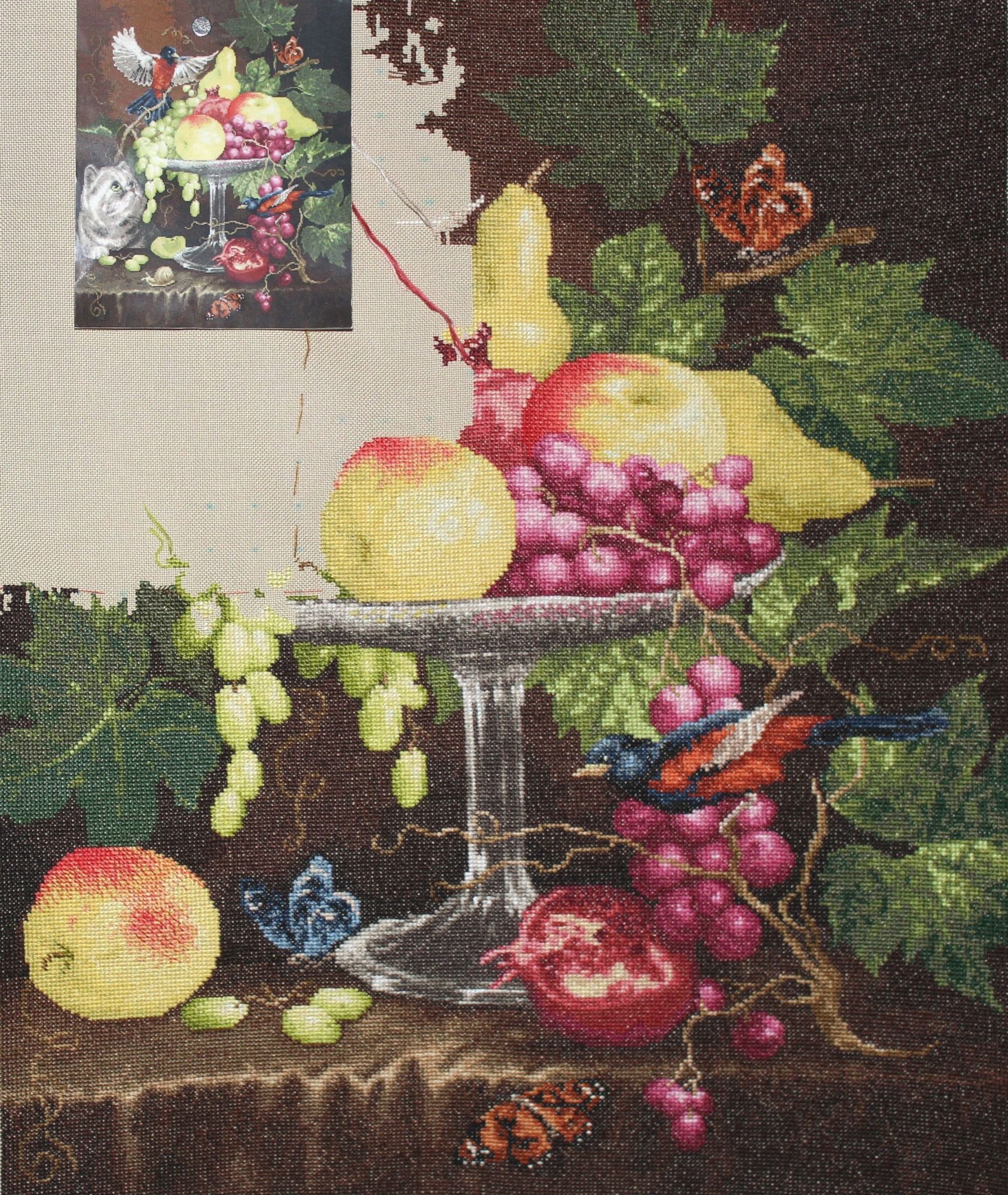 4 сентября 2024 Всем привет. Наконец добралась до ноутбука. В течении дня заходила на сайт но писать с телефона не могу. Напишу как вышивала работы. ВАЗА С ФРУКТАМИ. Читала разное про работу над этой вышивкой. Одна вышивальщица пишет что работа настолько легкая что ее можно рекомендовать только для начинающих. Другая девушка писала что вышивала несколько лет и претерпела муки во время работы. Для меня лично схема легкая, но не настолько чтобы уж совсем. Как и в каждой работе есть участки простые, есть посложнее. Работа шла быстро. По времени всего 1,5 месяца. Как вы заметили вышила я натюрморт без котика. Он милый, но у меня столько вышитых котов, что видимо наелась и сосредоточилась на цветах и фруктах. Более того, этот натюрморт войдет в серию "Натюрморты с птичками" и я захотела чтобы других персонажей не было. В фоне присутствовал черный цвет. Я его убрала и вышивала темно-коричневым. Далее все цвета фона меняла на один или два тона светлее. Изменения ( без них у меня никак не получается) претерпел только нижний левый угол схемы. Сибирская Кошка, Хозяйка смешных зверей, svetlana62 и 7 других сказали спасибо Поделиться сообщением Ссылка на сообщение