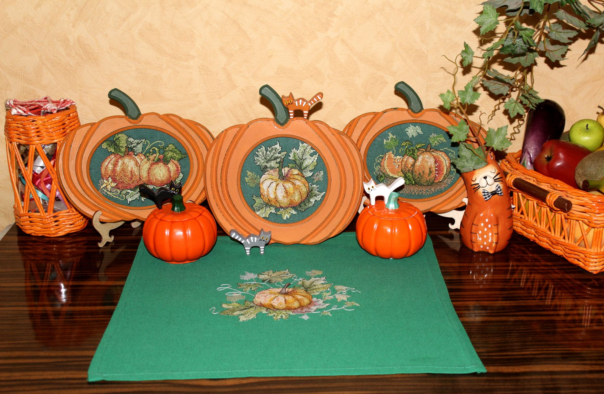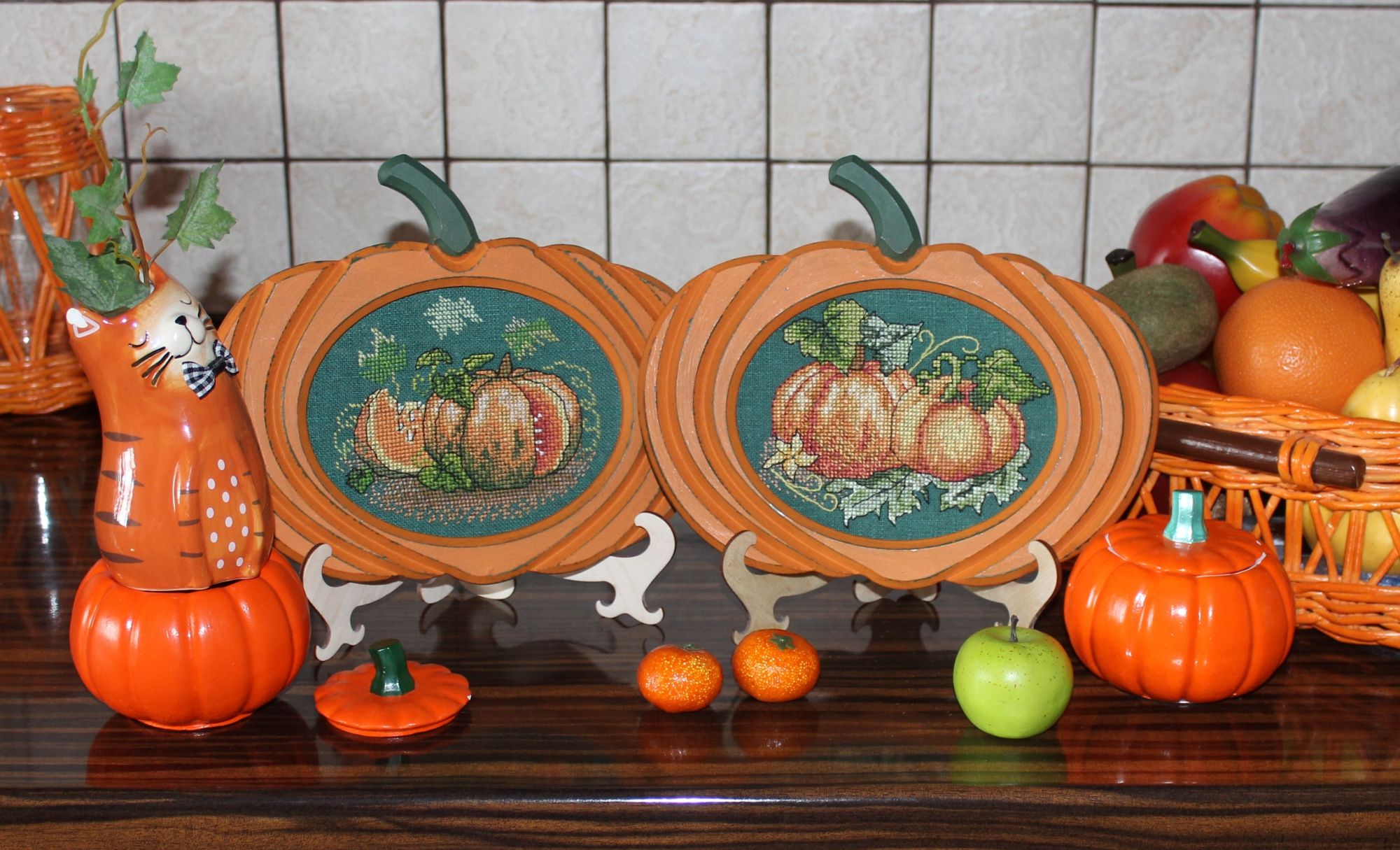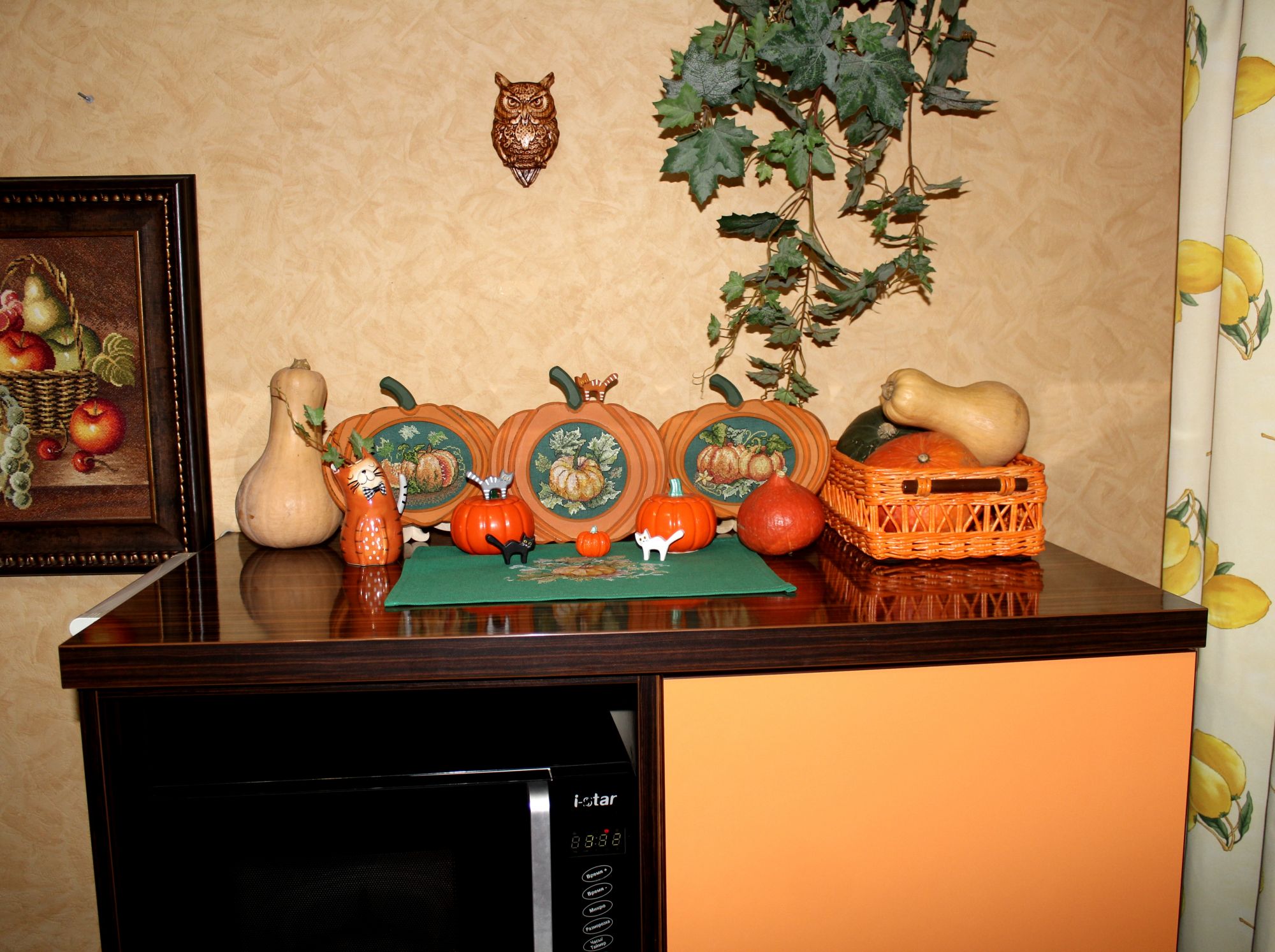 26 октября 2025 10 часов назад, asdfgh090490 сказал(а): Галина Ярославовна! Я в полном восторге от вашей тыквенной композиции! Продумано все до мелочей. И место для композиции выбрано очень удачное. Получилась такая рыжая красота. А тыквы в корзине настоящие? Спасибо, Арина. Три тыквы в корзине, а так же маленькая рыжая справа и длинная светлая слева настоящие. Это меня знакомая угостила своим урожаем. Эти тыквы, пока мы их не съедим, будут на поверхности шкафчика. Постоянно в корзине будут находиться пластмассовые овощи и фрукты. Их я пока убрала в две вазы. Фото для наглядности сделала и с искусственными овощами и фруктами, и с настоящими тыквами. Bogdan, svetlana62 и nata2017 сказали спасибо Поделиться сообщением Ссылка на сообщение