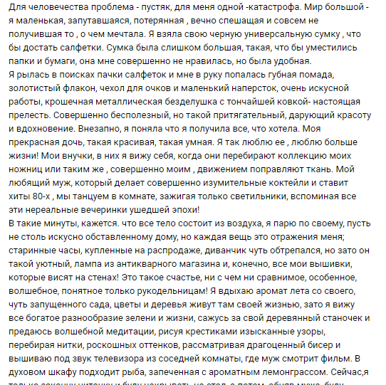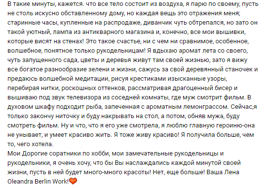 12 марта 2019 51 минуту назад, Luba52 сказал(а): А подарки надо отрабатывать... Да блогеры-то об этих подарках и не просили. Она же целенаправленно их рассылала, да ещё такие шикарные, чтобы человека привязать, чтобы люди себя должными чувствовали. Исайкина вчера говорила, что она и ей что-то дорогое присылала, а когда Юля ей прислала ответный подарок, была этим крайне недовольна. Она любит, чтобы люди чувствовали себя должными. Понятно, что прямо так не говорится "я тебе подарок - ты обо мне говоришь только хорошее", но очередная манипуляция с её стороны. Она даже Маринке Прок присылала кучку Милл Хиллов для рекламы, пыталась ко всем примазаться. Другой вопрос, что некоторые за бусинки, сюсюканья и благосклонность самой Елены, всей такой возвышенной и утончённой (ага) и правда готовы замараться обо всякое злое лесное. Вообще у её магазина изначально была такая подача причастности к, прости господи, рукодельной элите (я бы сказала на интернет-сленге "илитке"), когда у них заказываешь. Вот тебе и Леночка в жемчугах и дорогих шелках шлёт шикарные подарочки и сюсюкается в переписке и комментариях, как с подружкой. Многие с такой Леночкой в жизни-то никогда не пересекутся, потому что вращаются в абсолютно разных социальных кругах, а тут она с тобой такая мила-милая и многим это льстило. Сейчас-то все умные, довольно понятно, что она за птица. А тогда (да, в принципе, и совсем недавно) многие хотели заиметь себе такую модную знакомую. Она очень активно работала над созданием своего образа и образа магазина. Это сейчас инстаграм стичинко выглядит стрёмно, а раньше Мила делала красивые фотки (какие-то сама, а какие-то воровались, правда)), писала тексты, шикарные тексты писал Роман (мне такое не нравится, но многие прямо пищали). И всё такое изысканное, утончённое с претензией на элитарность. И к блогерам она примазывалась, чтобы их репутацией перед аудиторией махать. Она тогда и на летнем эфире говорила, что хотела в экран показать, сколько Сола Хобби, Оксана и Люда у неё много заказов сделали в подтверждение своей порядочности (но девочки не разрешили). Вроде как, смотрите, какие люди много у меня покупают, не могут же они плохое хвалить. Я уже неоднократно говорила, что ту же Оксану она пережуёт и не подавится. Она даже ей вовремя не удосужилась посылки слать. Нимуэ, Irina 1, Гармония и 6 других сказали спасибо Поделиться сообщением Ссылка на сообщение