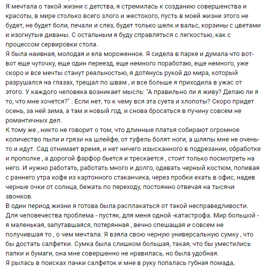 12 марта 2019 12 минут назад, карменсита сказал(а): . Многие с такой Леночкой в жизни-то никогда не пересекутся, потому что вращаются в абсолютно разных социальных кругах, а тут она с тобой такая мила-милая и многим это льстило. Сейчас-то все умные, довольно понятно, что она за птица. А тогда (да, в принципе, и совсем недавно) многие хотели заиметь себе такую модную знакомую. Ой, ну какие круги...Лена- человек с кучей комплексов, скорее из малообеспеченной семьи, от свалившейся в Америке возможности покупать, поимела манию величия...к чему тут примазываться и с лупой не видно...) Irina 1, Толика и Слонопотам сказали спасибо Поделиться сообщением Ссылка на сообщение