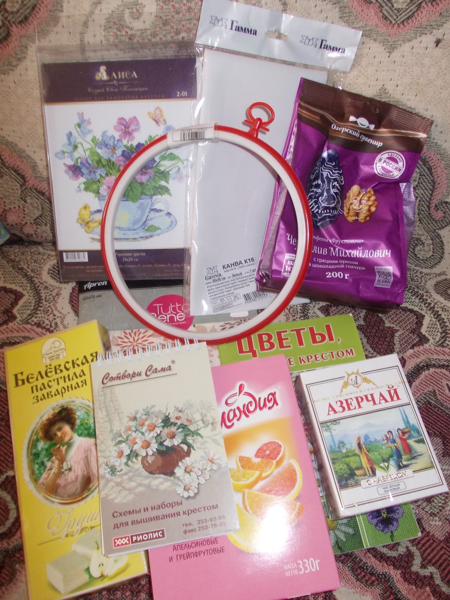 1 августа 2016 Девочки, я добралась до Украины, очень жарко. Саша оказалась такая же чудесная, как я думала и даже лучше. Я получила огромный сборный подарок- набор для вышивки Алисы с цветочками, отрез белой канвы, фирменный блокнотик Риолиса, пяльца-рамку, книжечка со схемами цветов, красивейший кухонный фартук, чай и куча сладостей (пастила, мармелад, чернослив в шоколаде). Это целое приданое!! Сейчас всё собрала вместе и засняла. Чай и сладости употребим с многочисленными родственниками и гостями. Огромное спасибо за встречу и подарки! Пы.сы. Кофту примерила? ЛюдмилаЕр, Графиня, Catopuma и 16 других сказали спасибо Поделиться сообщением Ссылка на сообщение