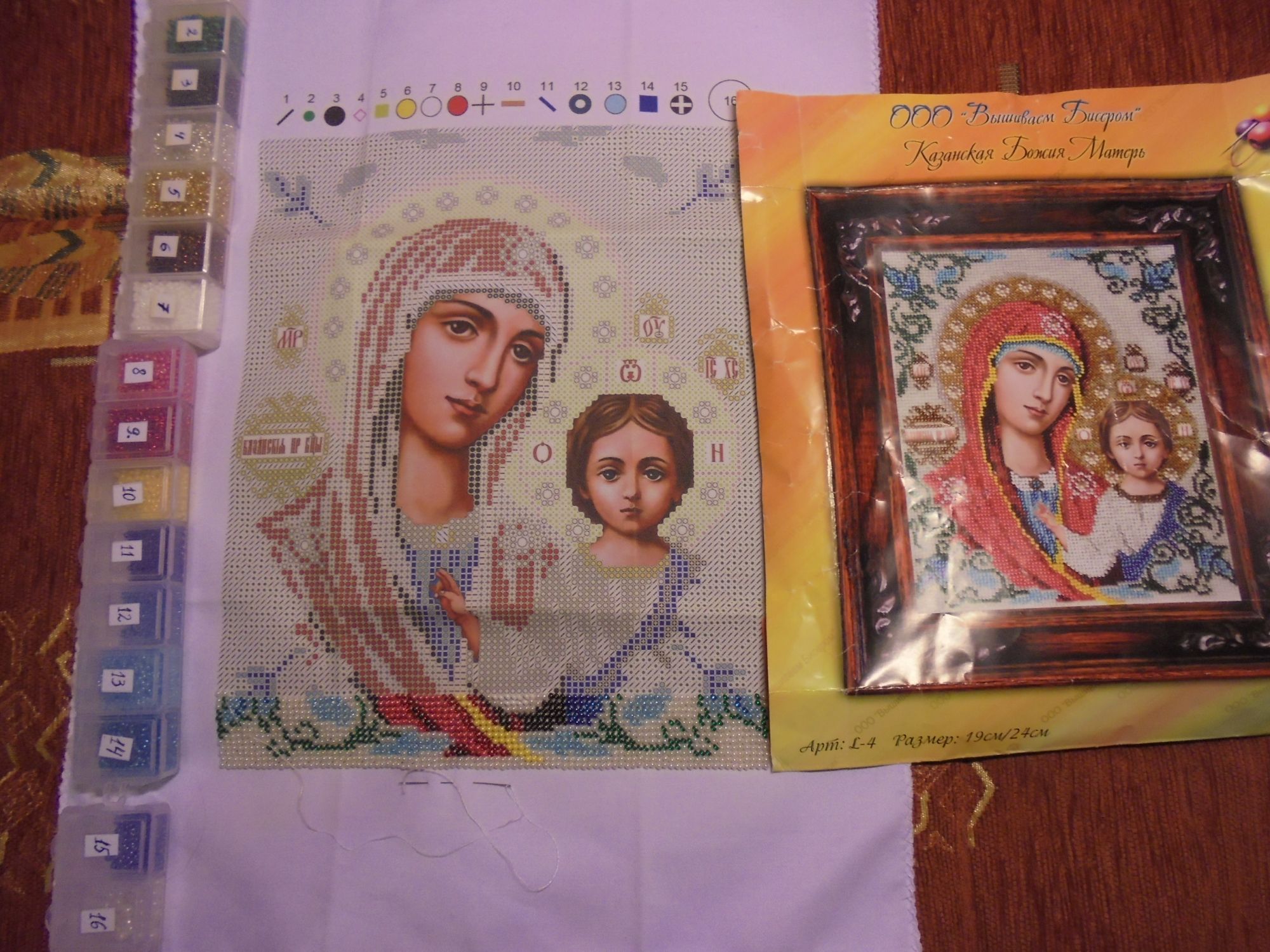 23 апреля 2019 Всем-всем привет!!! 1. Немного прибавился гобелен, и в очередной раз отправлен на "каникулы"....Осталось 1/4 .....надо бы закончить, но идет очень медленно. 2. Начала новый бисерный процесс "Казанская Божия Матерь" 3. Чуть-чуть продвинулось Половодье, вышиваю исключительно перед сном по паре ниточек, когда организм уже почти спит. А здесь думать не надо, пока в работе идет три цвета. Немного разочарована голубым цветом - на картинке от набора он такой яркий и радостный, в реале нежный, если не сказать - блеклый, хотя по сюжету именно такой подходит больше. Еще в феврале заказала и получила из багетки рамку и доп. паспарту для "В его руках" от Дим,.... приложила , но натянуть не успела - почему-то рамка кокнулась и разлетелась не несколько частей (благо стекло не заказывала). Осталось только примерочная фотка....эх, теперь снова надо заказывать, но уже будет выбран другой багет(что-то приближенное к этому по ширине и цвету)....этот сразу показался хлюпким, соединение уголка образца уже было поломано)))) Первое фото со вспышкой, второе без. Выкладываю для истории. Да,.... использовано тройное паспарту. И еще.....смотрите какие тюльпаны ))))))))) какой димовский набор напоминают????? Правильно ))))-----знаменитые тюльпаны. Помню некоторые девушки выдвигали версию что в димовском наборе -не тюльпаны, а пионы. Когда недавно мне подарили этот букет - первая мысль - обязательно показать Вам для сравнения , вместе с моим любимым набором. Aleksacha , оленек, maui и 7 других сказали спасибо Поделиться сообщением Ссылка на сообщение