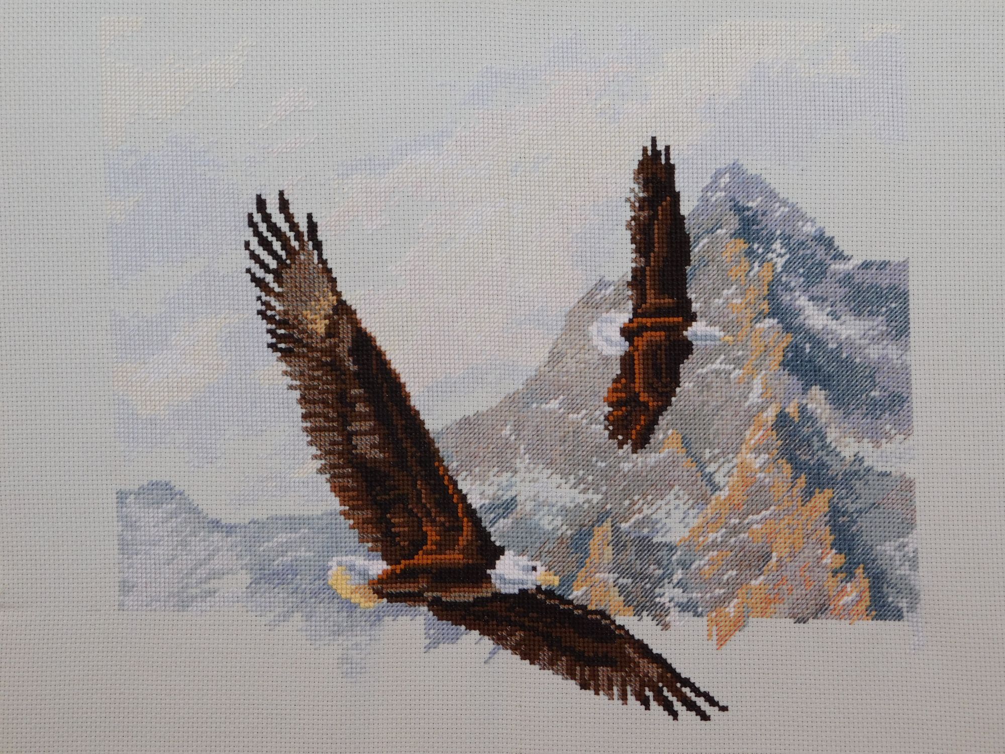 5 мая 2018 Приветствую Всех! Я с большим предвкушением приступила к жемчужине своей коллекции Dimensions №3766 Soaring the Peaks. Когда я увидела этот сюжет, то поняла сразу- он мой! Пришло время вышить этих грациозных, свободно парящих в вершинах красавцев- орлов. Вначале я немного переживала за качество ниток,поскольку набор 1994 года. Оказалось, зря. Ниточки очень приятных оттенков, в процессе вышивания ведут себя прилично: не мохрятся, не пушатся, аккуратненько укладываются. Канве отдельная Ода. Она такая мягенькая и приятная на ощупь! А вот схема меня местами неприятно удивила, т.к. поверх одних значков нанесены другие. Благо таких моментов не очень много. Я сравнивала со скрином и это явная ошибка полиграфии. Списываю это на ранний Дим. В целом на градус удовольствия от процесса это сильно не повлияет. Большая часть работы выполняется в технике полукрест, немного крест в 3 нити, бэкстича очень мало и даже есть фр.узелок. Небо вышивается полукрестом блэндами. Оно получилось очень нежным, зефирным, лёгким, в общем таким, каким оно должно быть в ясный и пригожий день. И вот он мой первый красавец. Ах, этот размах крыла! И как обычно бэкстич я буду делать по окончании работы. Сейчас вышиваю горы. Они так же, как и небо выполняются полукрестом. Вышито немного, поэтому покажу в следующий раз. Snezka, Муняша, Кисюня и 18 других сказали спасибо Поделиться сообщением Ссылка на сообщение