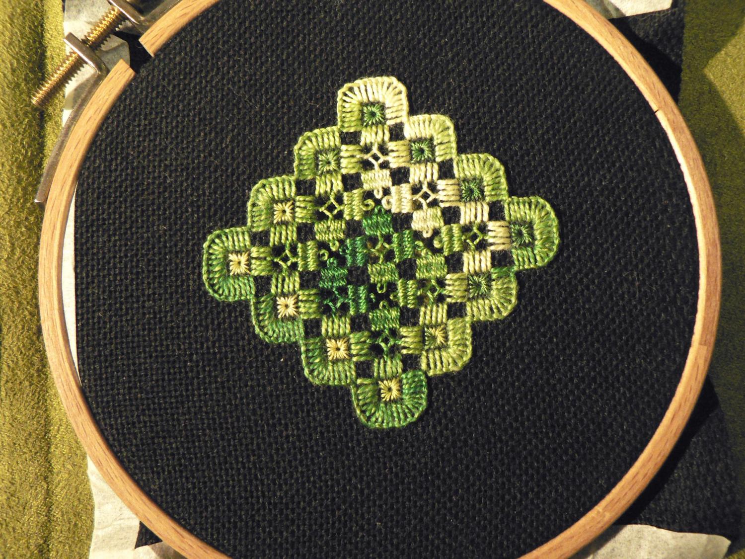 18 ноября 2015 переходим ко второй четвертинке и выполняем ее [ attachment=450079:IMG_1460.JPG][at tachment=450086:IMG_1465.JPG] обвиваем оставшуюся часть 2 нитей основы обвиваем до середины соседние две нити основы и выполняем четвертинку мальтийского креста - обвиваем до конца 2 нити основы wolf-mam, Verochka2307, Anicha и 3 других сказали спасибо Поделиться сообщением Ссылка на сообщение