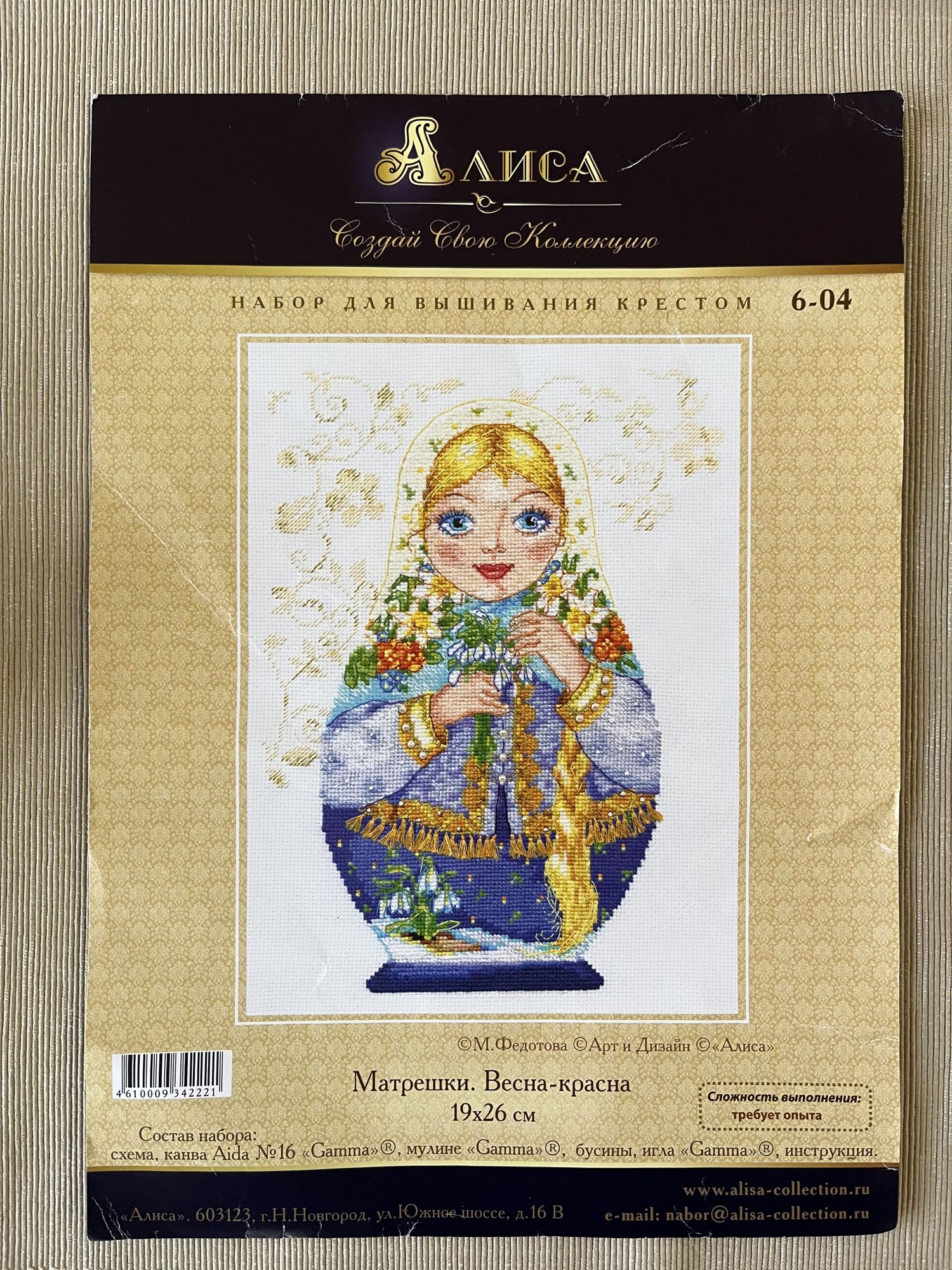 14 марта 2022 Добровольцы времени суток, милые рукодельницы!!! Наконец покажу завершённые 2 мини процесса от «Волшебной страны» это Дед Мороз и Снегурочка. Так что 2 зелёные гаечки В итоге красота получилась, любуюсь! Ещё один старт не запланированный у меня состоялся. Это набор от Алисы , Матрешки «Весна красна» размер 19*26, мулине Гамма, канва Aida 16, но я заменила на Aida 18. Данный сюжет я вышиваю не для себя, попросила подруга, тк она не умеет вышивать. Продвижения есть, но не очень мне нравиться этот набор Во первых, я не люблю цветные схему Во вторых, постоянно путаются нитки В третьих, с характером матрешка Но вышить надо. На этом у меня все! Каори, Хозяйка смешных зверей, Nadinka-Blondinka и 5 других сказали спасибо Поделиться сообщением Ссылка на сообщение
