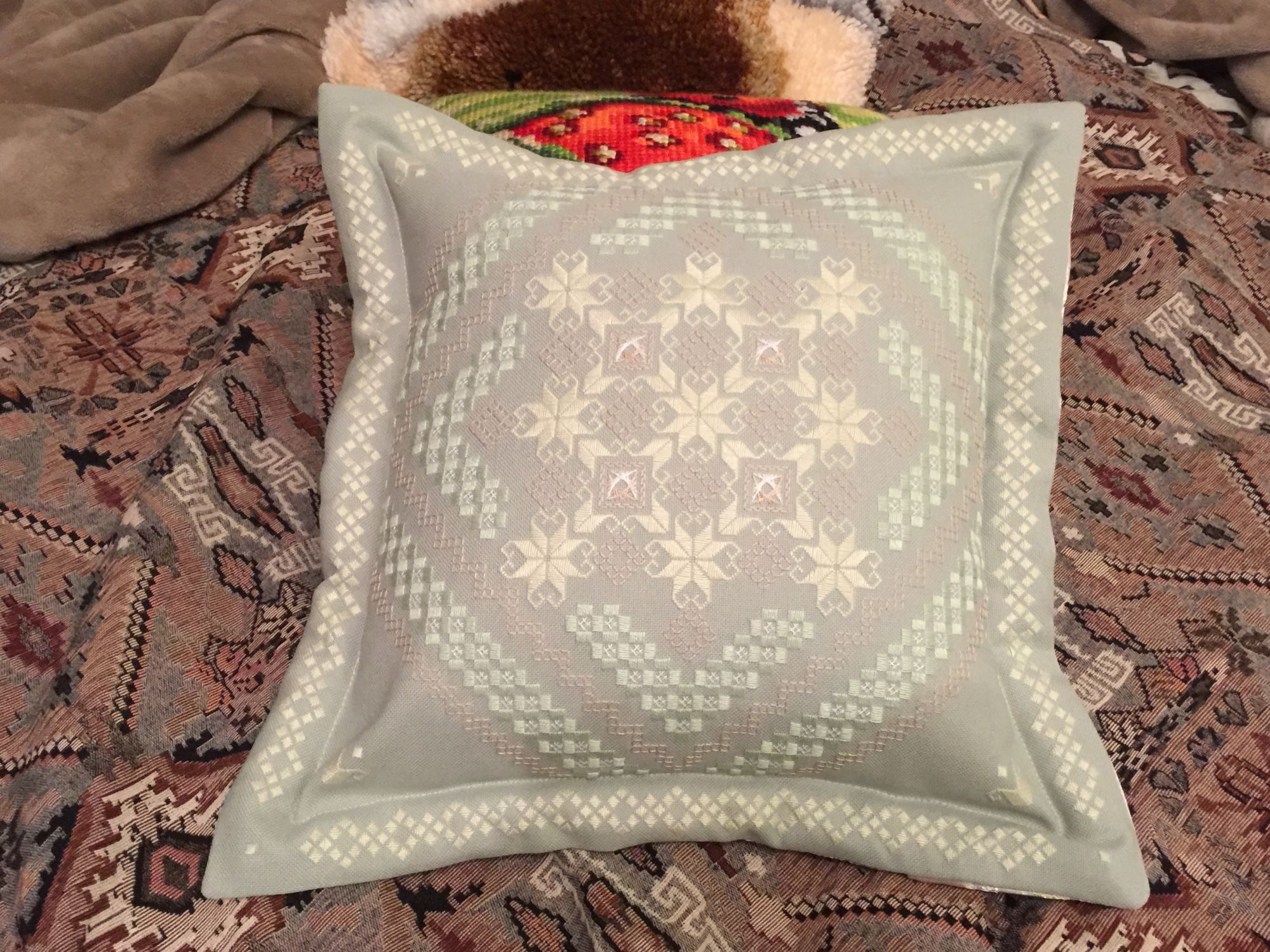 15 февраля 2016 9 часов назад, Nat717 сказал: Маша, ничего в размере не меняла...может и зря...на мой взгляд завершающий бордюрный узор для ушек...надо было немного больше отступить...из-за 16 каунта...маленькое расстояние для швов ...будет подушка без ушек теперь((( Но разве все учтешь впервые)))) А ты почему начала удлинять узор? Да я тоже, как Наташа, решила заполнить все пространство куска основы просты и не обрезать лишнее. Nat717 сказал(а) спасибо Поделиться сообщением Ссылка на сообщение