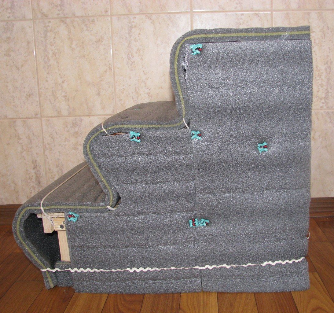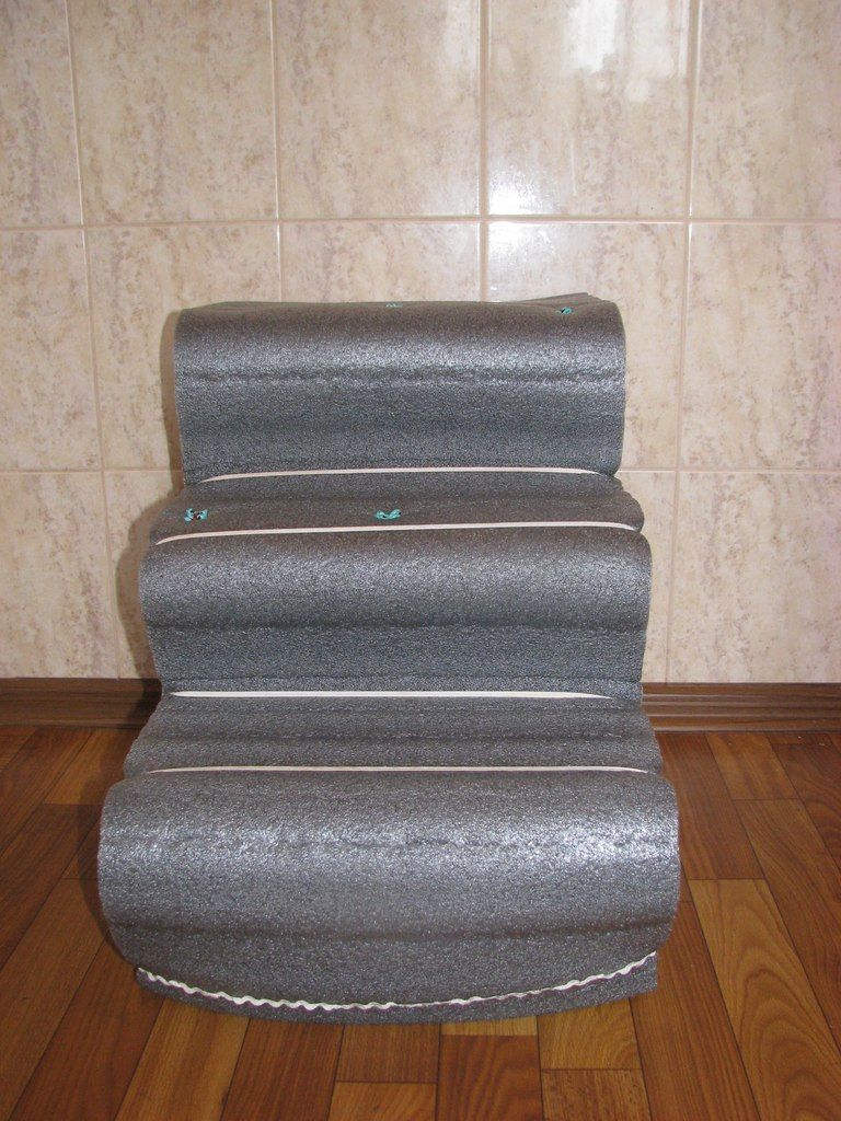 3 июня 2017 Каркас-основу делал муж ещё в 2011 году, когда у меня появилась Тишка, всё - для неё, любимицы, чтобы удобно и безопасно было подниматься и спускаться с диванов, кресел, кроватей. На 4 фото - это мы тогда временно на лесенку закрепили обычный коврик: Мне оставалась "материальная" часть, но вместо поролона муж с гордостью привёз мебельный степлер и утеплитель, сказав, что он прочнее.....))) Ага, зато, как сгибать этот утеплитель, и тем более крепить, если степлер его вообще не берёт?)) Так что я выкручивалась, как могла, согнула кое-как этот утеплитель, где-то пришлось резать на кусочки, посадила всё на клей "Титан" и несколько дней эта конструкция стояла обмотанная шнурками, которые я для надёжности решила всё-таки не снимать: Только сейчас сообразила, что нет и не сделала ни одно фото с чехлом, сняла его вчера, чтобы мерки снимать, и теперь только с обновой будут. Не судлите строго за подбор материалов, "слепила из того, что было")). От рубашек в ход по шли по 2 руква, причём на малиновой они были короткими и нашла остатки ситца, это я начале 90-х шила постельное бельё. Часть на квадратики порезала, а остальная часть сложена в два слоя и пошла на подклад, под квадратики, вместо синтепона. Длина дорожки 36х96 см, поэтому не стала заморачиваться с треугольниками и вообще мелкими деталями, а раскроила квадратики 12х12 см + припуски на швы. Чтобы не путать лицевую и изнаночную стороны, пометила изнанку самоисчезающим маркером. Сшила сначала квадратики. Разгладила швы и затем соединила горизонтальные полоски. Шаг для припусков на машинке выставила 5, но получается на ткани чуть больше. Чтобы вертикальные швы совпадали, пристегнула булавками. Получилась полоса из 3х8 квадратов. И далее к ней пришила подклад. Вторая часть - .. вот из-за неё я долго созревала на новый чехол. Т.к. углы у лесенки из-за утеплителя не 90º, то малоприятного сшивать\подгонять эти боковины(( Для них пригодилась новенькая юбочка, которую я сначала намочила и высушила, иначе потом ткань бы после первой же стирки подсела, на фото это она во время сушки. Ткань похожа на токую шесть с синтетикой, не толстая, но плотненькая. Выкройку делала из подарочного пакета - дожили! - газет в доме не нашлось, а миллиметровку жалко)) Юбочку распорола не полностью, оставила один боковой шов, отпарила, особенно, где выточки были; ткань подкладочная у неё была классная, мож. ещё на что сгодится.... лет через 20?)) Обрабатывала все-все края. Не успела поставить и сфоткать, как девчонки уже начали скакать по лесенке, пришлось хозяек этой мебели в комнате закрывать. Вот что получилось: Наконец-то мой мышонок от ЧМ "Давай играть!" оформлен!)))) Наталья2013, Алоиза, alen_73 и 15 других сказали спасибо Поделиться сообщением Ссылка на сообщение