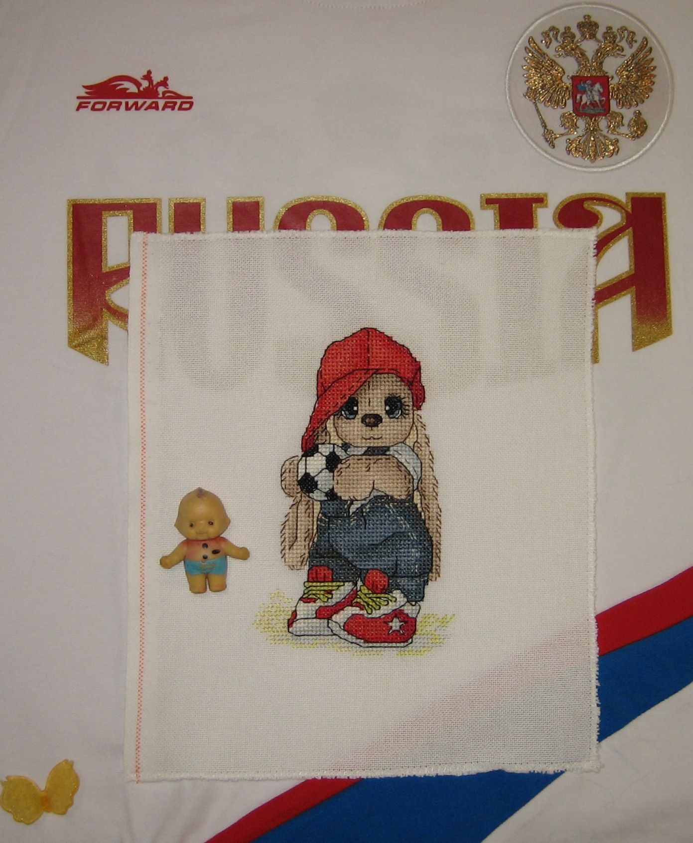 11 августа 2017 А пока покажу своего зайчонка, такой хорошенький!!!! -это скан обложки набора - здесь эта маленькая вышивка лежит на настоящей футболке (только от хоккеиста сборной России, от футболистов у нас есть только бразильская и немецкие, - как-то непатриотично)) - просто показать, что вышивка такая маленькая и можно её использовать, как аппликацию на детскую одежду - фото поприличнее, но оформление виртуальное. Вышью ещё Зайку-Ведьмочку и буду вместе оформлять аппликациейна подушку)). ВСЕ фото не для процесса. Сегодня опять не получается попасть в Питер -муж по грибы да порыбачить к нам в Усть-Лугу приехал)) Всё бы ничего, только "димовские шары" и "Память странствий" так и лежат неоформленные, и тканюху со жгутами для "Восточной подушки" хотела подобрать в магазинах... Значит, буду вышивать!)) kreolka, ЛюдмилаЕр, nastygera и 5 других сказали спасибо Поделиться сообщением Ссылка на сообщение