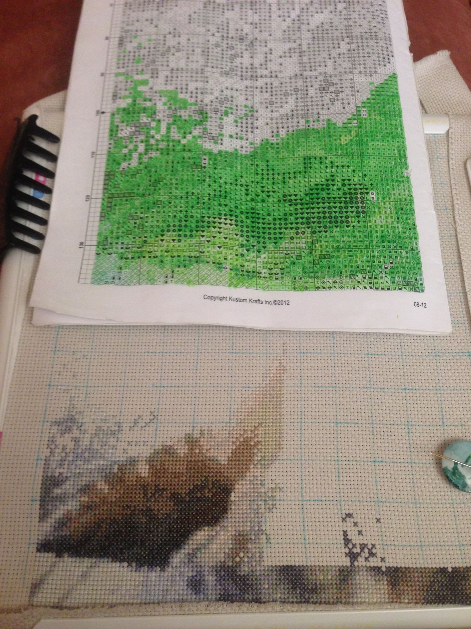 10 июля 2017 Продолжаем... Опять захотелось чего-то другого. Этим другим стал обожаемый Волк от КК, тот что "В ожидании". на этом начала, дошила шестой лист и начала седьмой, но страшно накосячила в хвосте и бросила . Решив, что для таких сложных работ я пока не готова, начала новый процесс, буду звать его Ящик. . Очень я люблю этот ржавый почтовый ящик, не могу даже объяснить, чем он меня так цепляет, но цепляет сильно. Придумала для себя сделать родителям ключницу на дачу, посмотрю, когда вышью... Начало . Обожаю ДИМ, с его полукрестами, блэндами и большим количеством незашитого пространства (в этом дизайне). Дошила я до второго угла, но пока не сфоткала, будет что показать потом ))). Все это великолепие незаконченных работ может украсить только подушка-валик от мужа (для зеленения гаечки) и вышитая им же к нему пара . Дело осталось за малым - сшить все это, вместе с четырьмя подухами ))). Selinta, titania, Юнона1960 и 11 других сказали спасибо Поделиться сообщением Ссылка на сообщение