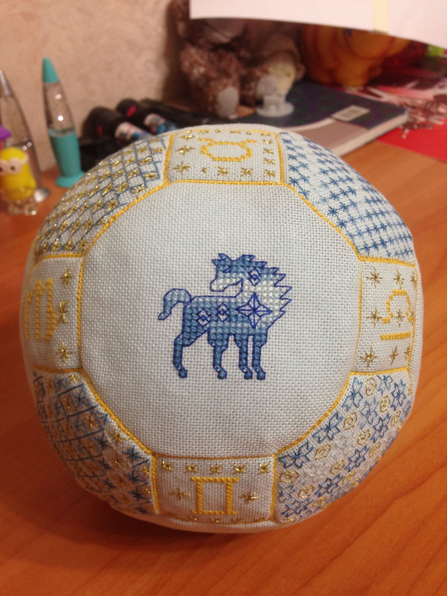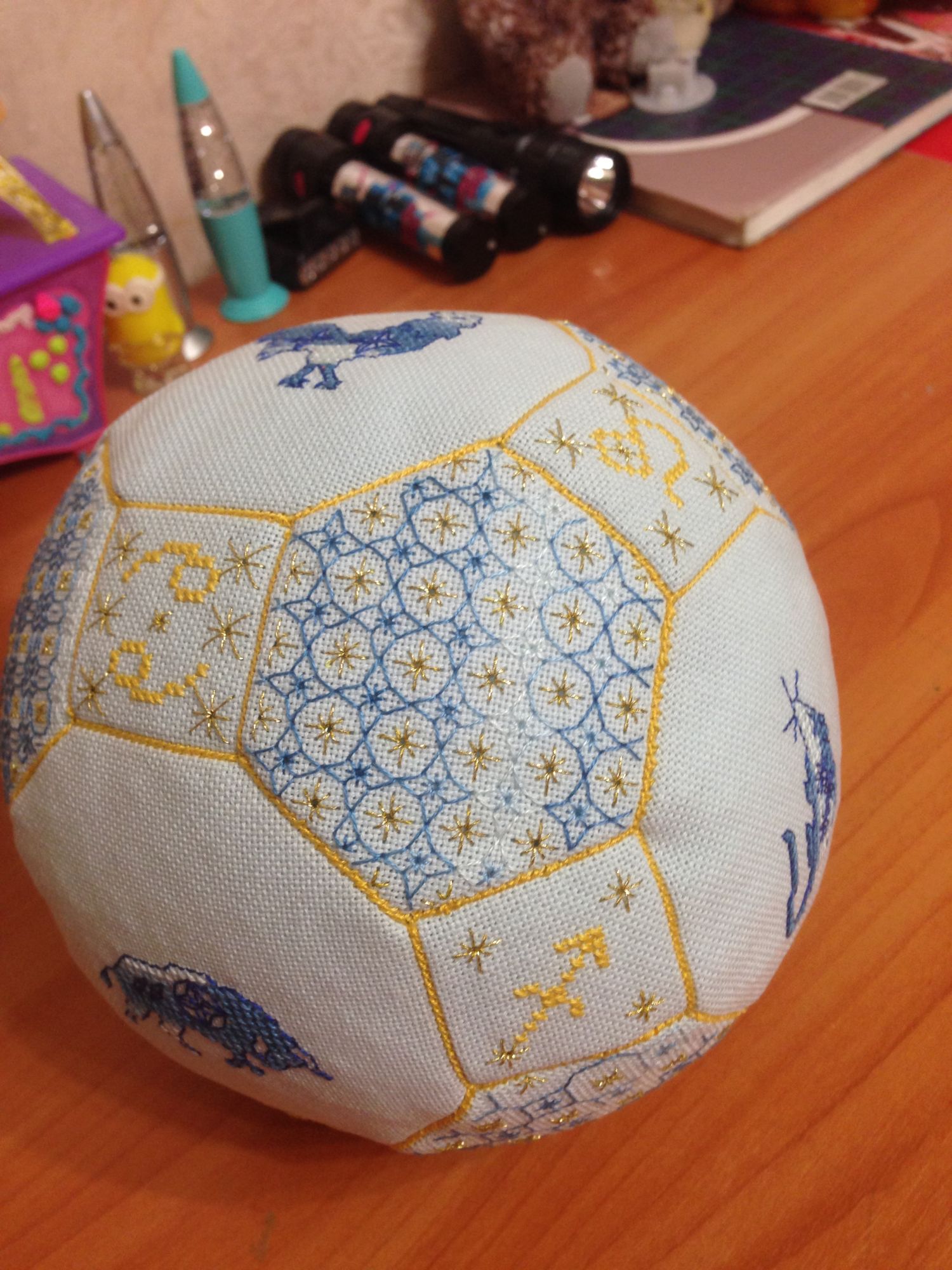 10 июля 2017 Итак, о вышивальном. Когда мы узнали на 100%, что родится мальчик, мне очень захотелось вышить для него что-нибудь. Не придумала ничего лучше, как сшить чудо-мяч или попросту квакер болл. Подготовка не заняла много времени, т.к. у меня не накоплено большого количества тканей или ниток, поэтому все делалось из того, что было. Схем в интернете масса, но крутилась задумка одна - гороскопы, знаки зодиака и звездное небо... Вот от этого и "плясала"... . Все грани показывать не буду, но здесь все мы. Сережа родился в год Петуха, я - Лошадь, папа наш - Бык, Танюша - Собачка, Светлячок - Мышка и вставила нашу бабушку, она Зайка. Не хватило места только для тетушки. Опробовала блэкворк, мне очень понравилось, но это и было самым трудоемким. Сшивать и заполнять было проще простого, к тому моменту уже поняла все, поэтому получилось насладиться. Скажу сразу, что мячиков будет еще два, но чуть позже, когда возникнет желание. Ну а дальше я начала прыгать по своим процессам. Первой достала Капусту. Мы подросли ровно на один кочан . Обожаю этот процесс , очень мне все в нем нравится, но не в состоянии глубокой беременности, когда не знаешь, чего хочешь ))). А хотелось мне лета и тепла, поэтому немного продвинулся сэмплер Лето. "горячо любимый мною бэк ))), . А потом мне захотелось лета поярче, пожарче я бы сказала, поэтому я начала новый процесс. Знакомьтесь Фея Маков, по схеме Джоан Эллиот. . Процесс очень приятный, да и вышила я много больше, чем на фотографии, но... Опять захотелось чего-то другого. Выбор пал опять на цветы, но уже в любимой желто-фиолетовой гамме. Продолжила я свою Тарелку от Анкор. . На этом и остановилась пока... Не устали? Это еще не все... Будет № 3... Хозяйка смешных зверей, ОлюшКа, Olka и 12 других сказали спасибо Поделиться сообщением Ссылка на сообщение