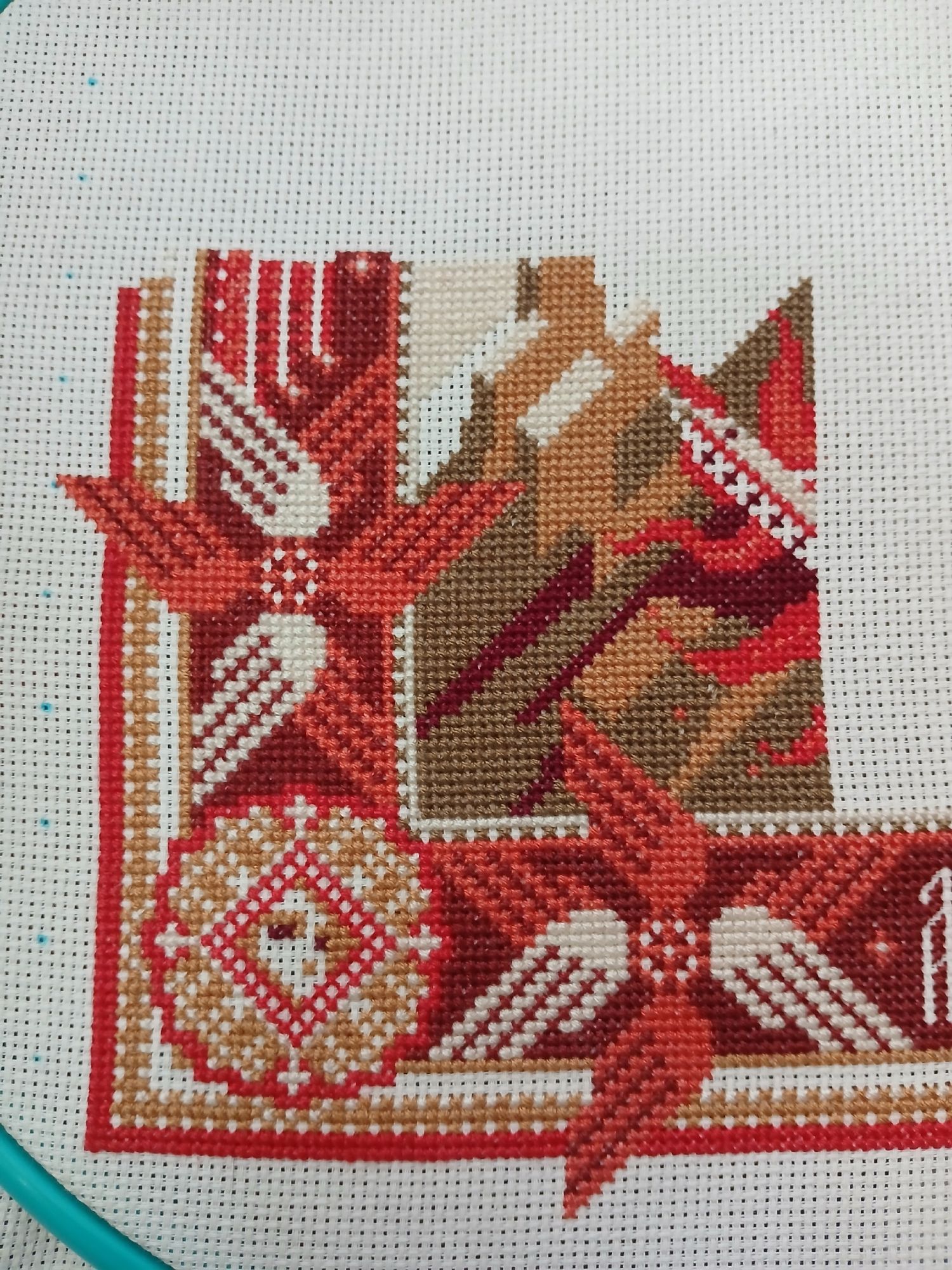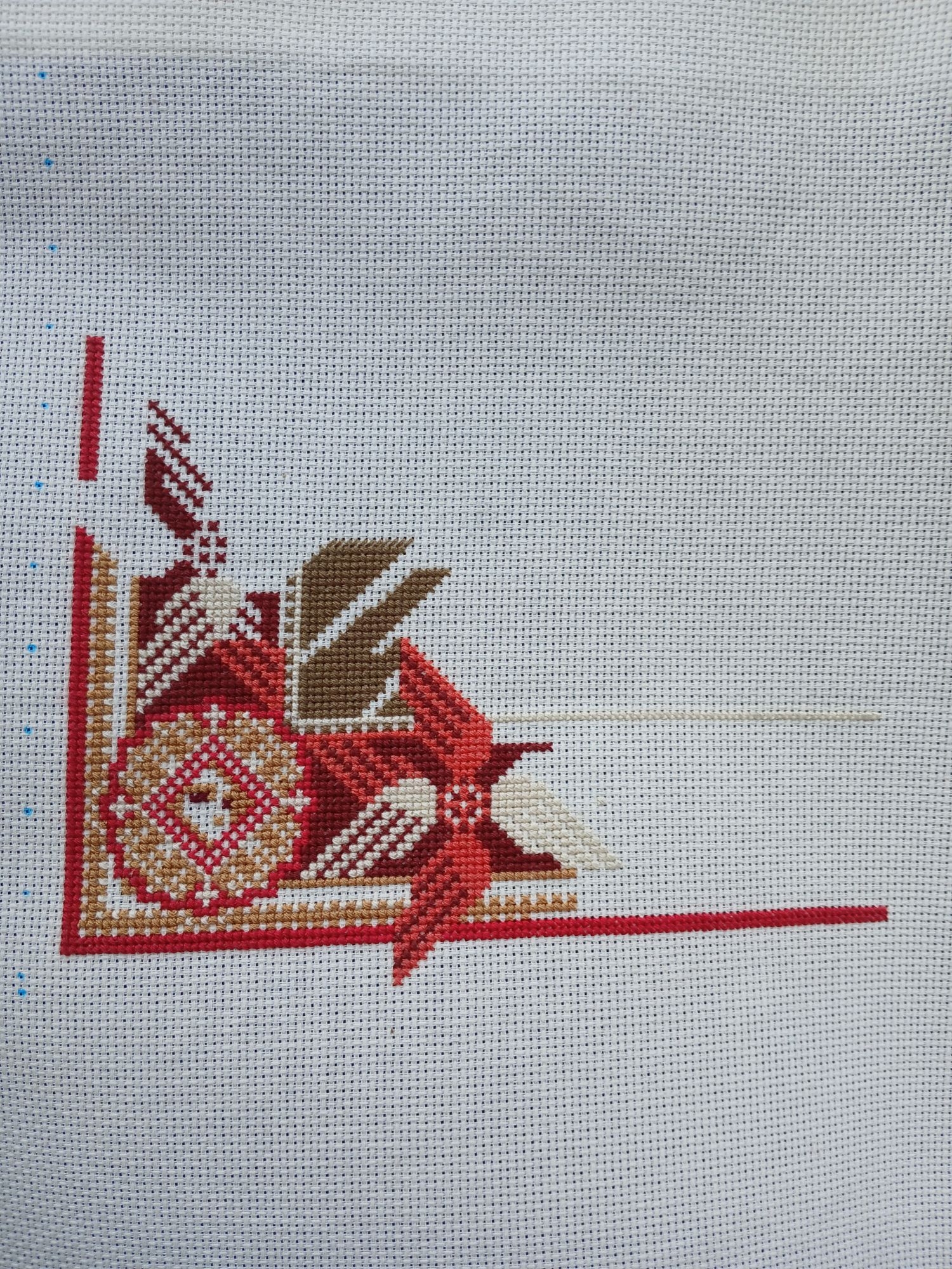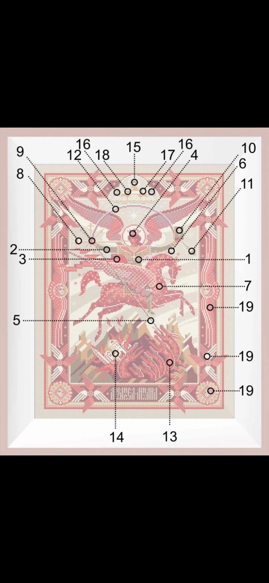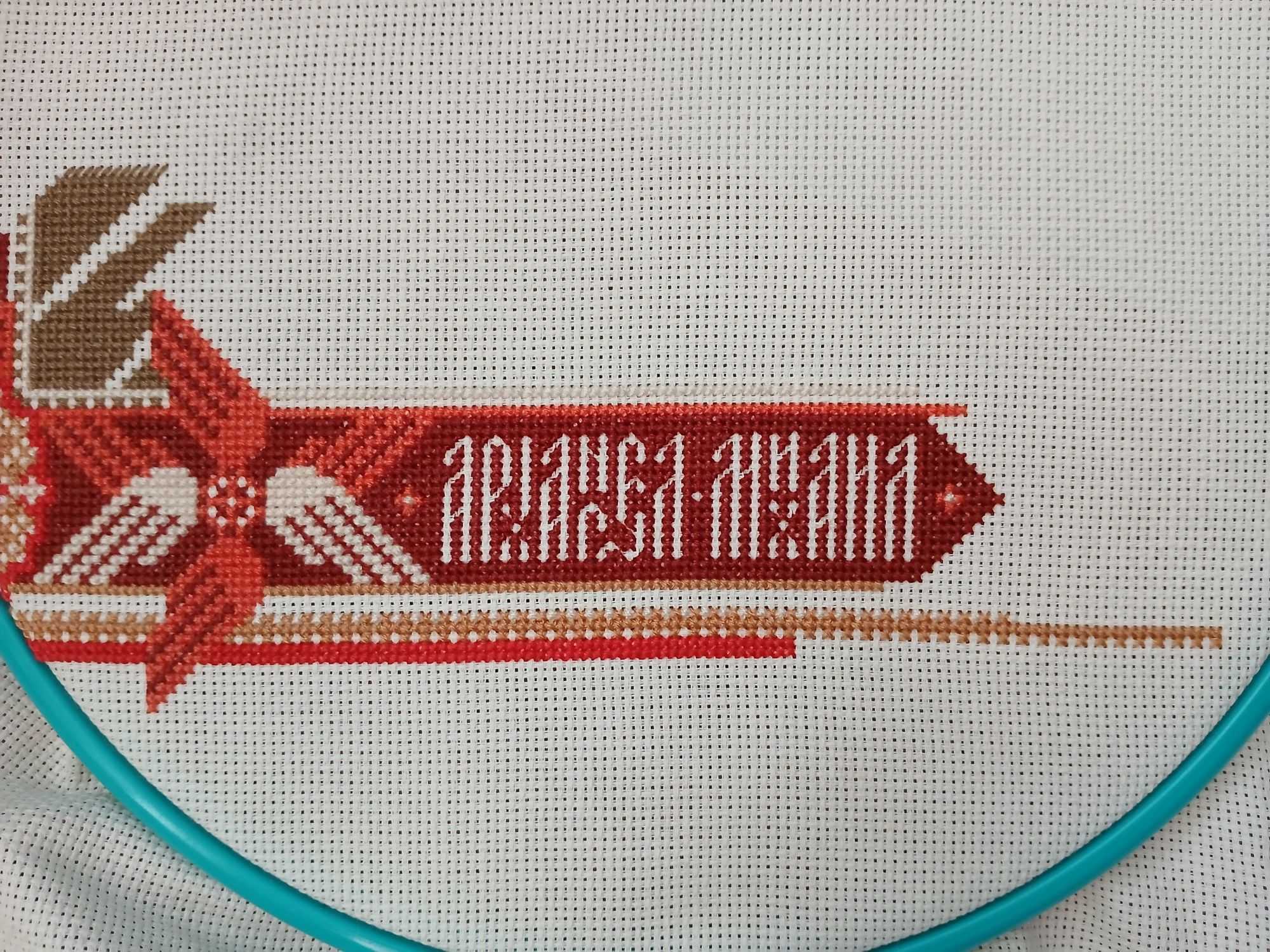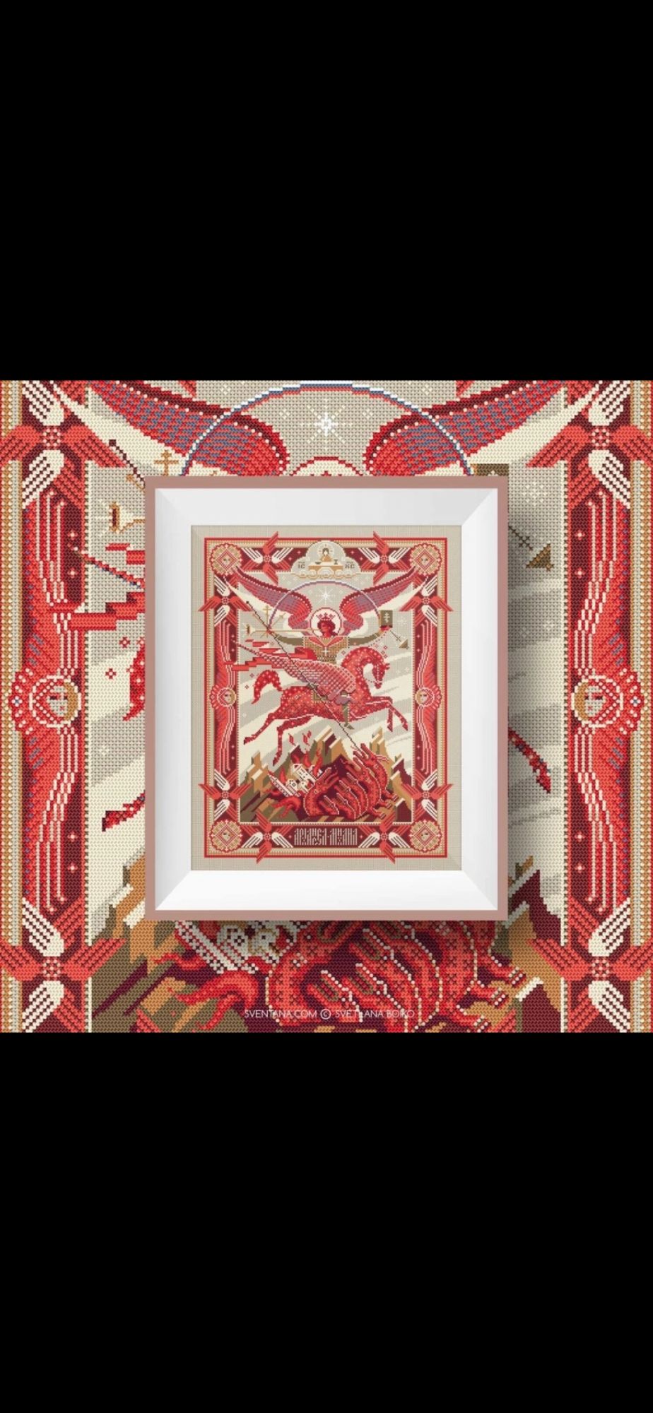 6 августа Всем привет! Лето продолжается, надо успевать насладиться его дарами - теплом, цветами, ягодами, ничегонеделанием и, конечно, вышиванием. Я начала вышивать схему Sventana "Победа Правды над Кривдой / Архангел Михаил". Нитки ДМС, 9 цветов, Аида 16 каунта, размер 201 × 262 крестика, или 32 × 42 см. Архангел Михаил – покровитель воинов, бьющихся за правое дело. Скрытый текст СИМВОЛИКА СЮЖЕТА Композиция представляет собой современное авторское прочтение древнерусского иконографического сюжета под названием «Архангел Михаил грозных сил воевода», где Архангел в образе всадника Апокалипсиса выступает в момент решающей битвы с дьяволом. Некоторые искусствоведы считают, что это старообрядческий сюжет. Однако это утверждение некорректно, так как первое известное изображение Архангела Михаила на огненном коне появилось задолго до церковного раскола и датируется 1550-ми годами. Опишу основные символы произведения: Архангел одет в доспехи (1), под ними зелёный хитон (2), сверху — красный хламис (3) – небольшой плащ. Красный цвет символизирует божественность и силу. Царская корона с диадемами (4) – символ немедленного повиновения Богу. Вокруг его головы сияет нимб. Лицо Архангела красное — это указывает на присутствие огня божества. Кроме копья (5), пронзающего дьявола, и повода (6) огненного коня (7), Архангел держит в руках много других предметов. Среди них: Труба (8), возвещающая наступление Второго пришествия и Страшного суда. Звук разносится по всему миру как ветер, который может достичь всех мест. Орудия страстей (9), включающие: Крест, на котором был распят Спаситель. Малое копье, которым воин пронзил распятого, желая удостовериться в Его смерти и губка на трости, которая была пропитана уксусом, чтобы смочить Ему уста. В другой руке Архангел держит Евангелие (10). Из Писания слово Божье выходит в мир. Евангелие — это радостное послание. В этой же руке у него ладанка (11). Ладан — один из даров, которые Иисус получил на Рождество от трех мудрецов как символ Бога. Архангел Михаил раскинул руки. Между ними сияет космическая радуга (12) — мост между землей и небом, дорога к Богу и символ примирения Бога с людьми. Крылатый Огненный Конь перепрыгивает через пропасть. Архангел бьет врага копьем и низвергает его в бездну навеки. В нижней части изображен поверженный сатана (13) в одной из своих ипостасей — в образе зверя багряного с семью головами, упомянутого в тексте Апокалипсиса. Слева от него – опрокинутый град (город), символизирующий «погибельные земные царства» (14), утонувшие во лжи и блуде. Им суждено погибнуть во время Страшного Суда. В верхней части композиции в тройной арке расположен алтарь с сидящим за столом Эммануилом (15), который дает свое благословение. Буквальный перевод имени «Эммануил» в переводе означает «с нами Бог». Это Иисус Христос в отроческомвозрасте, а Эммануил – одно из его пророческих имён. По бокам монограммы IC и XC (16) означают сокращение «Иисус Христос». На столе у Эммануила находятся два предмета: Потир (17) от греческого «чаша» — богослужебный сосуд в виде чаши на высоком стояне; во время литургии в потире находится вино, пресуществляющееся в Кровь Христову. Дискос (18) от греческого «блюдо» — богослужебный сосуд в виде блюда, на котором во время литургии полагается часть просфоры (хлеба), символизирующей Тело Христово, и частицы други