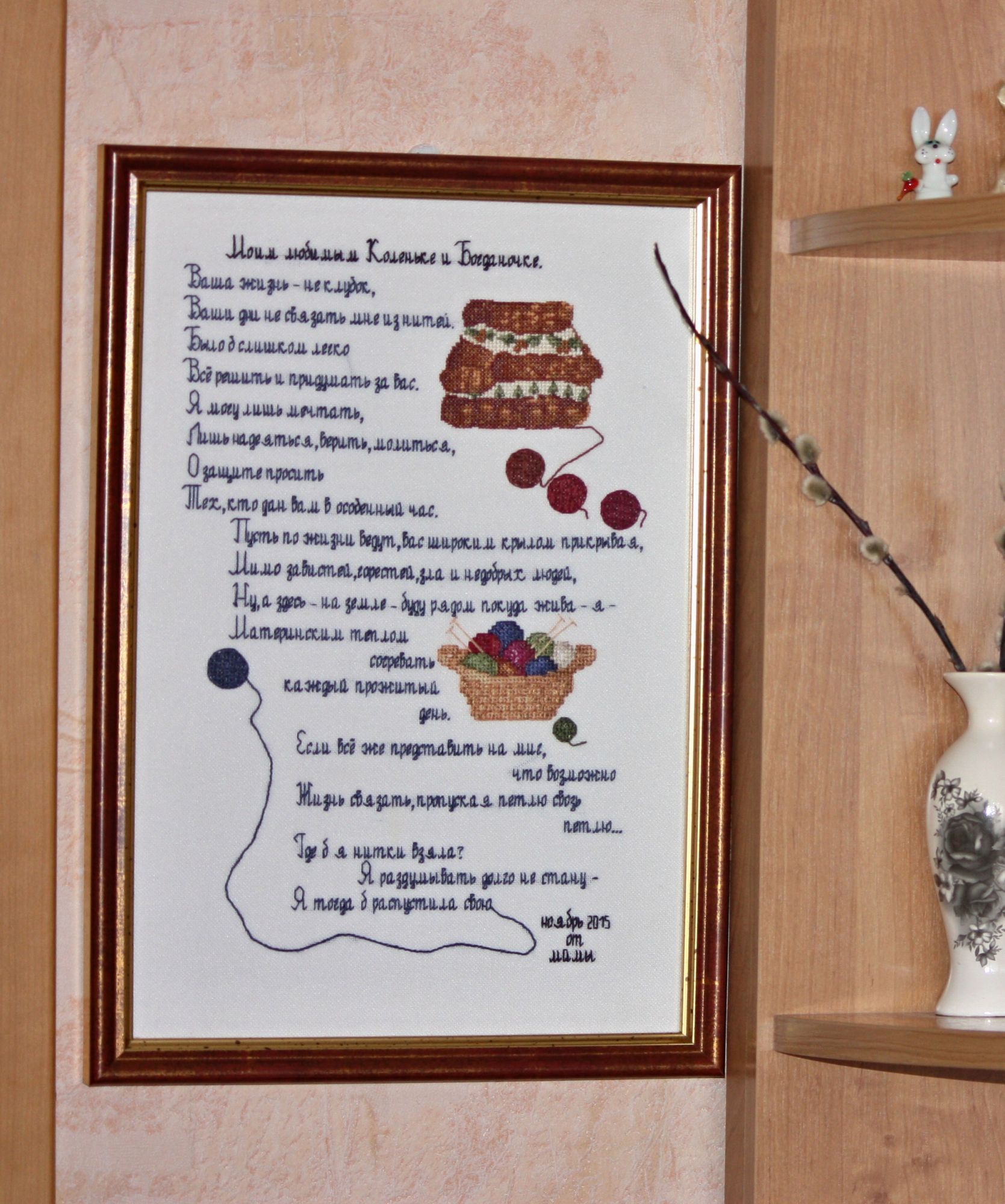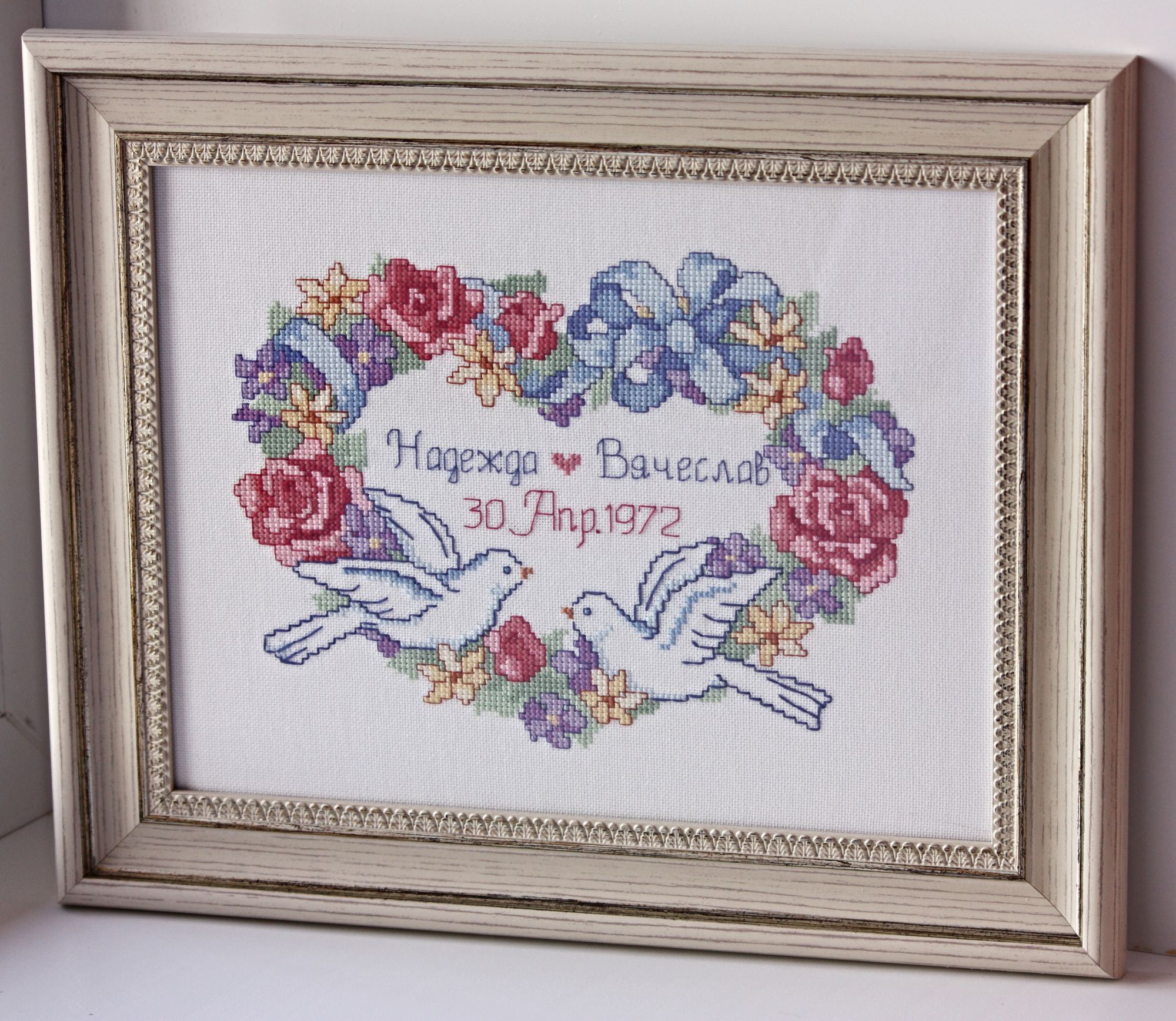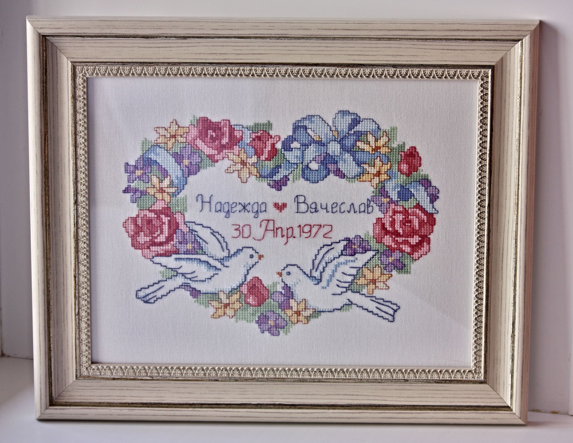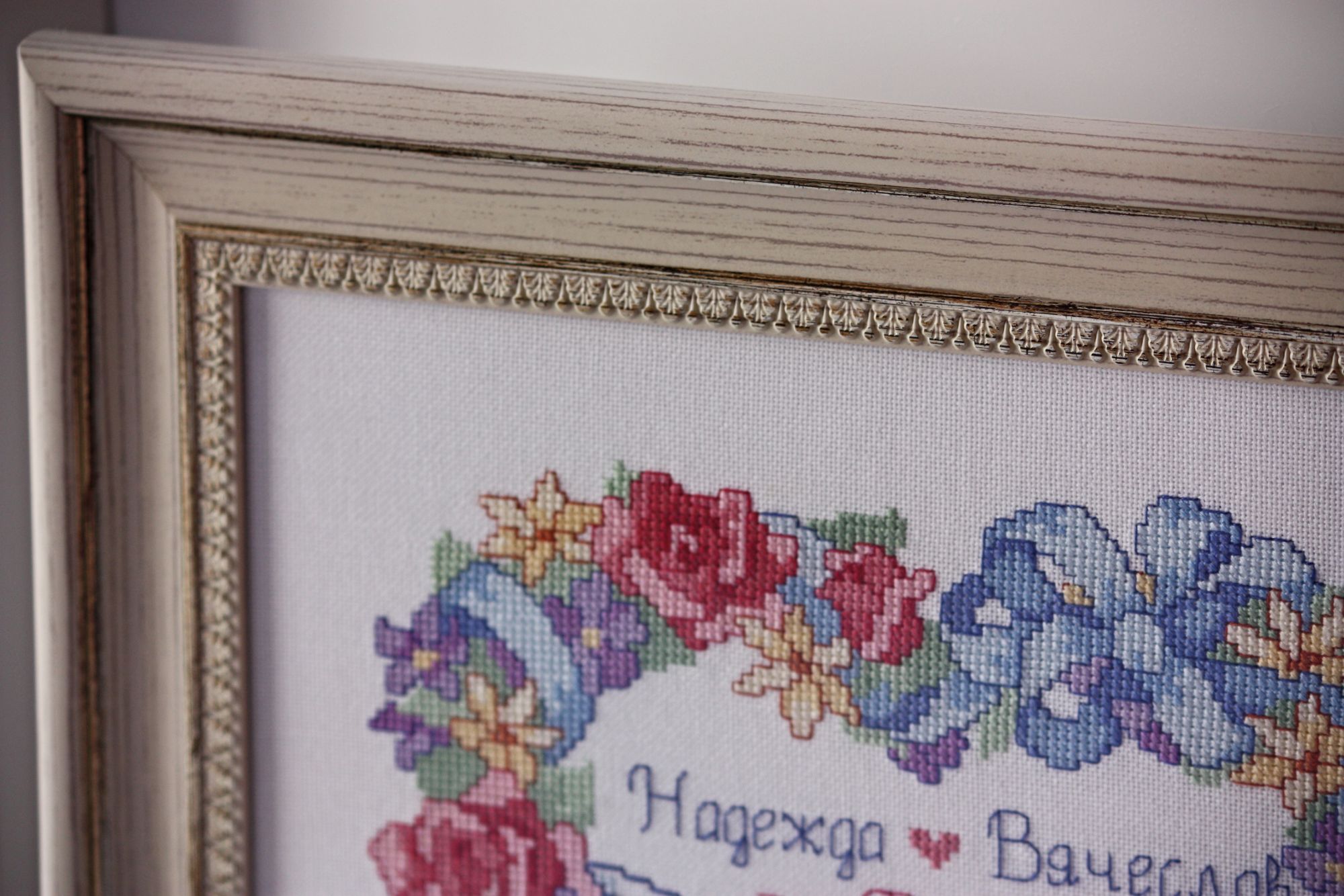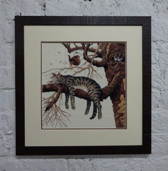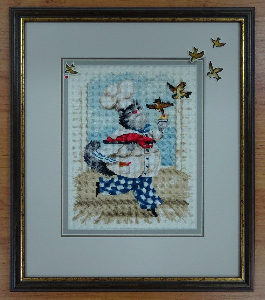 20 апреля 2017 Привет, привет, привет!!! Сегодня ничего не покажу по процессам, зато поделюсь своей радостью и парой оформленных работ. Не так давно, я, оформив синего кота в фоторамку , рассказывала душеСчипательную историю о том, что у нас в городе совсем туго с багеткой, точнее их нет. И что приходится ездить в другой город, что не всегда удобно. Буквально сразу после этого одна наша форумчанка написала мне в личку, что у нас в Кимрах есть багетка. Прикиньте, я тут живу и ничего не знаю! (как всегда впрочем) Хотя с другой стороны, в свое оправдание могу сказать то, что моя сестра тоже вышивает уже много лет и тоже не знала про эту багетку. А если она не знала, щитай не знал никто))) Итак, я узнаю енту радостную весть и еще месяц ее перевариваю. Потом, переварив, смотрю в группе ВК работы нашей багетки и опять перевариваю. Вот примеры оформлений из их группы. Резное паспарту И вот позавчера решаюсь и иду) Но, позавчера случилсяч облом, встреча не состоялась, зато вчера - о счастье! - все получилось. Приволокла я на оформление одну работу, на пробу. И оказалось, что мастер, она же приемщица, на следующий день уходит в отпуск , т.е. сегодня. Нууу, я даже не удивилась, это ж Люба пришла) всегда так и происходит у меня) Поэтому что-то сложное она не успеет сделать, а вот в рамку вставить пожалста. Я с собой взяла цветочное сердце Дименшенса, если кто помнит вышито оно было еще год назад. В идеале я представляла его в каком-нибудь интереном паспарту. На крайний случай в простой широкой раме. Паспарту отпадало, по понятным причинам. Можно было бы конечно, но тогда пришлось бы ждать выхода мастера из отпуска. А раму она мне подоброла довольно быстро. Благо выбор багета у них довольно приличный. В итоге через несколько часов Юля мне уже позвонила и сказала, что работу можно забирать. Сегодня я ее забрала. Вот что вышло. Там на какой-то фотке как будто мятая канва справа, но это глюк) все ровно) я когда фотку загрузила, аж испугалась, полезла за картиной перепроверять))) Жду вашего мнения) Единственное что, у нее в наличии только один вид стекла - какое-то оргстекло. Но вроде бы на внешнем виде никак не сказывается. Работу она слеит на тканевый скотч (вроде так называется) и иногда (не знаю когда) на вспененый. В деньгах вышло почти 1,5 тыс рублей. Не супер дешево. В Дубне честно говоря было немного дешевле такого плана оформление. Но до туда надо еще доехать, причем два раза) и мне там не особо нра. Еще я купила у нее багетные крючки и повесила свои работы на стену) Это ж отдельная история))) У меня дома есть целых 5! оформленных работ. Прикиньте скока многа) и фсе они лежат в шкафу. Да-да. Потому что мово муша не допросишься прибить картину на стену. У нас висели две, во время ремонта их сняли и обратно не повесили. А фчера...А фчера он приходит домой, а нас по фсем стенам картины навешаны.... Вот эти две я формляла лет пять назад в Дубне, мне нравится оформление, но до нее добираться не очень легко пешком. А остальные три оформлены недавно, но, как уже пятый раз скажу, не очень нравится результат. Из трех хорошо получилась метрика Лошадь ваще не то чего-то А вот эта работа отдельный прикол. Это я вышила своим детям стих, немного его и сочинила привезла оформлять, мы с приемщицей договорились на двойную раму, а приехала я и увидела, что работа моя оформлена так Им показалось, что так лучше. Я вас, наве