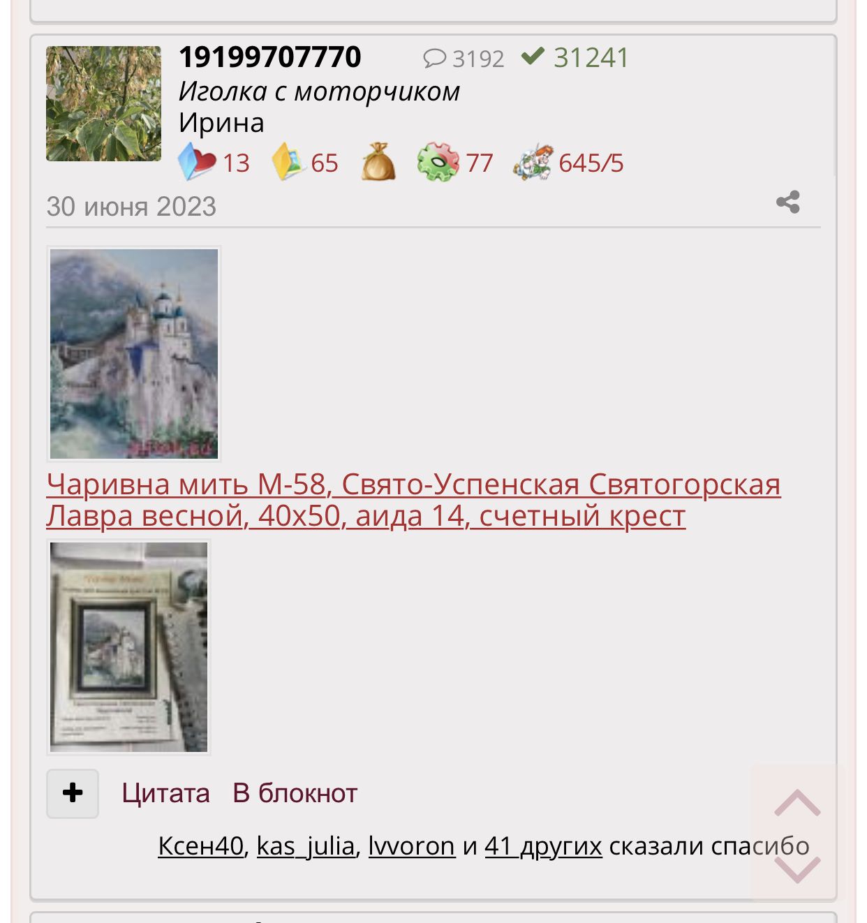 22 декабря 2024 4 часа назад, makalicha1970 сказал(а): Добрый день, привяжите, пожалуйста, мою вышивку https://www.stitch.su/users/ready-works/makalicha1970&36 к набору: https://www.stitch.su/permin/12-4443 Этот привязала! 4 часа назад, makalicha1970 сказал(а): И вот эту тоже: https://www.stitch.su/users/ready-works/makalicha1970&6 сюда: https://www.stitch.su/dimensions/06899 это подбор, к тому же с другой техникой, поэтому без привязки. makalicha1970 и Auria сказали спасибо Поделиться сообщением Ссылка на сообщение