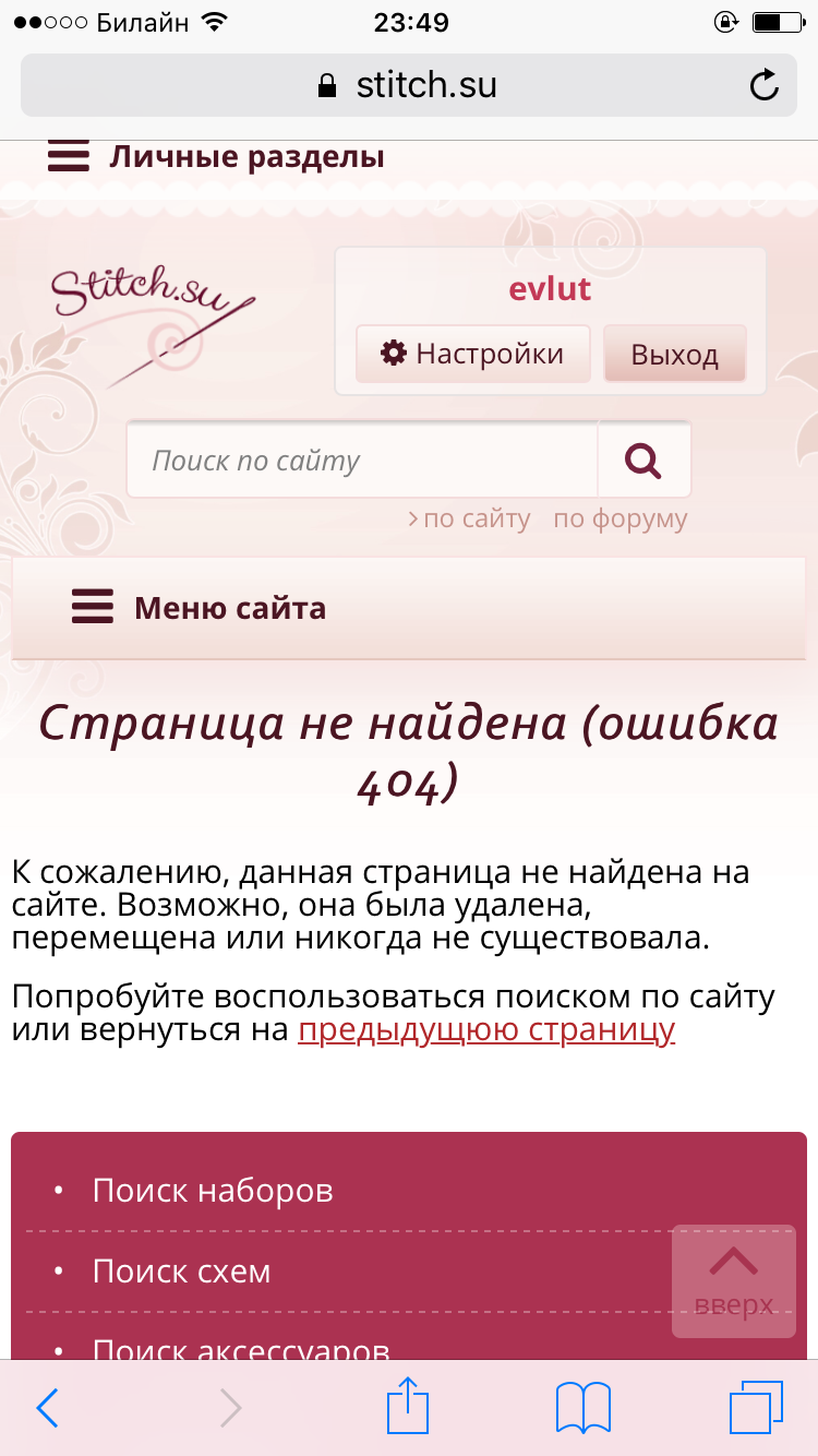 19 августа 2017 11 час назад, Aleks сказал: evlut, странно, что там именно 404 ошибка. Можете скопировать сюда url-адрес страницы, которая при загрузке эту ошибку выдает? По идее, адресная строка должна появиться если кликнуть (быстро или долго держать, не уверен) по надписи "stitch.su" в самом верху. Вот, например https://www.stitch.su/search/?q=Lanarte Вообще, она вылезает вне зависимости от какой-то части сайта. И если искать на главной странице, и если на форуме находишься Aleks сказал(а) спасибо Поделиться сообщением Ссылка на сообщение
