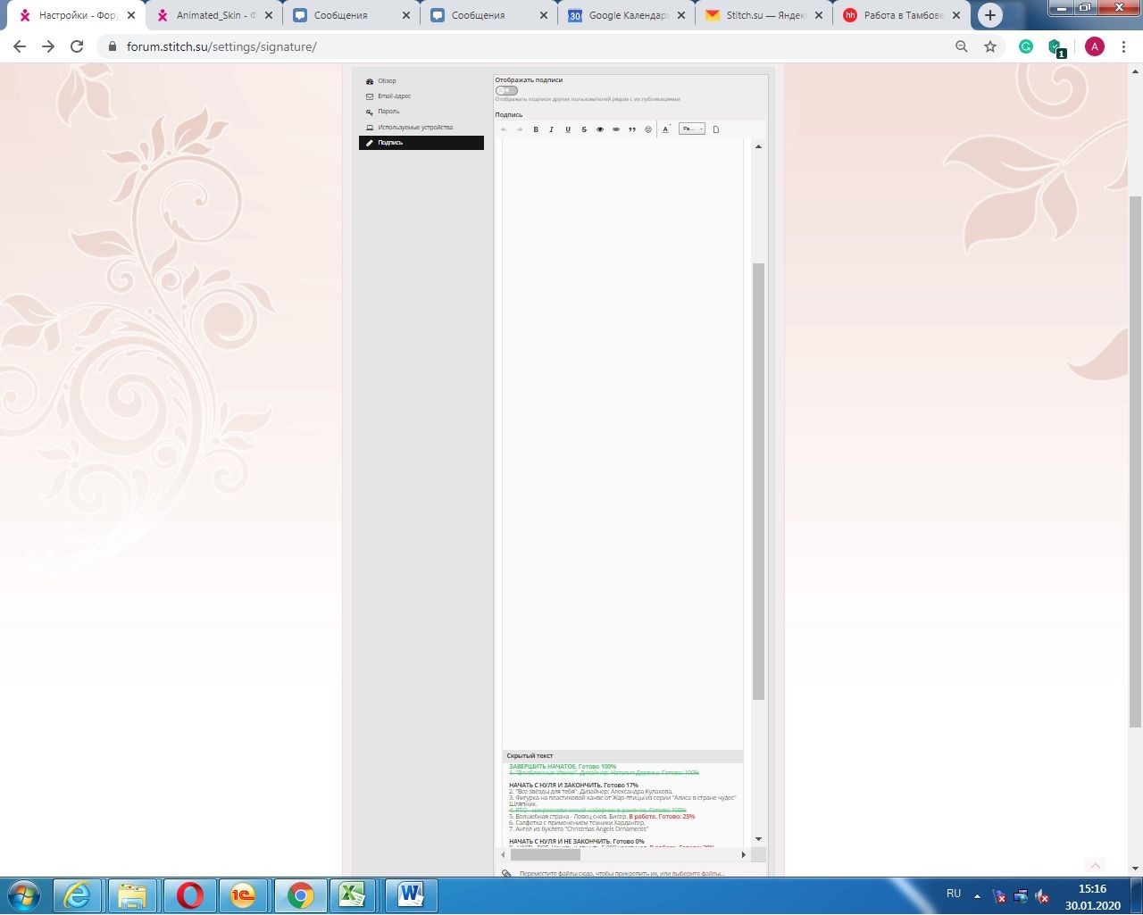 30 января 2020 Добрый день. Возникла проблема с формированием Личной подписи со скрытым текстом. В процессе редактирования всё выглядит так, как надо. После сохранения происходит лютый ужас (скриншот прилагаю). Масштаб страницы сайта уменьшен преднамеренно, чтобы показать количество внезапно появляющихся абзацев. То же самое происходит при цитировании в разных темах форума, а также в личных сообщениях. И не зависит от устройства, с которого я пользуюсь форумом. Может кто-нибудь подсказать, что за напасть. Ранее такого не было. (Нет, я не ставила пробелы и перенос строки самостоятельно) (Предварительно я очищала редактор Подписи с помощью кнопки "Удалить весь текст") Поделиться сообщением Ссылка на сообщение