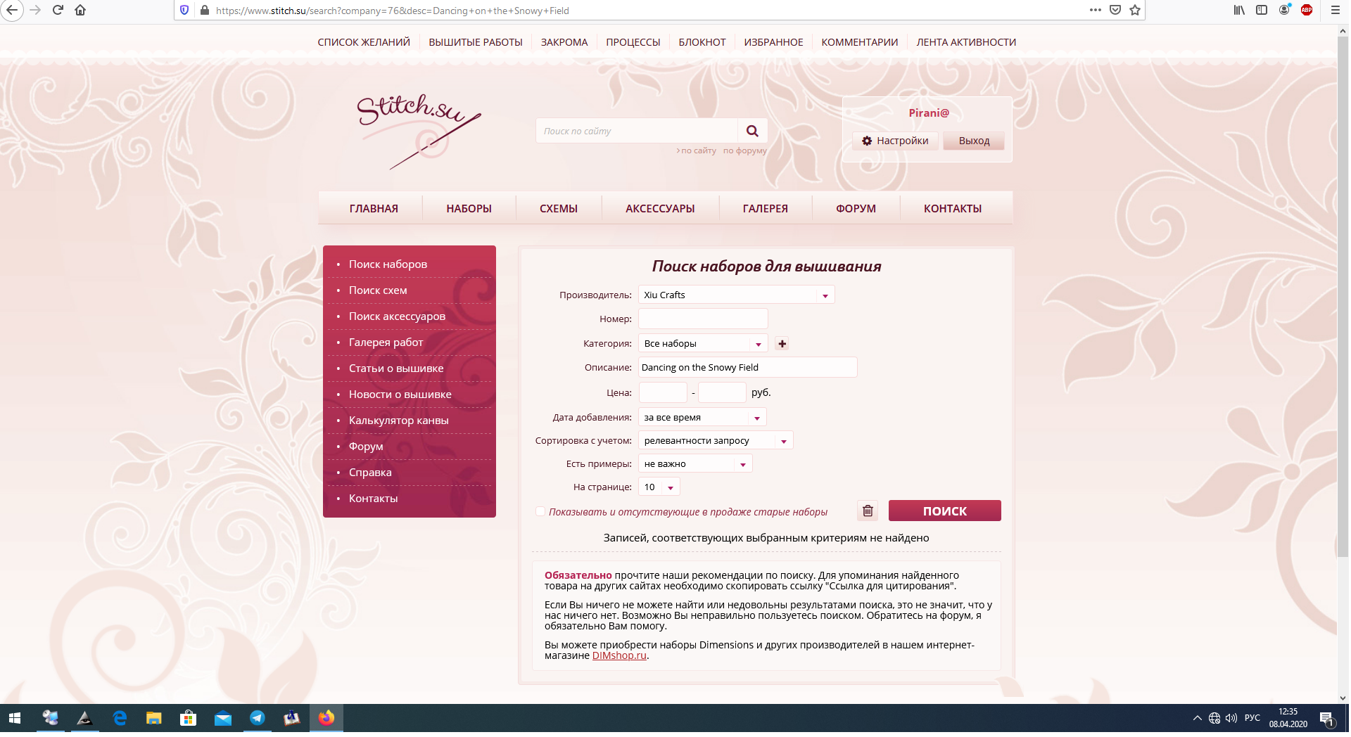 8 апреля 2020 5 минут назад, Pirani@ сказал(а): Добрый день подскажите, в поиске наборов выставляю производителя Xiu Crafts И пытаюсь найти набор 2800107 Dancing on the Snowy Field В списке наборов он не строится, да и некоторых других наборов нет. Это из-за того, что их нет продаже? Может я где-то неправильно выставляю атрибуты поиска Нужно поставить галочку "показывать отсутствующие в продаже и старые наборы" Упс... уже ответили Pirani@ сказал(а) спасибо Поделиться сообщением Ссылка на сообщение