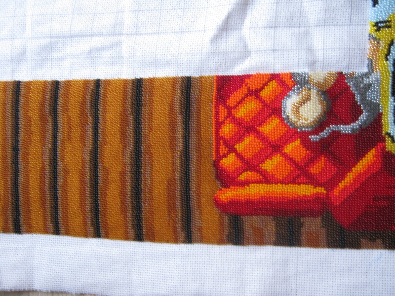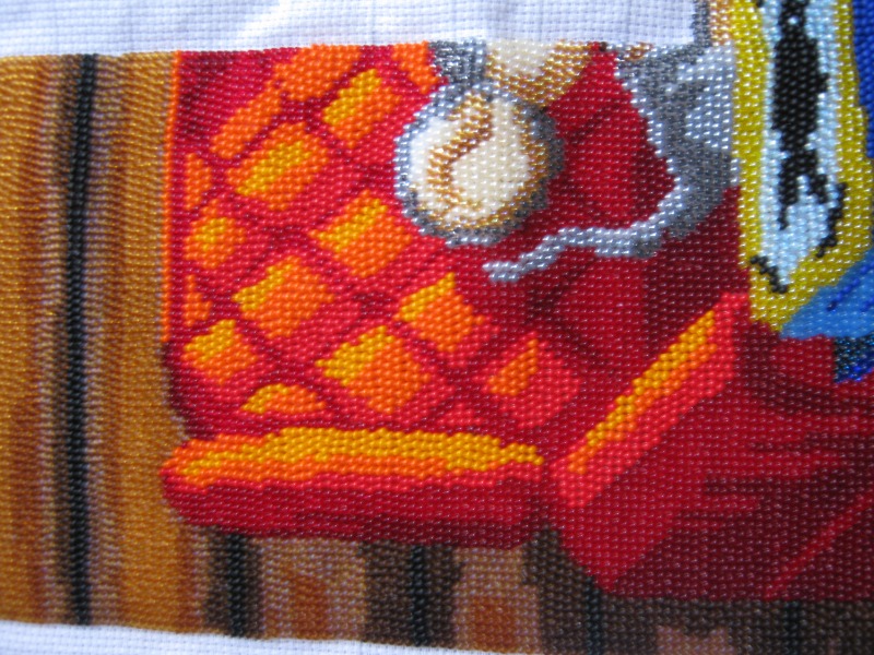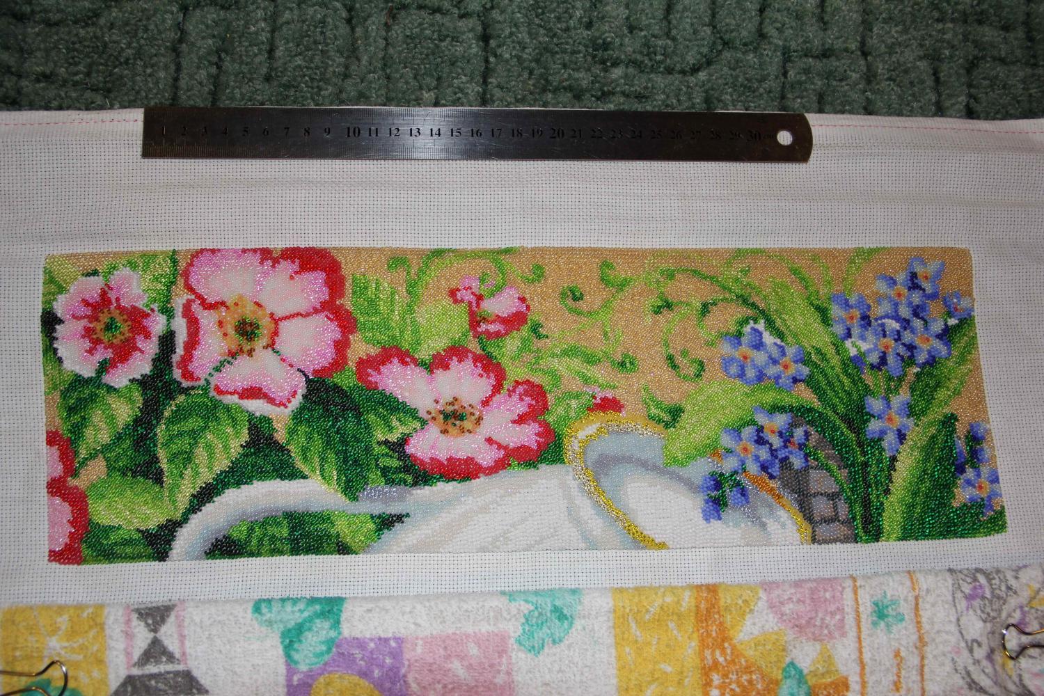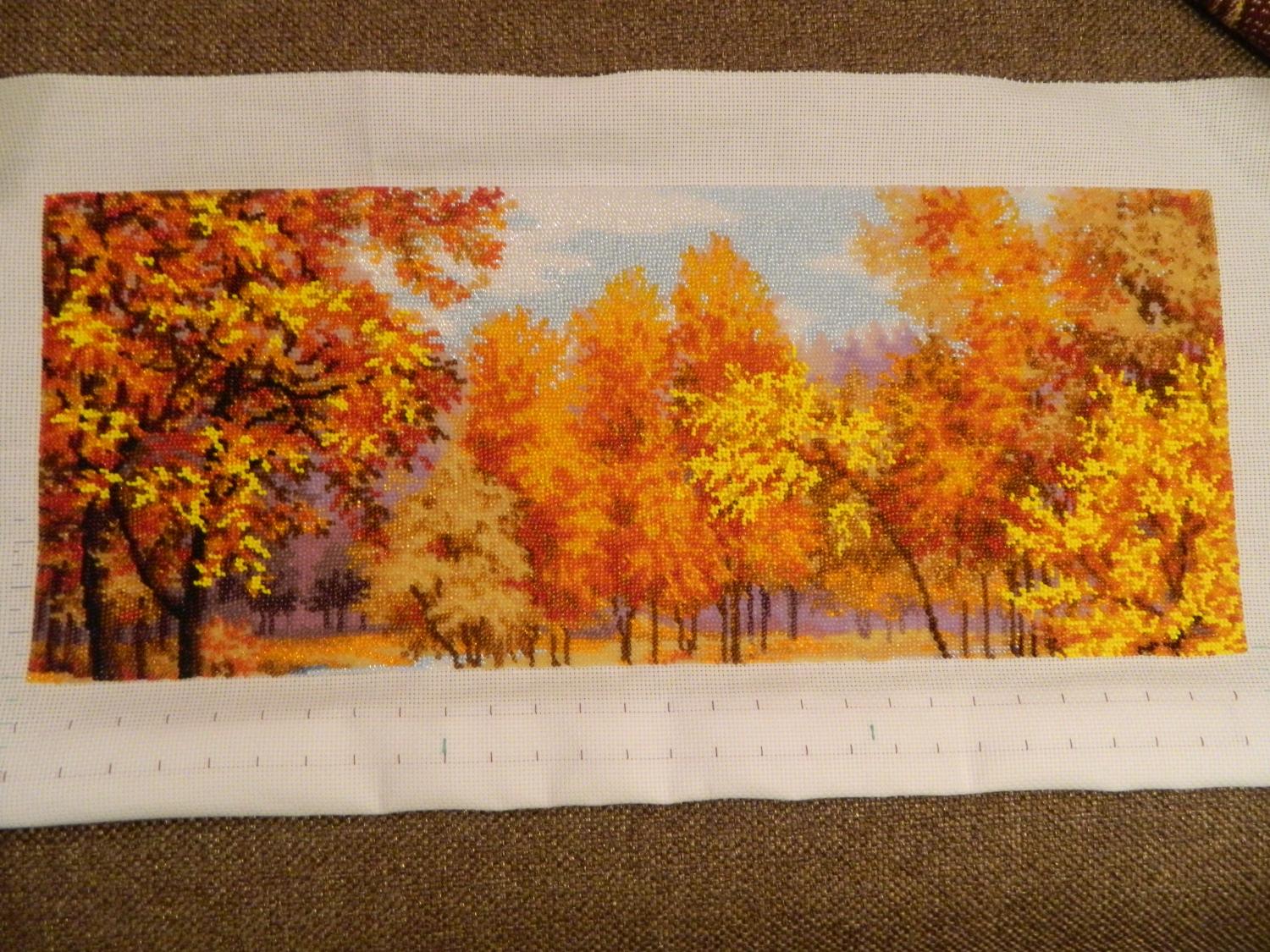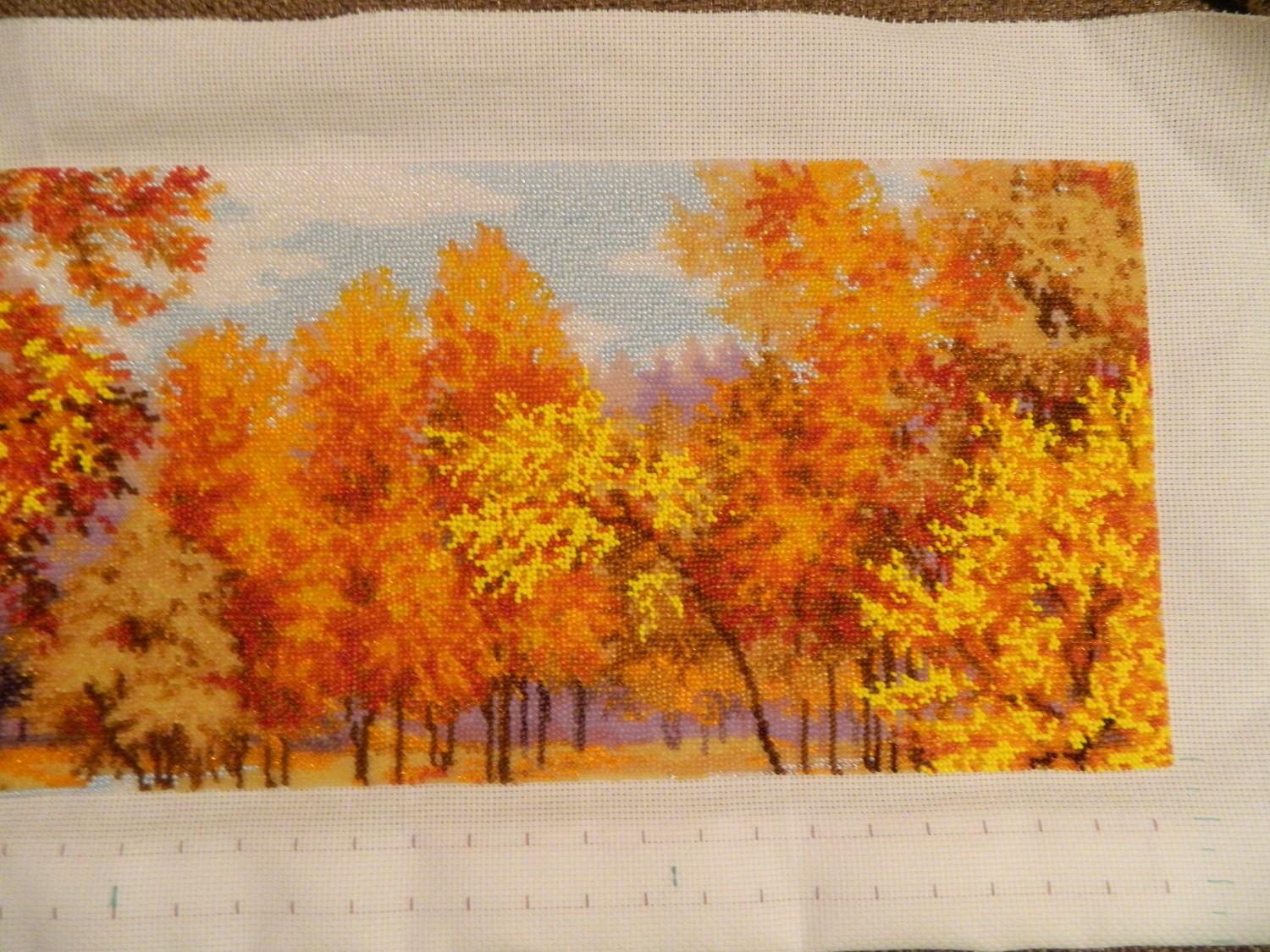 29 октября 2013 Девочки, всем огромное спасибо за поддержку и внимание Мечтала об этом наборе больше года и ура!!!! моя мечта сбылась. Вышивать начала в первых числах октября и впечатления от работы - просто море позитива!!! Бисер и канва отличного качества так ,что вышивается очень легко, тем более перед глазами обложка от Золотых ручек с фотографией готовой работы. Правда вышиваю я наверное в какой-то своей собственной манере с верху вниз и справа налево, а работу сворачиваю в трубочку сверху там где уже отшила и снизу -там где свободная канва, хотя поначалу пробовала и на станке, но это абсолютно не мешает моему процессу И вот что у меня получилось через 10 дней Ну а это на сегодняшний день буду следить за Вашим процессом! видела готовую работу на выставке-просто буйство красок! Удачи Поделиться сообщением Ссылка на сообщение