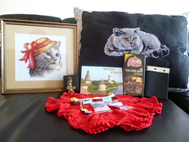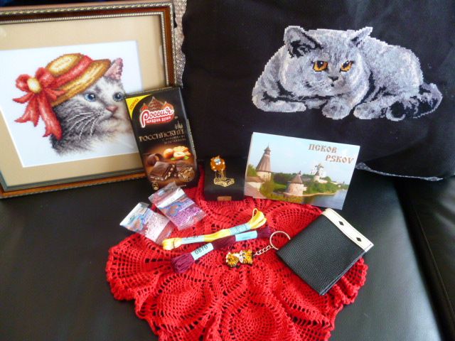 27 мая 2016 Уррааааа!!! Я не последняя!!! Это чудо, но ко мне уже пришла посылка от Марии (vodonika)!!!!!!! Только сегодня я ей написала, чтоб она не волновалась (девочки, я уже, конечно, догадалась, что я жду посылку от Марии), т.к. до меня бандероли идут не менее 8 недель, как... СЮРПРИЗ!!! Мария сделала такой рукодельный сюрприз, которого я просто даже представить не могла! Мой муж, который очень лояльно относится к вышивальным рукоделкам, был просто в восторге! Итак, начнем. Ко мне прилетел из далекой России, из исконно русского города Пскова, шикарный британский кот: Боюсь, что эта пухленькая, уютненькая подушка достанется моему мужу, т.к.он сильней и он у меня ее заберет!:)) Он уже положил на нее свой глаз! А эта дамочка в шляпке просто великолепна! Ее шерстка, хоть и под стеклом, но имеет такие натуральные цветовые переходы, что не сразу понятно, что картина вышита крестиком! Обе работы выполнены настолько аккуратно и со вкусом, что хочется сказать только одно: "Браво, Мария!" Ты просто молодец - проделала за такой небольшой промежуток времени, большой объем работы, да еще так идеально! Также ко мне приехали такие милые котики: И это еще не все коты! Хорошо завернутый в бумагу, а еще в связанную крючком салфетку, лежал дремлющий кот Он сразу нашел место на одной из наших книжных полок )) Конечно же, были и подарочки для вышивки : два моточка ниток Гамма (Гаммой я еще не вышивала!) и два пакетика с бисером. Еще салфетка связанная крючком (Мария, твоих рук дело?): Ну, и куда же без сладостей и сувенира из родного города? Шоколад с орешками, набор красивых открыток с Псковом и маленький телефонный блокнотик (кстати, нужная вещь! Если вдруг накроется телефон, блокнотик сохранит все нужные номера телефонов!) И весь сюрприз полностью: Мария, спасибо тебе огромное! Ты просто супер-мастерица! Твои коты меня покорили! Tris, Муняша, belyasik и 27 других сказали спасибо Поделиться сообщением Ссылка на сообщение